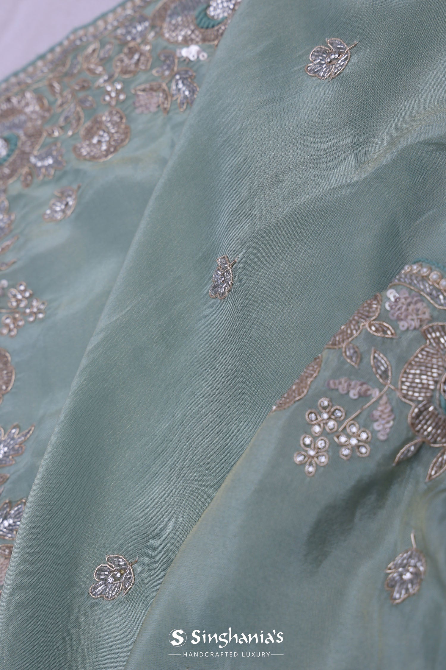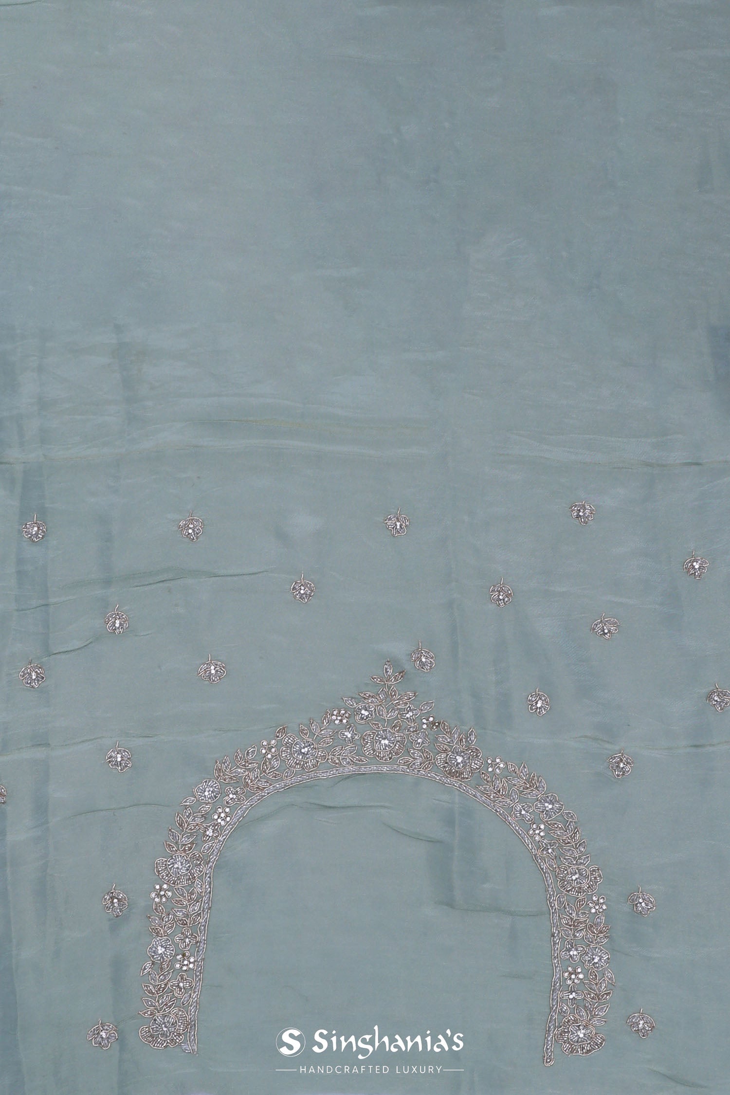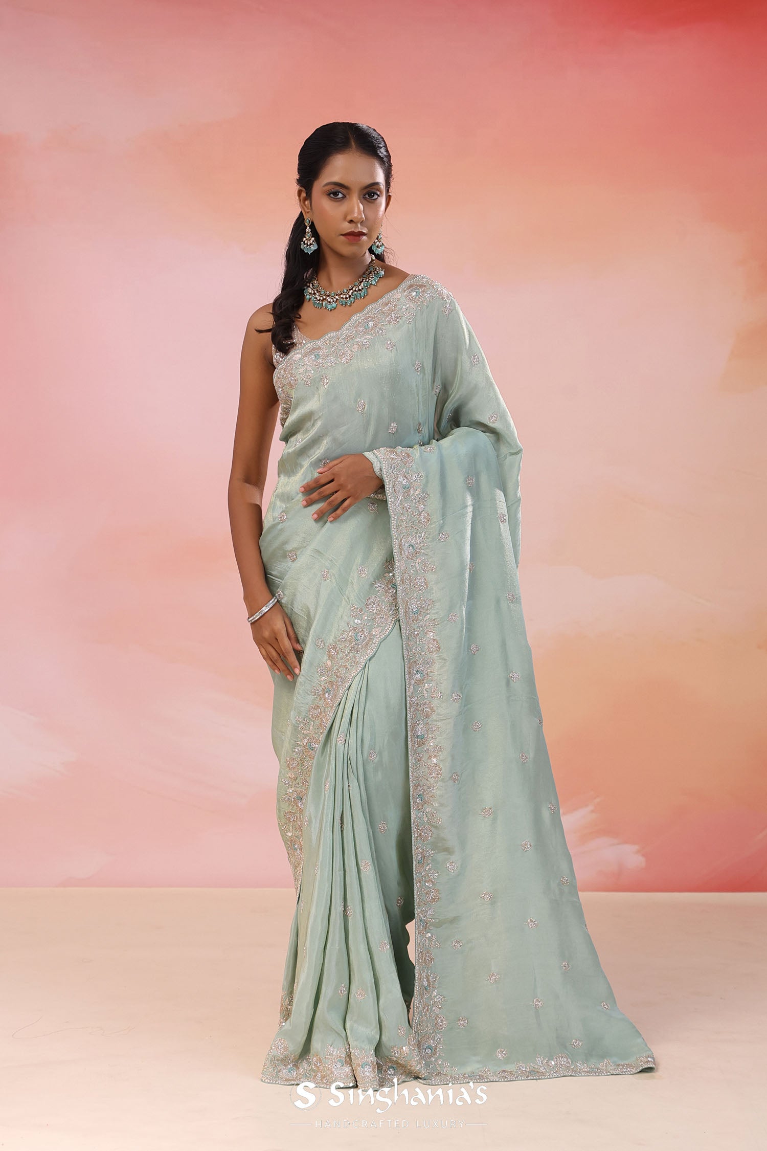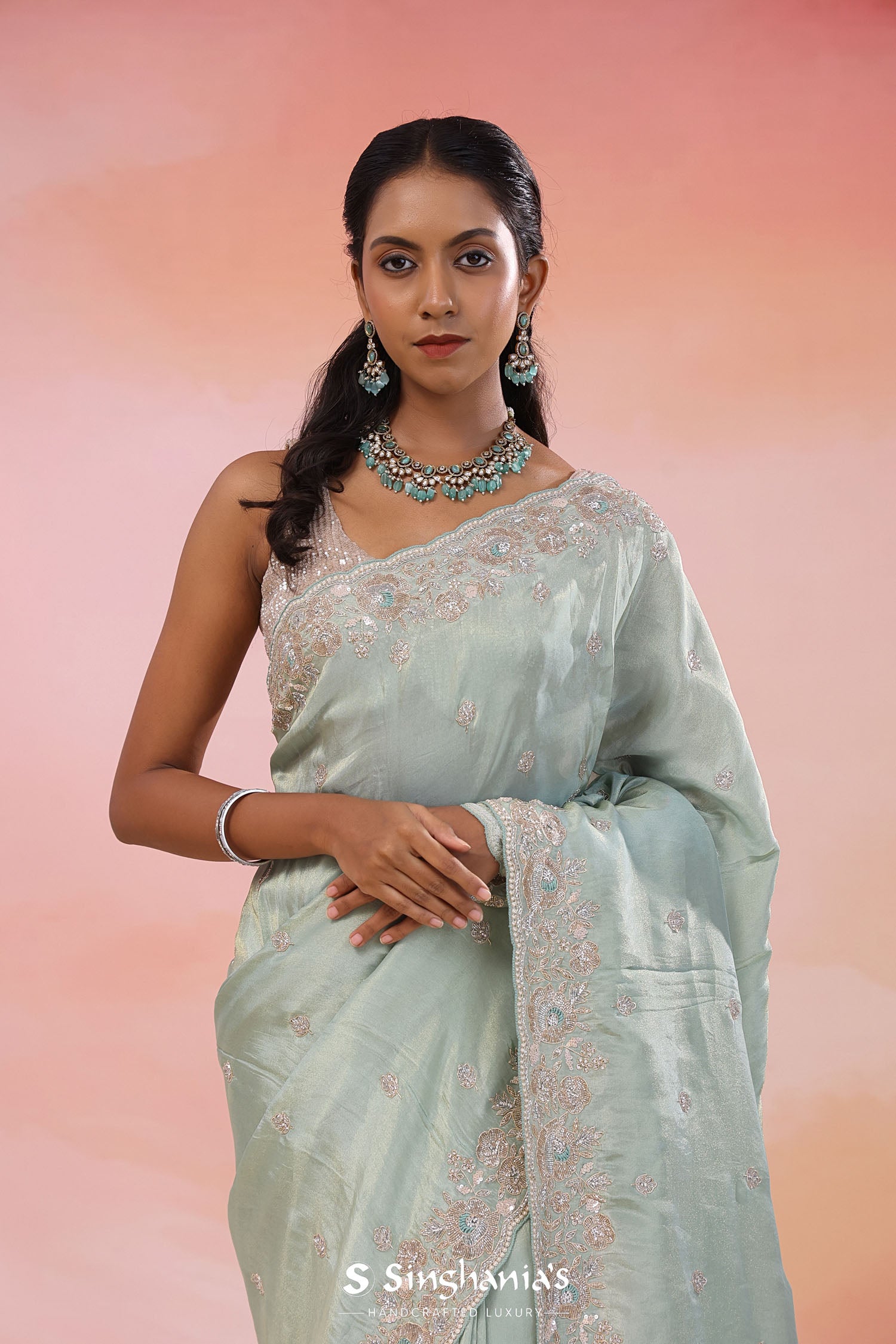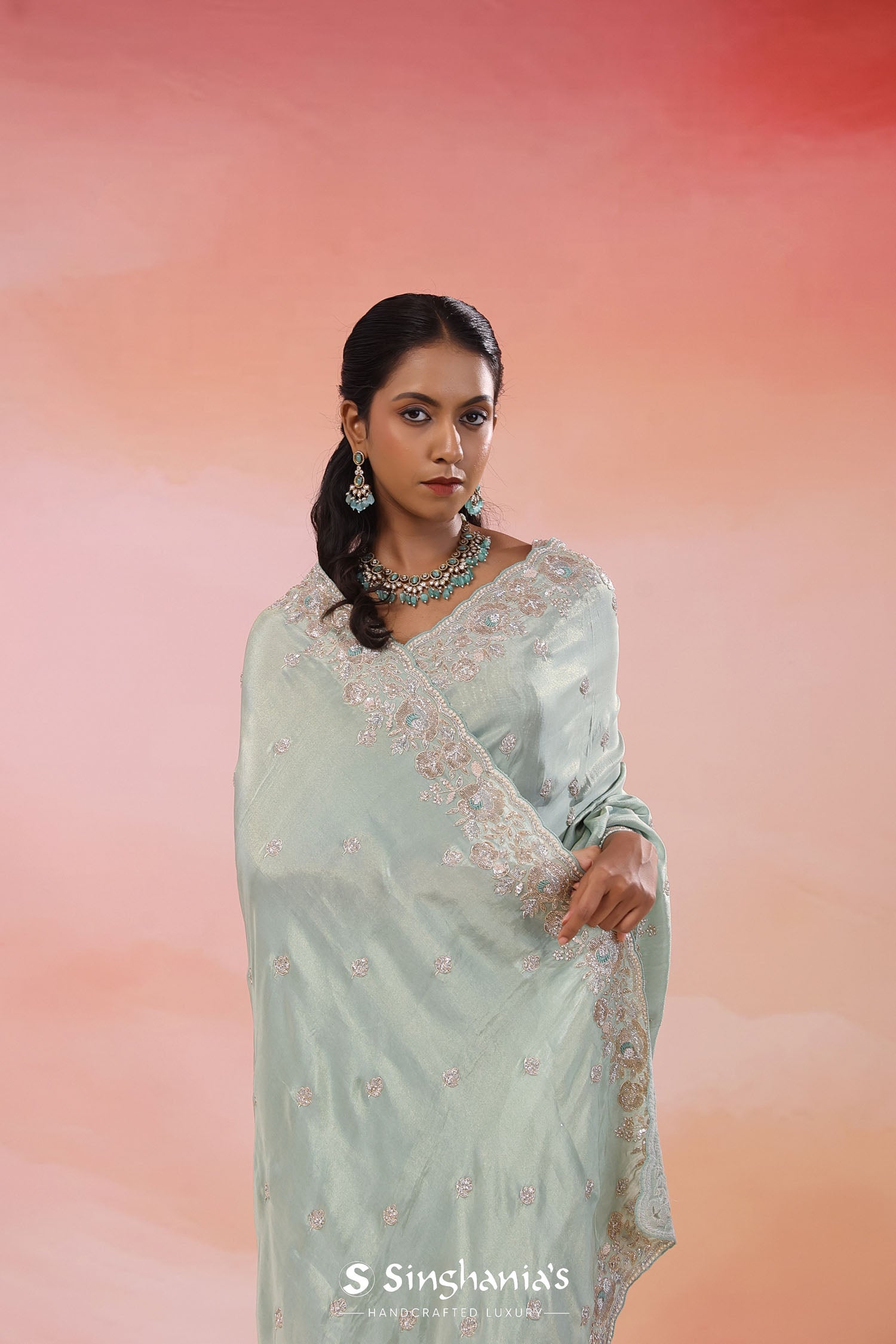 The butti's formed with zardosi and beads work scattered on the body of Regent gray georgette tissue saree complemented with scallop border adorned with sequins, beads, zardosi and pearls work