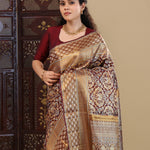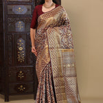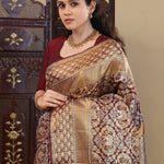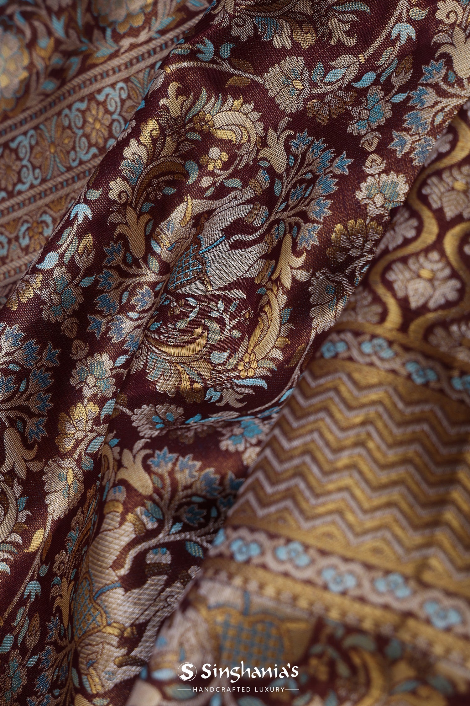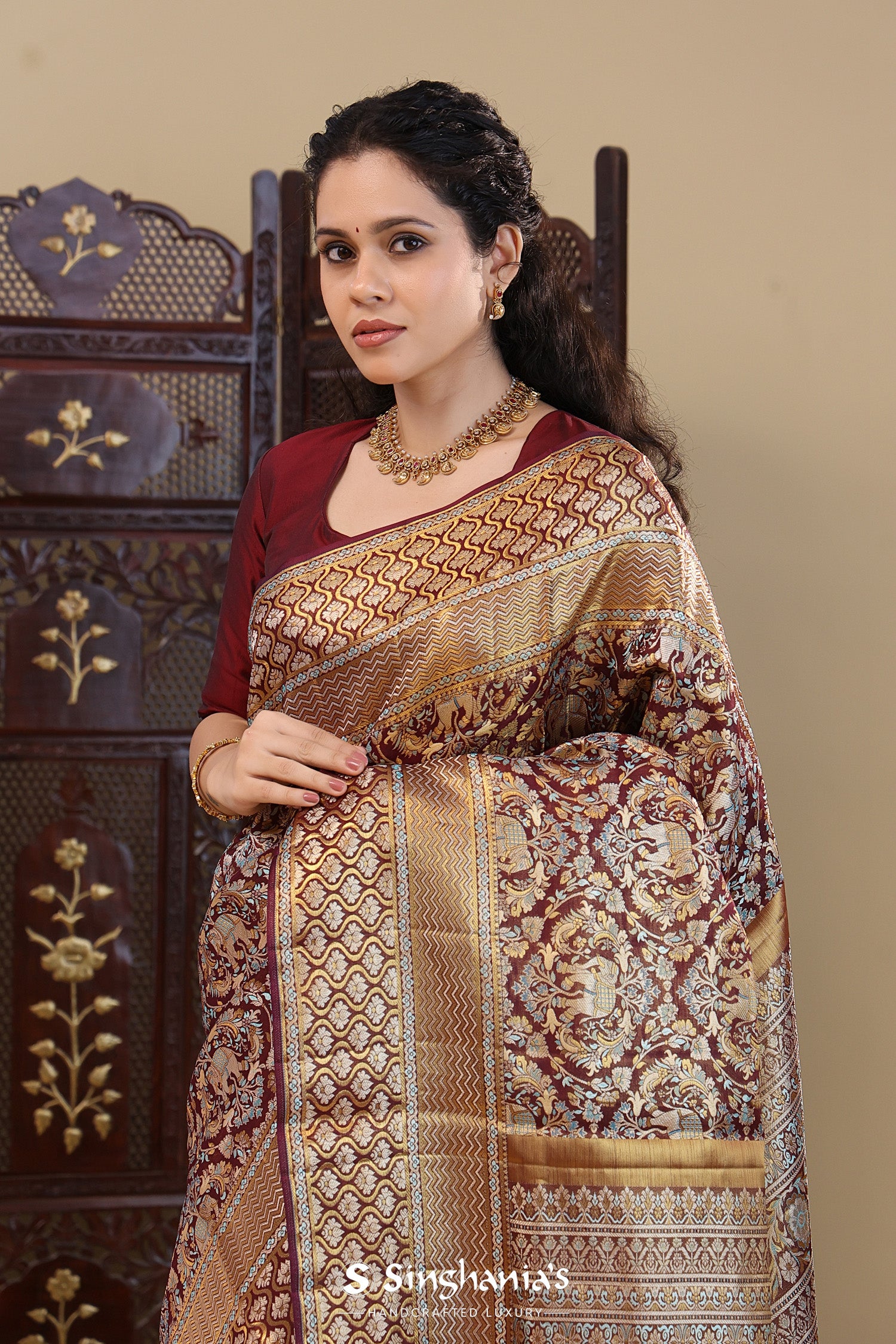 The rich brown kanjivaram silk saree with floral and elephant dual-tone zari weave for a gorgeous look.