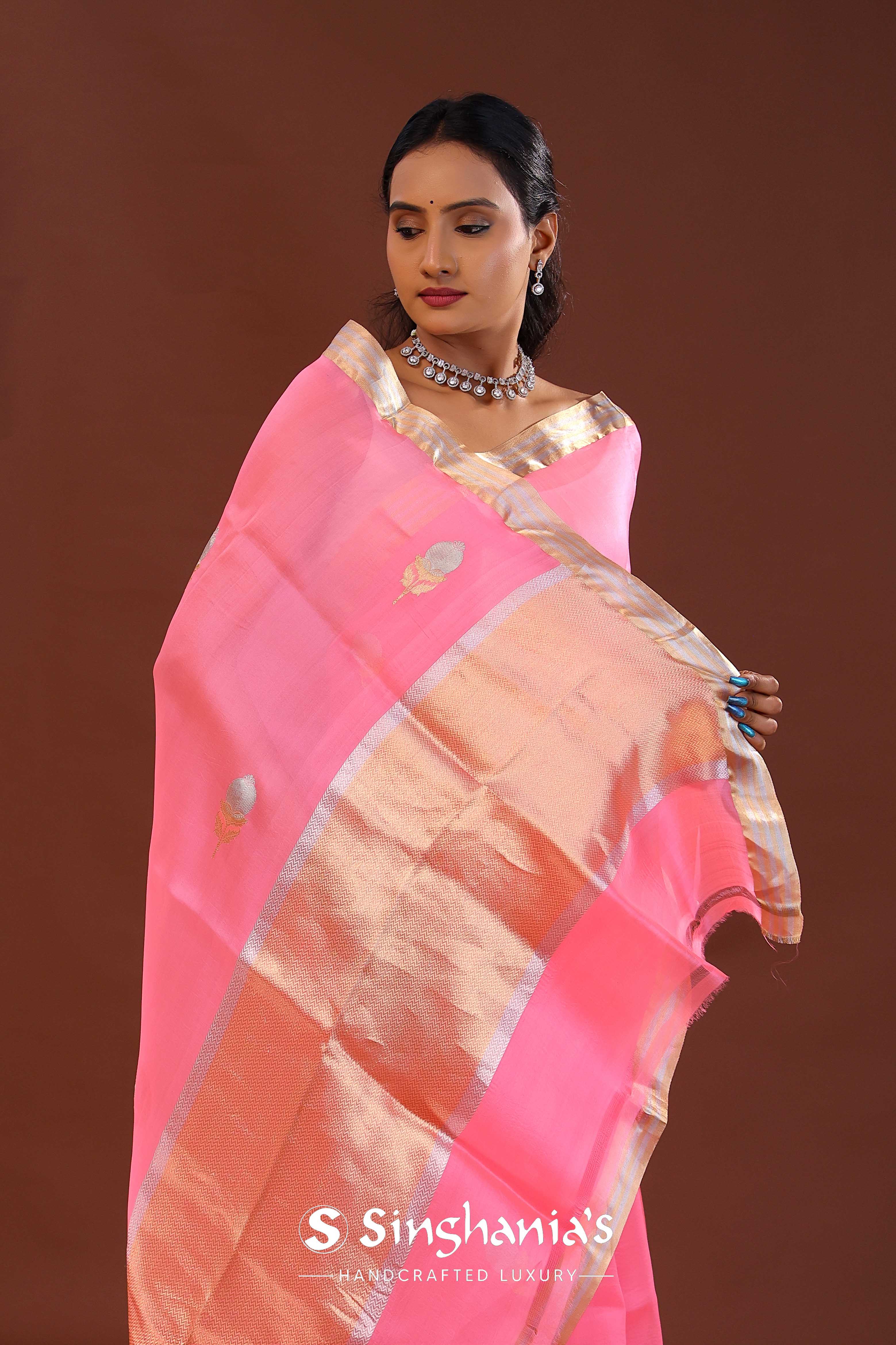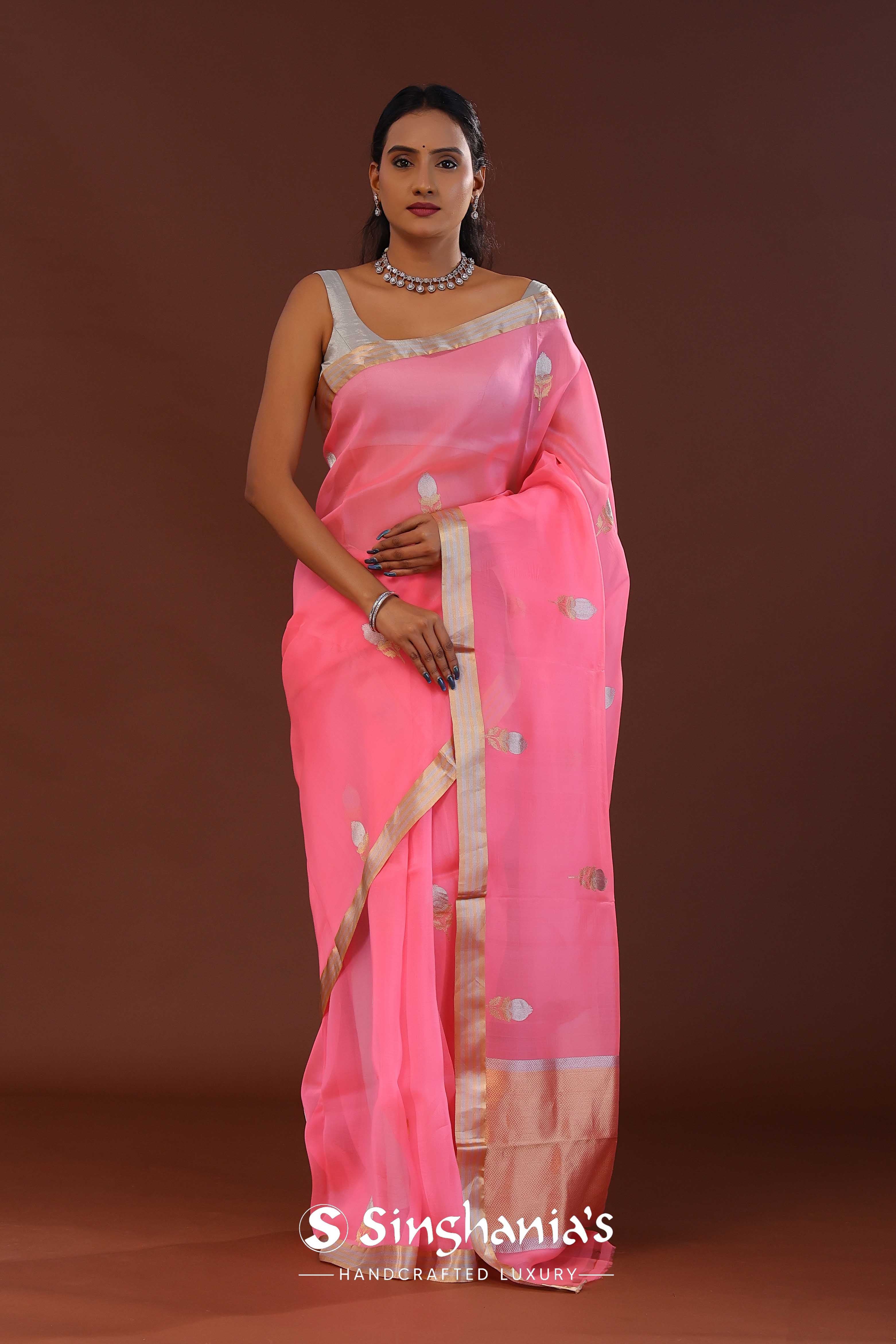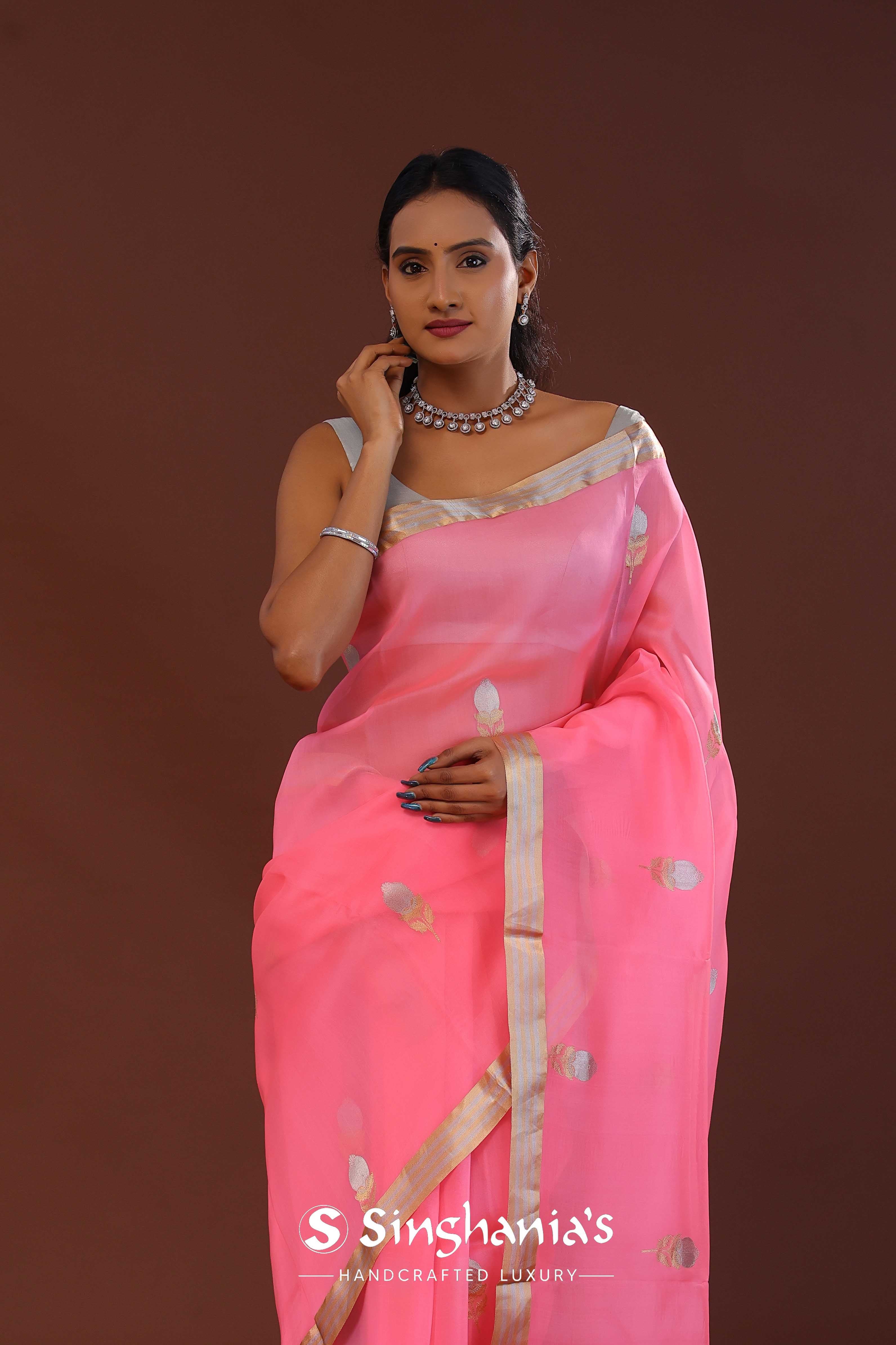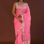 This Rose pink organza banarasi saree reflects grace by the simple floral butti's with gold and silver and small contrast border, which adds extra charm and elegence to the overall look of the saree