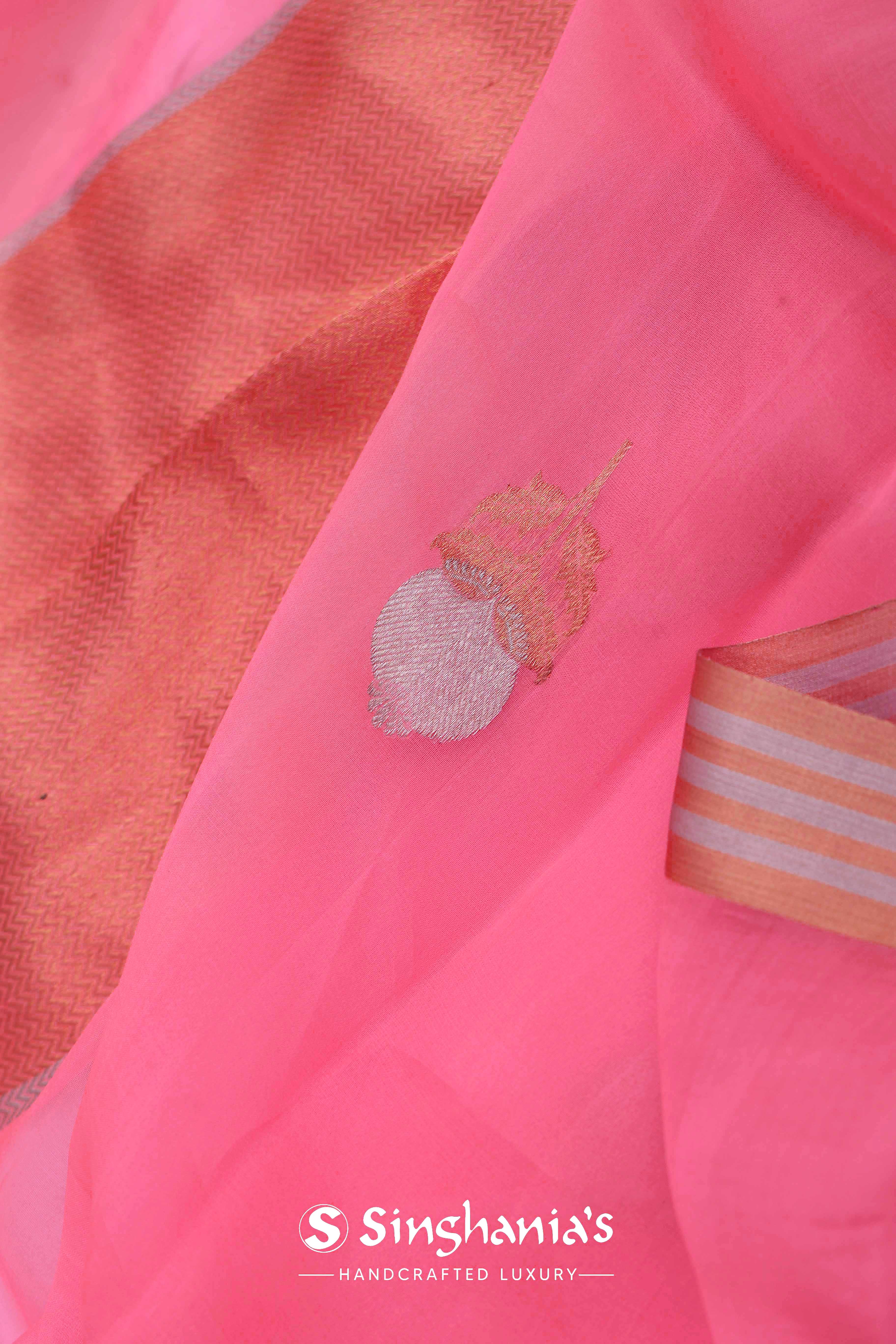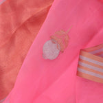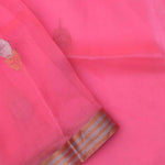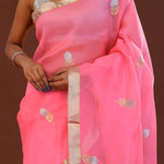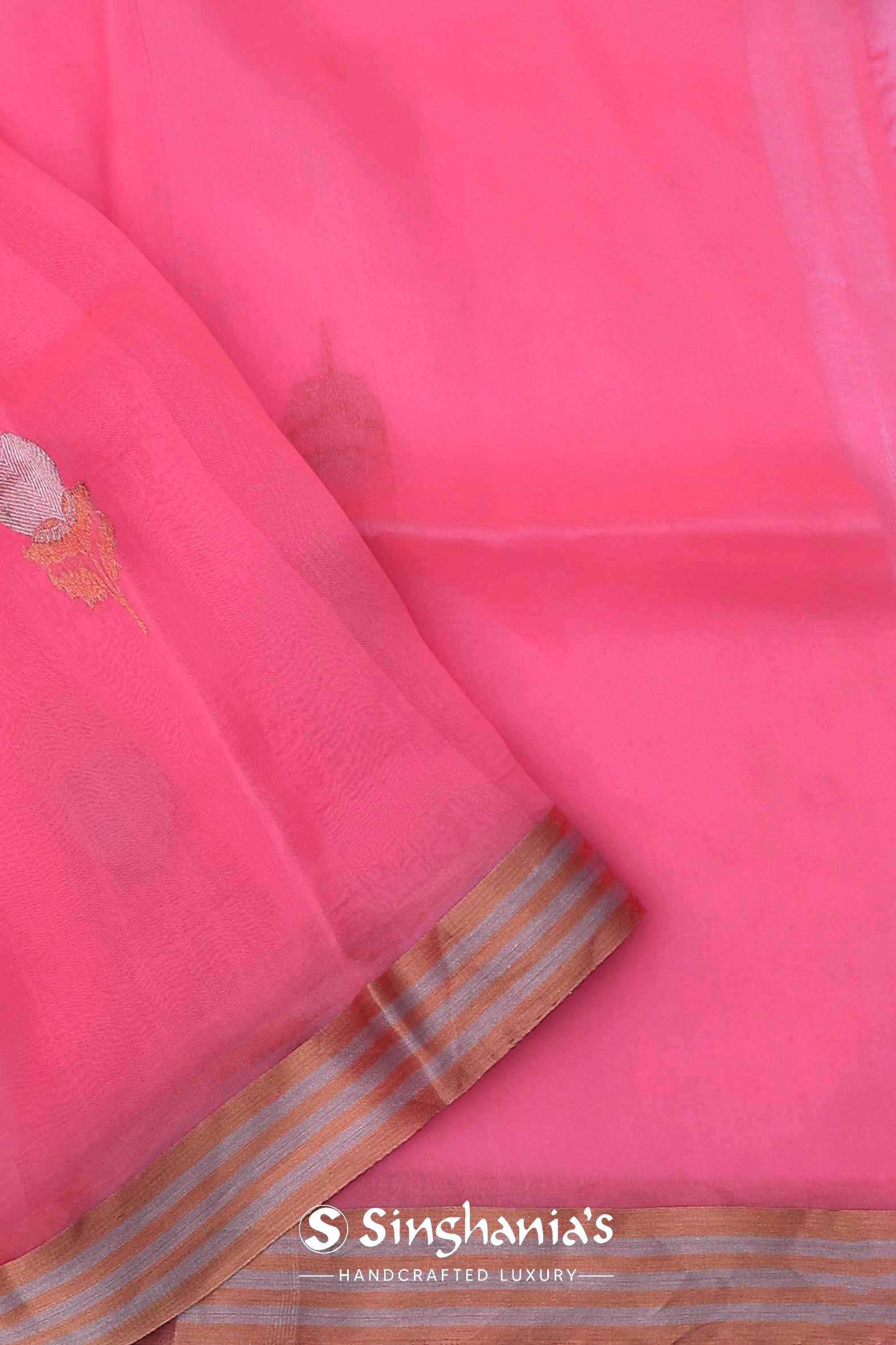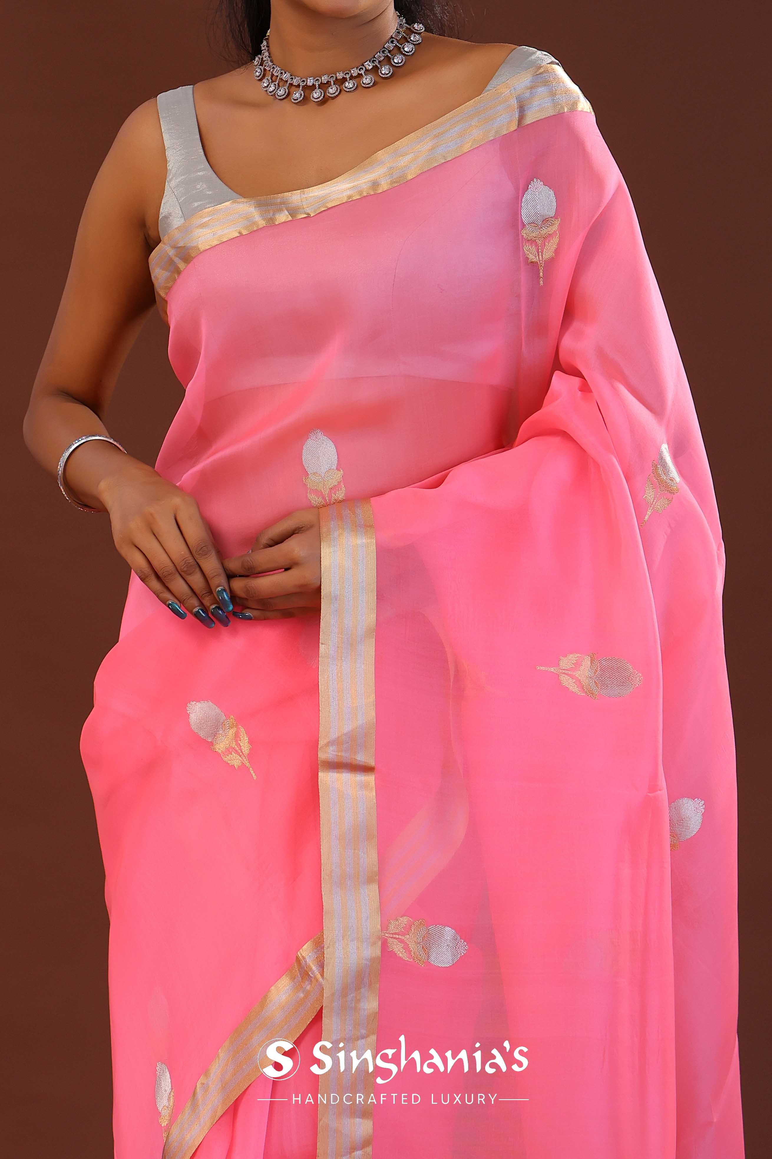 This Rose pink organza banarasi saree reflects grace by the simple floral butti's with gold and silver and small contrast border, which adds extra charm and elegence to the overall look of the saree