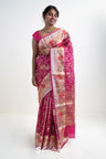 A rouge pink banarasi kota silk saree features gold and silver zari woven floral butti-butta and checks design. Accentuated with a colourful floral-munia design, big border and pallu, adding to its intricate beauty. Suitable for festive or wedding events.