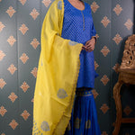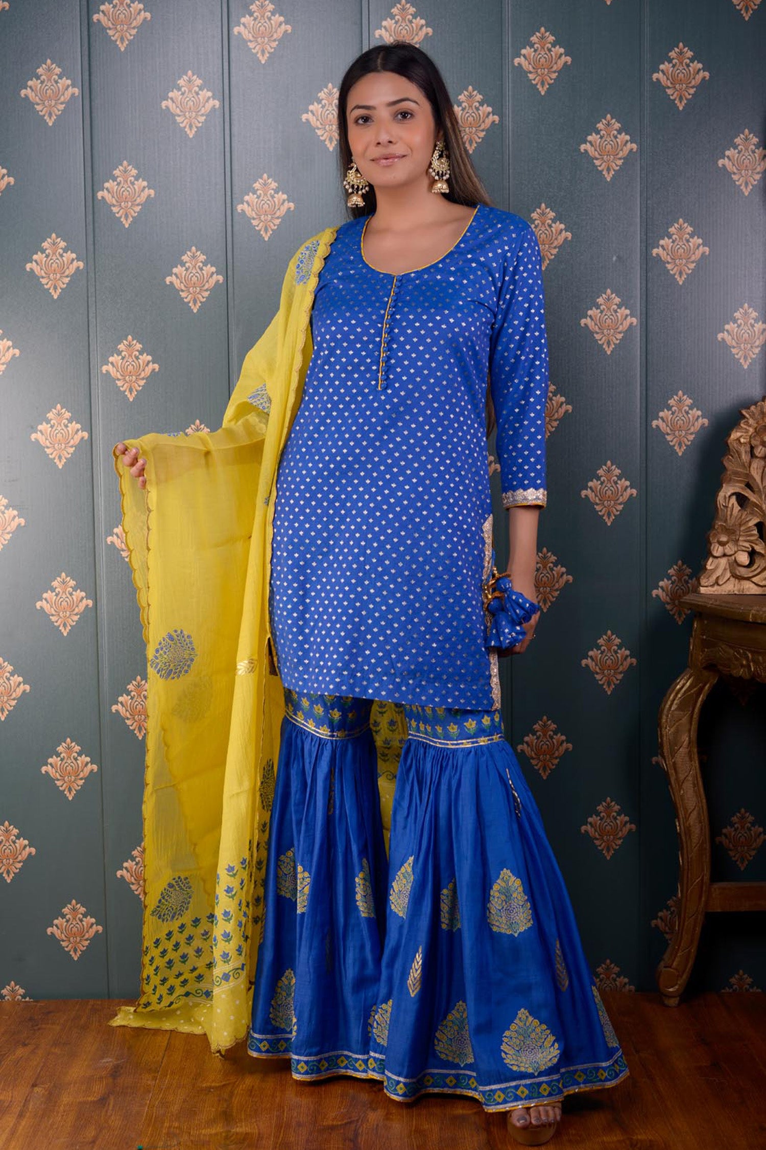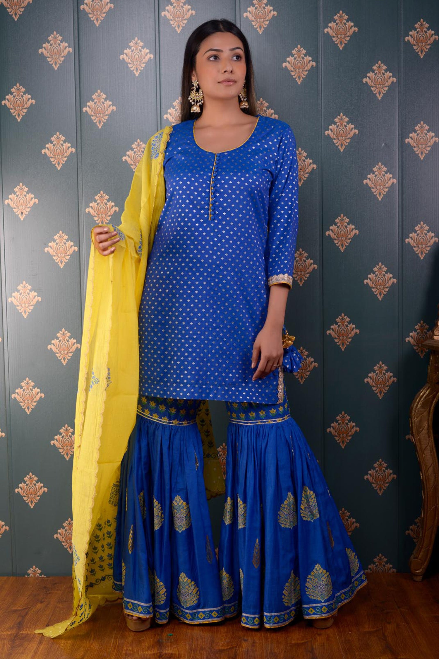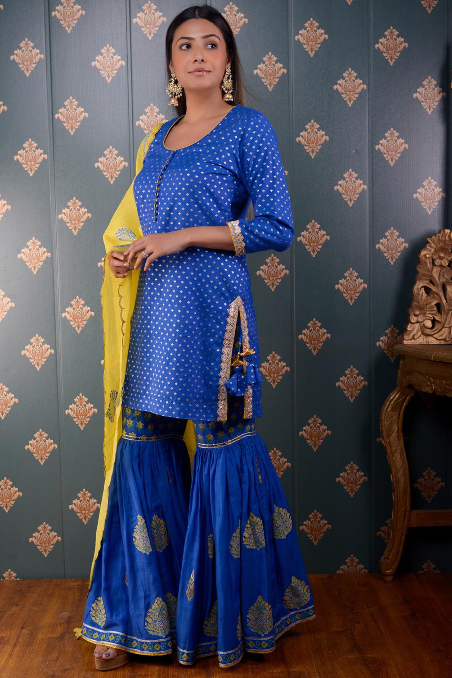 The Gharara set includes Royal Blue Banarasi Butti Chandary With Foil Print Kurta ,Pant And Dupatta With Lace Finish for a combination of elegance with stylish look .