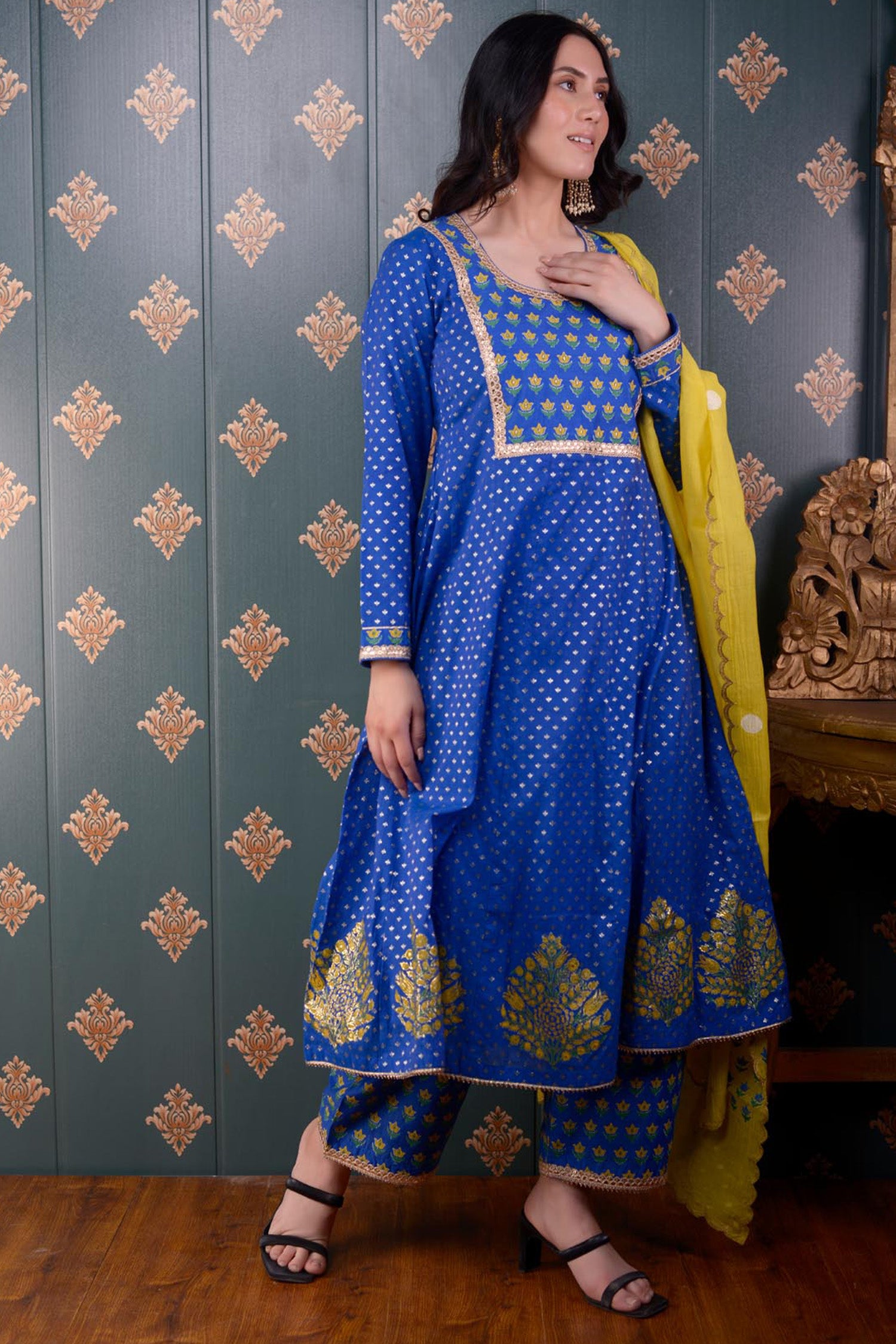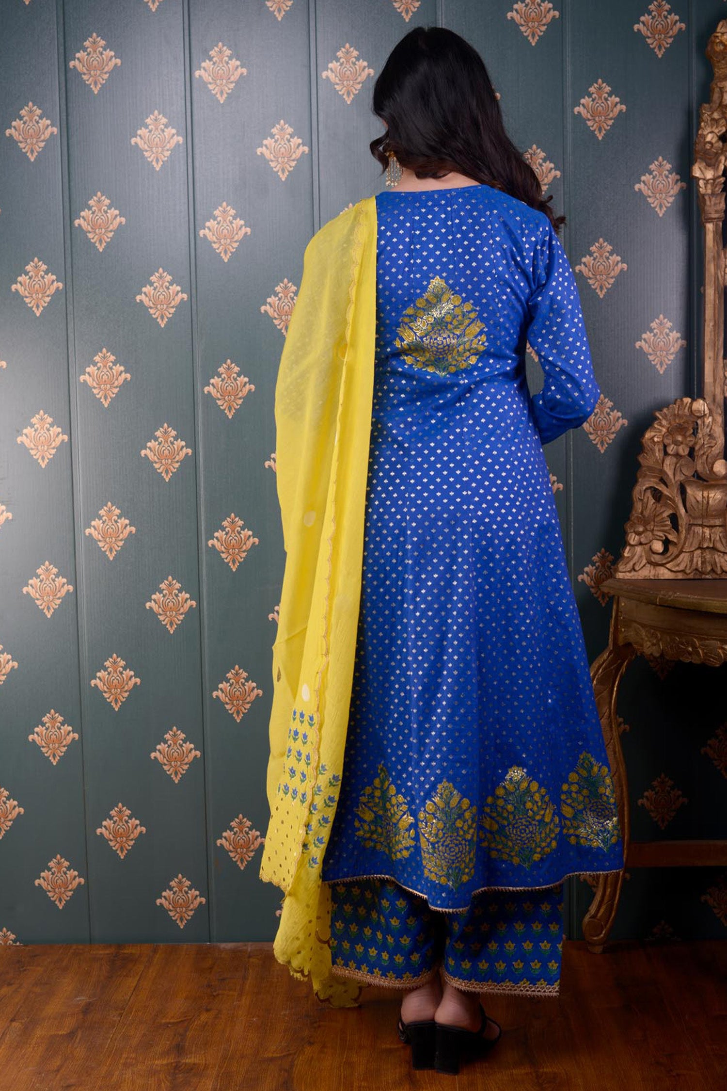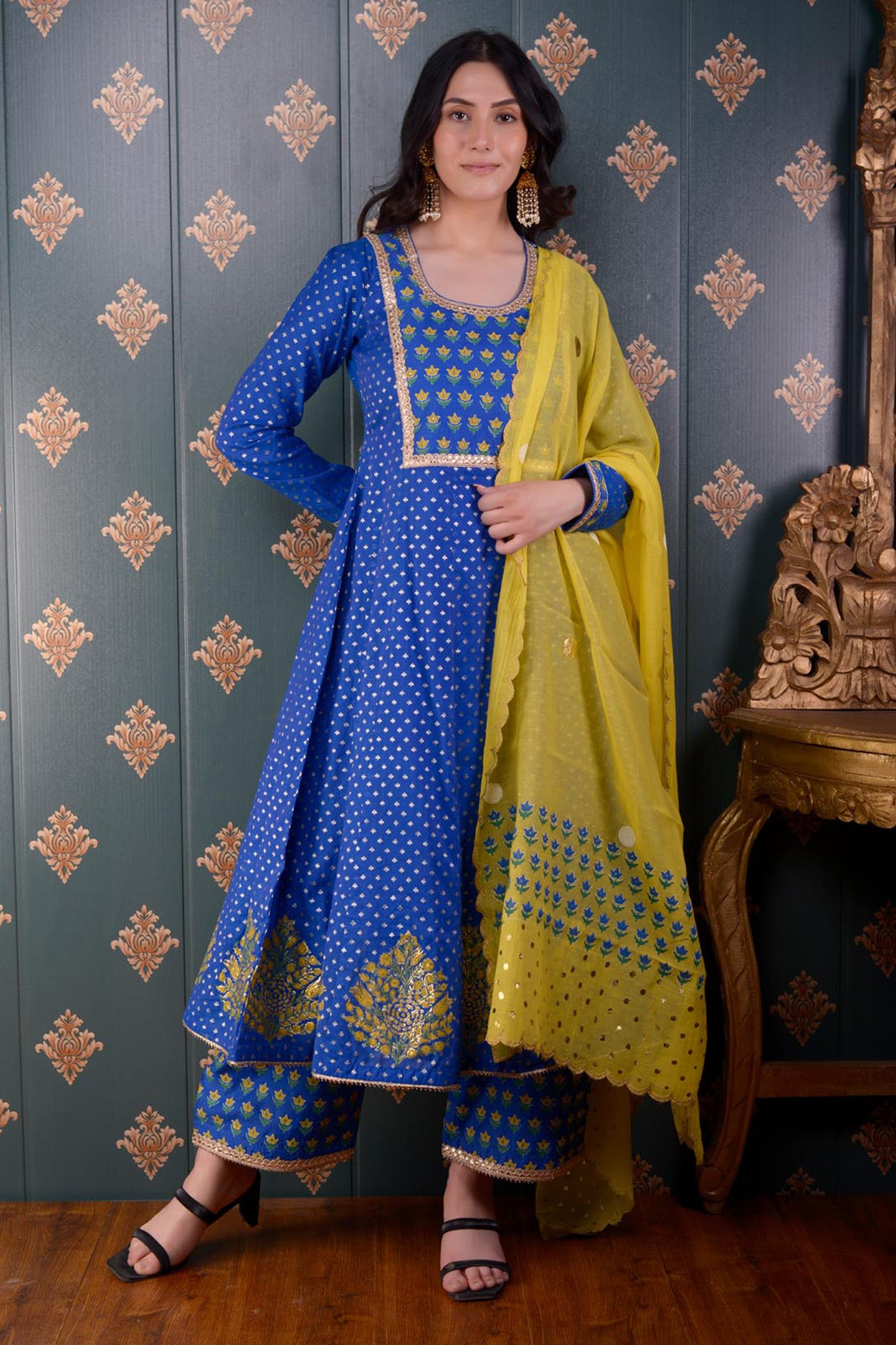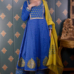 Royal Blue Banarasi Butti Chandary With Block Print Kurti Set includes Royal Blue Banarasi Butti Chandary With Foil Print Kurta ,Pant And Dupatta With Lace Finish for a beautiful and elegant look.
