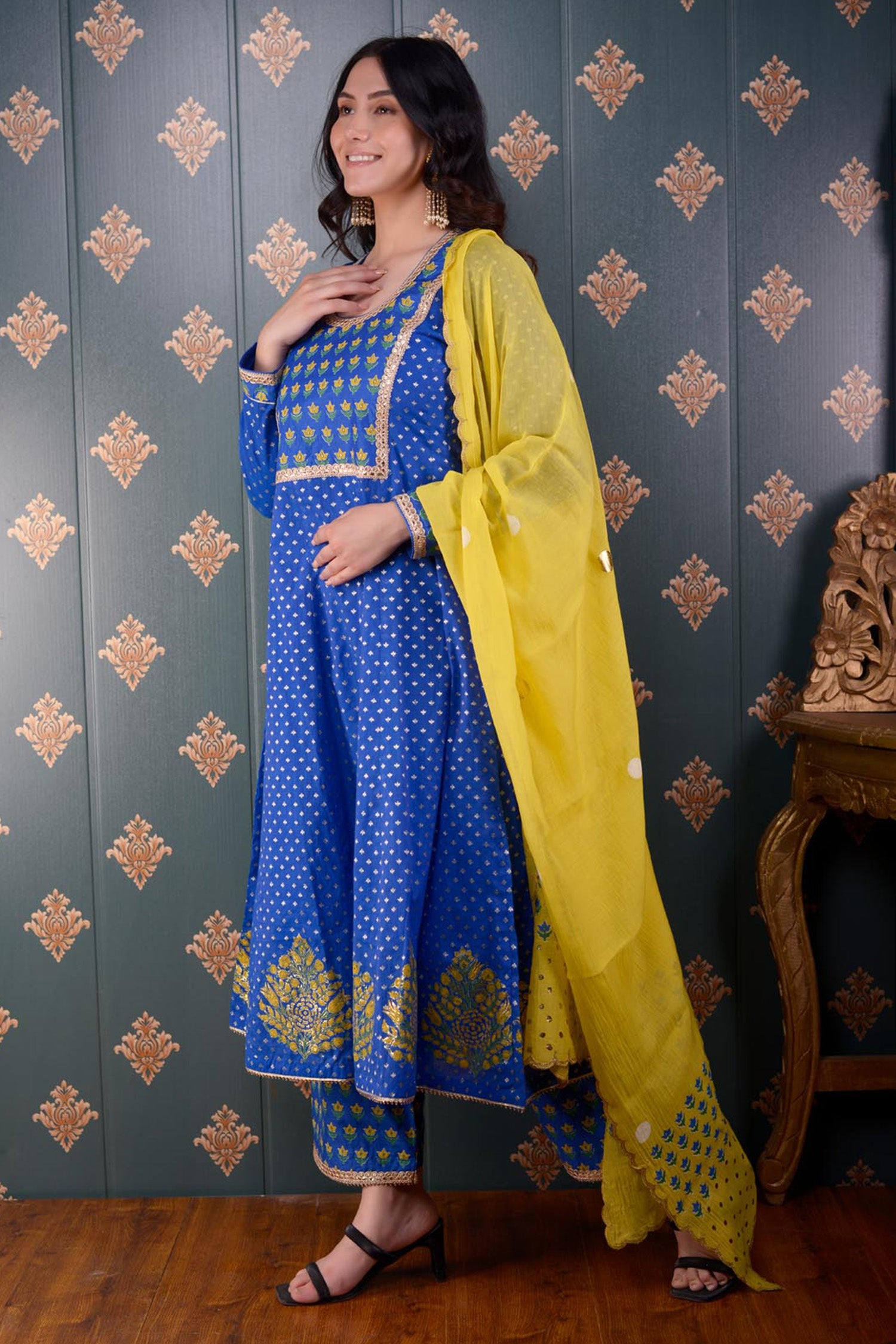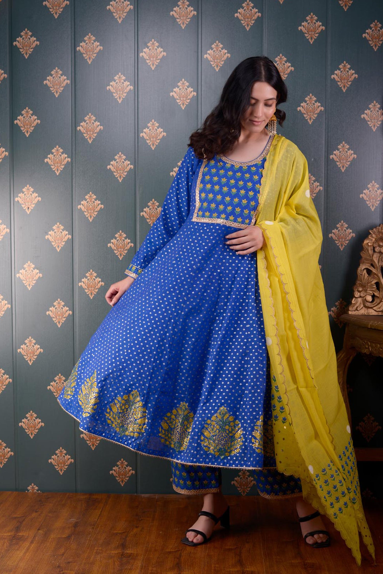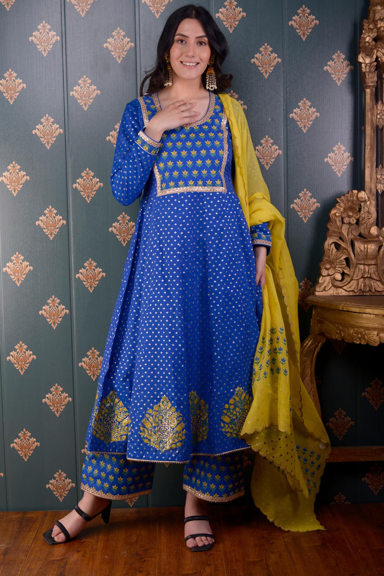 Royal Blue Banarasi Butti Chandary With Block Print Kurti Set includes Royal Blue Banarasi Butti Chandary With Foil Print Kurta ,Pant And Dupatta With Lace Finish for a beautiful and elegant look.
