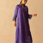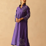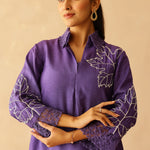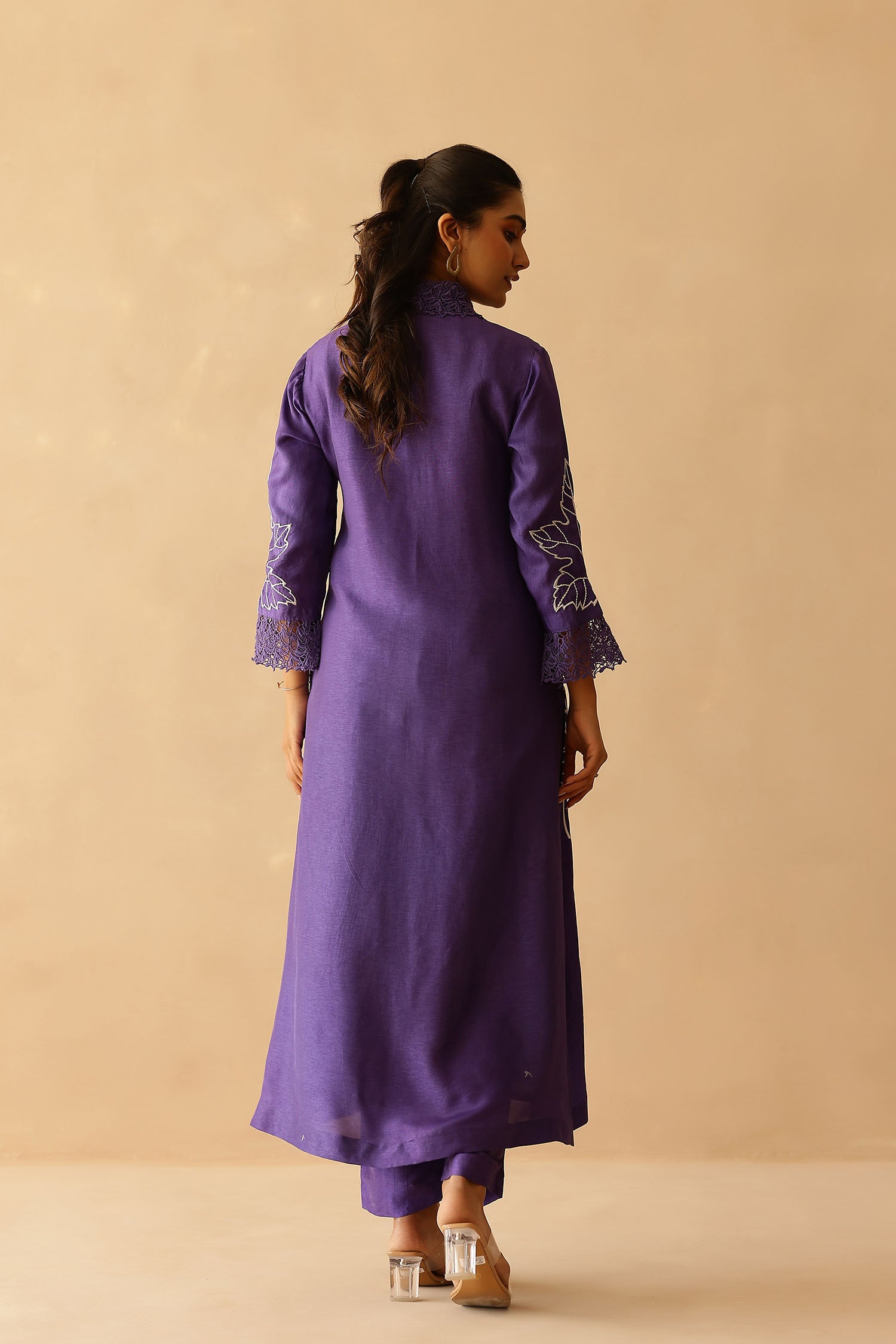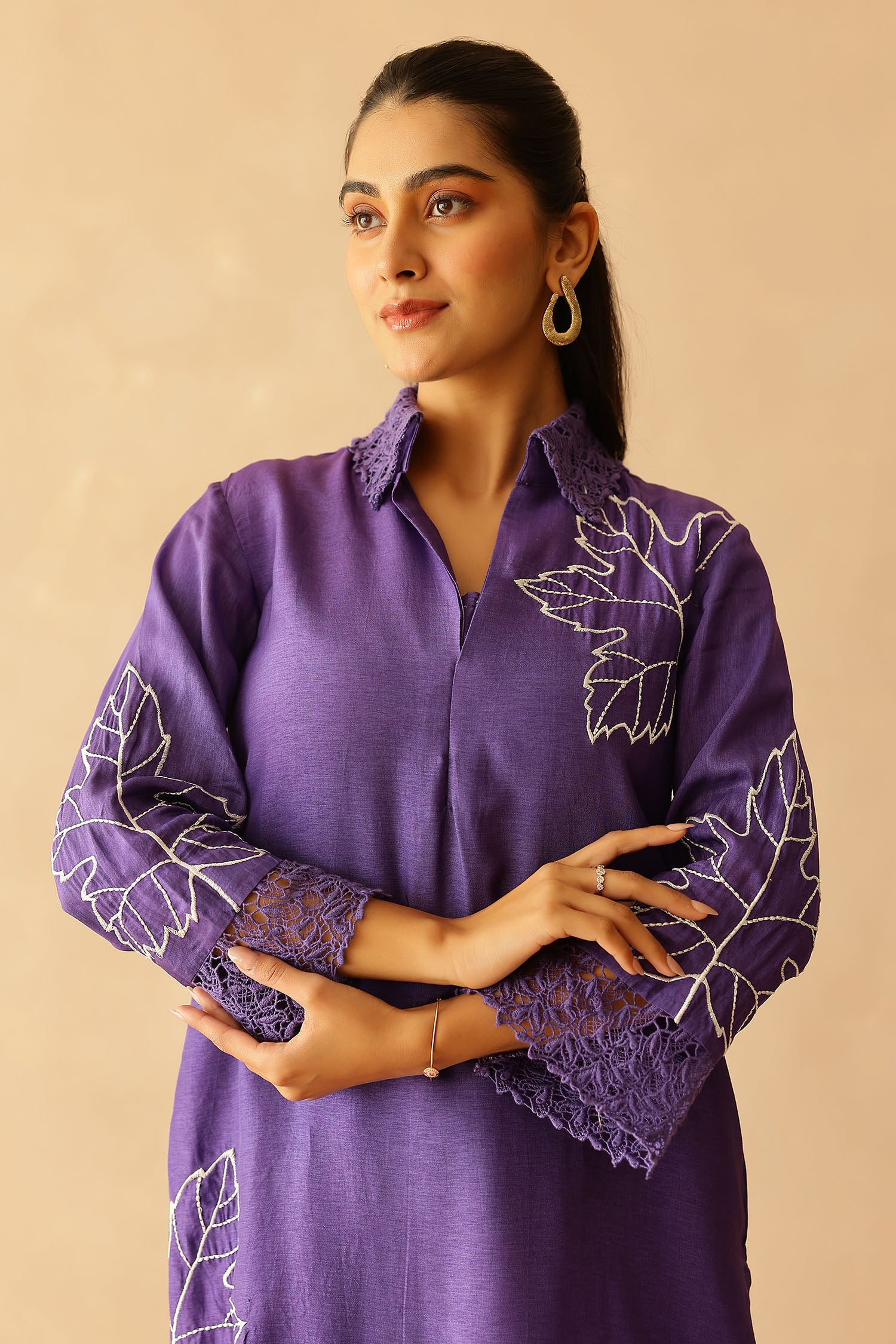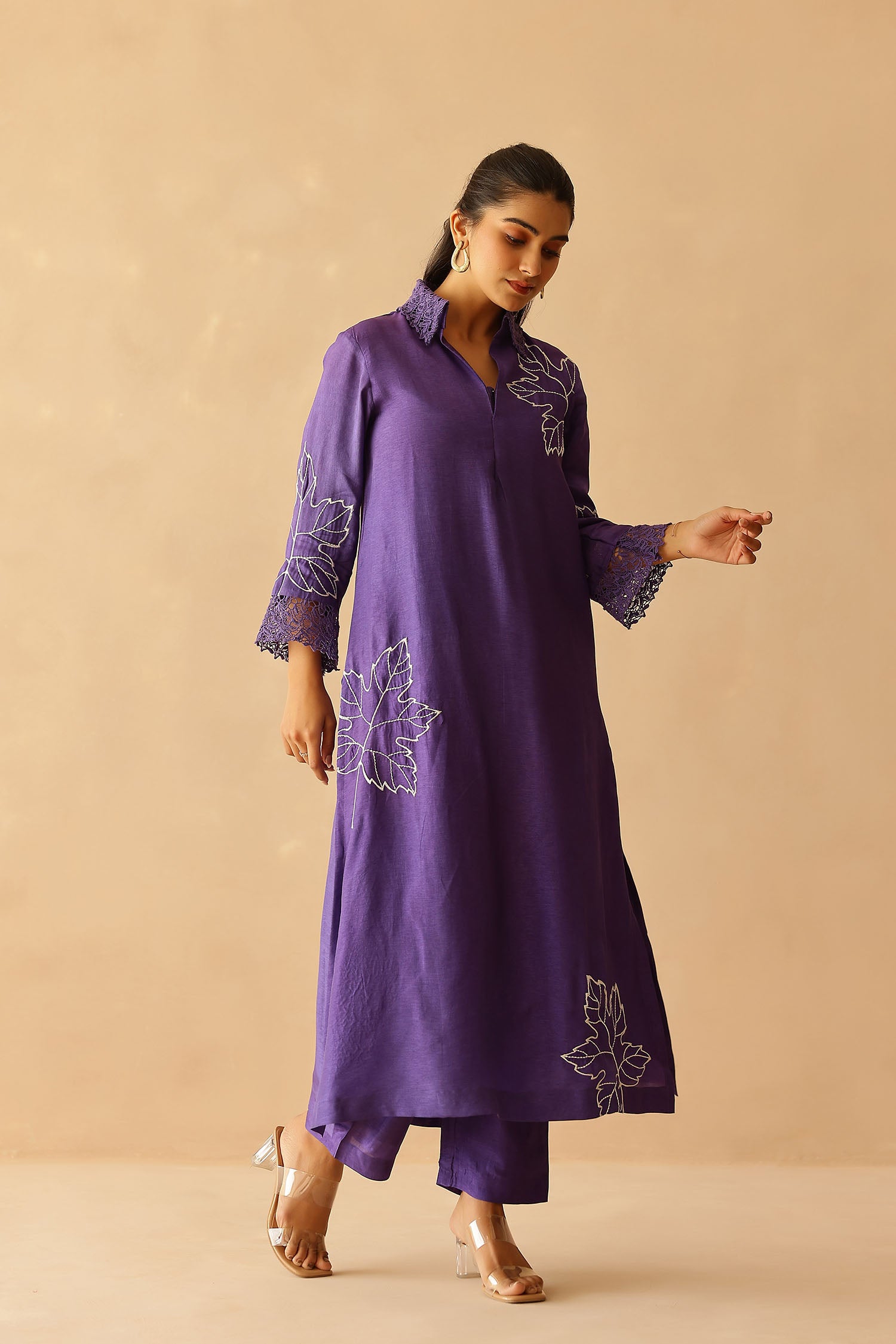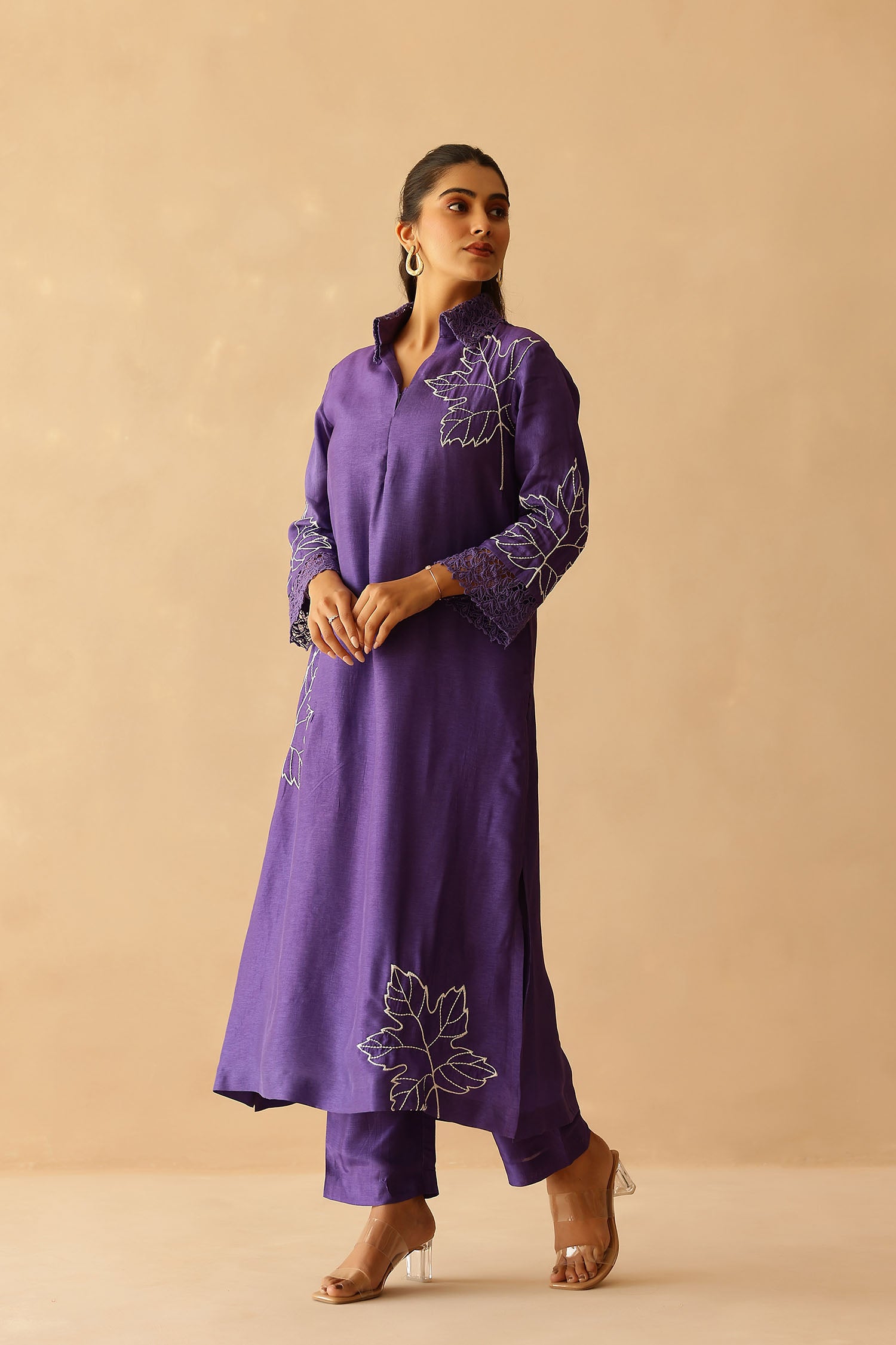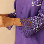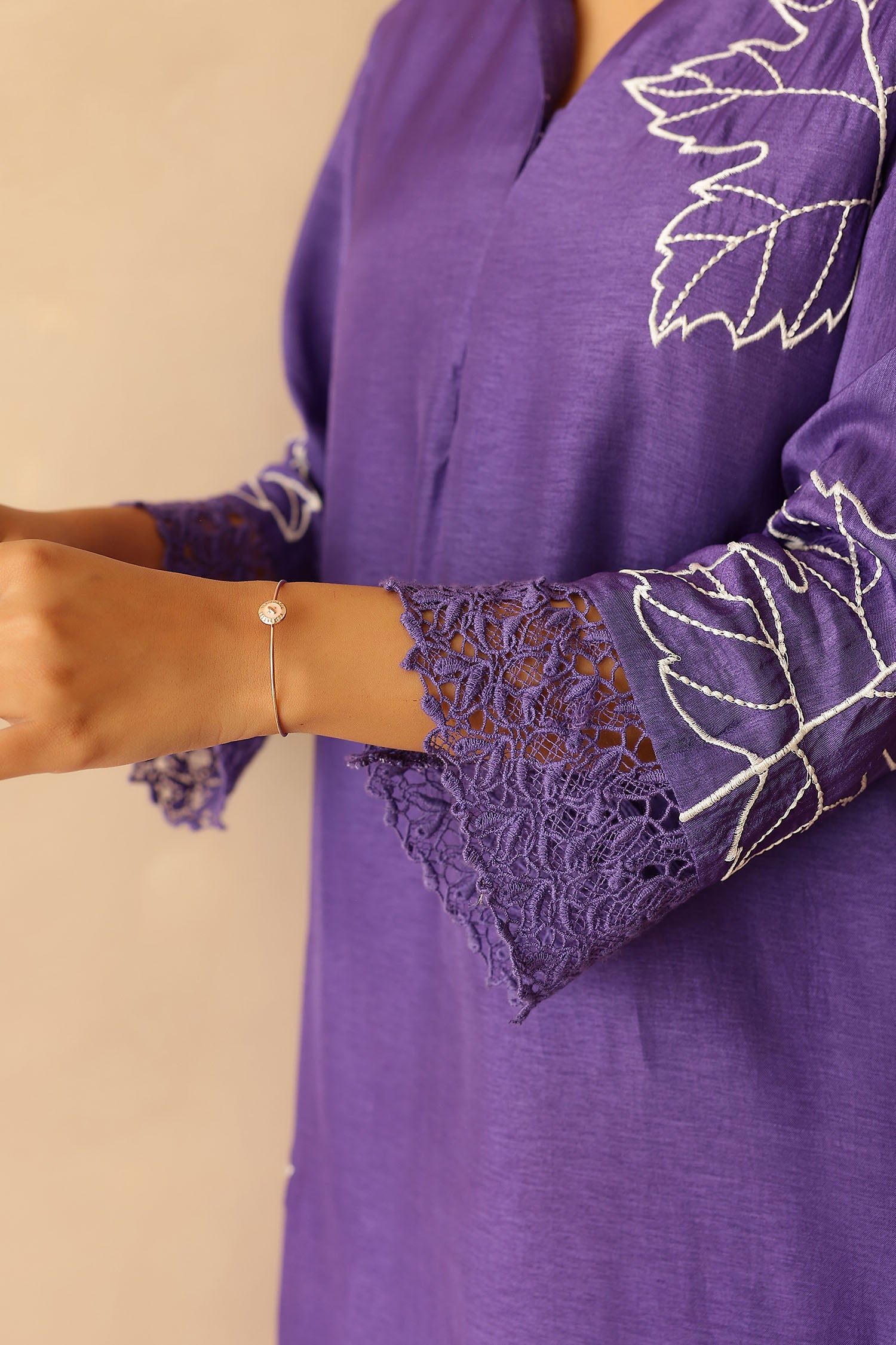 The royal purple russian silk embroidered thread work kurti set with matching pant for a perfect blend of tradition with style for an elegant look.