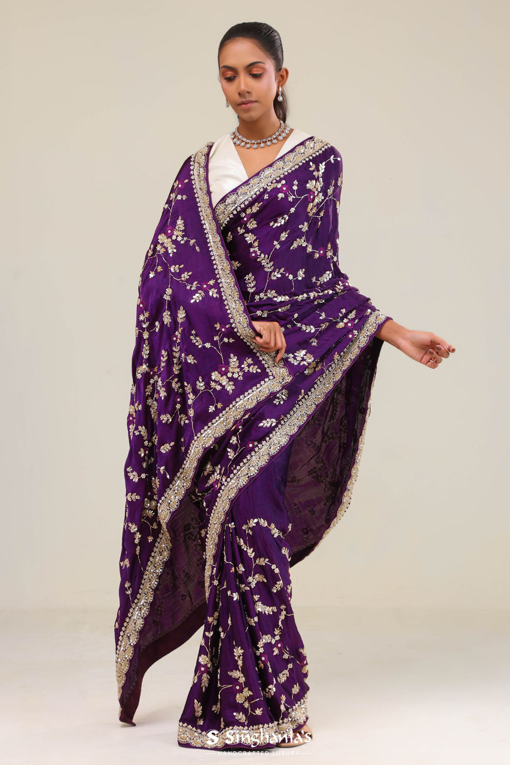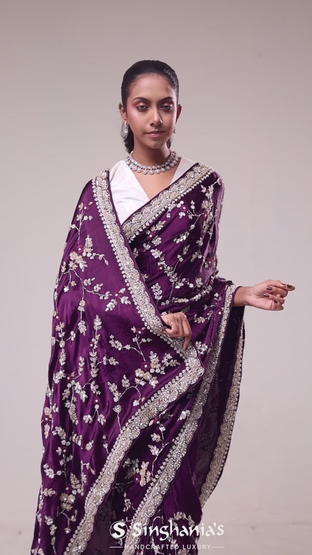 A richly royal purple saree with a silk base, which features floral jaal embroidered pattern. Added with intricately embroidered border and pallu, crafted with sequins, stones and glass beads. It’s an excellent choice for festivals, receptions and grand celebrations.