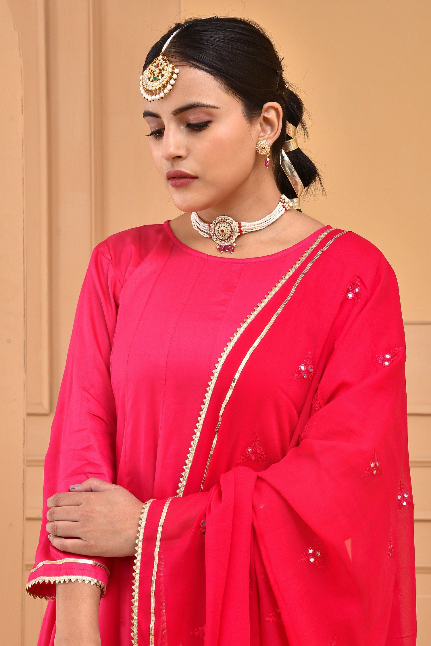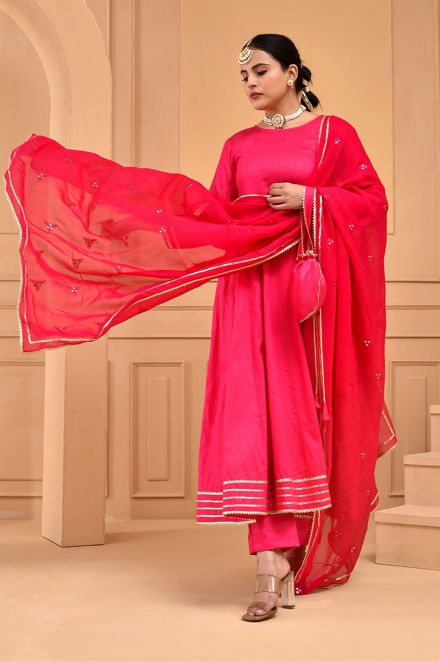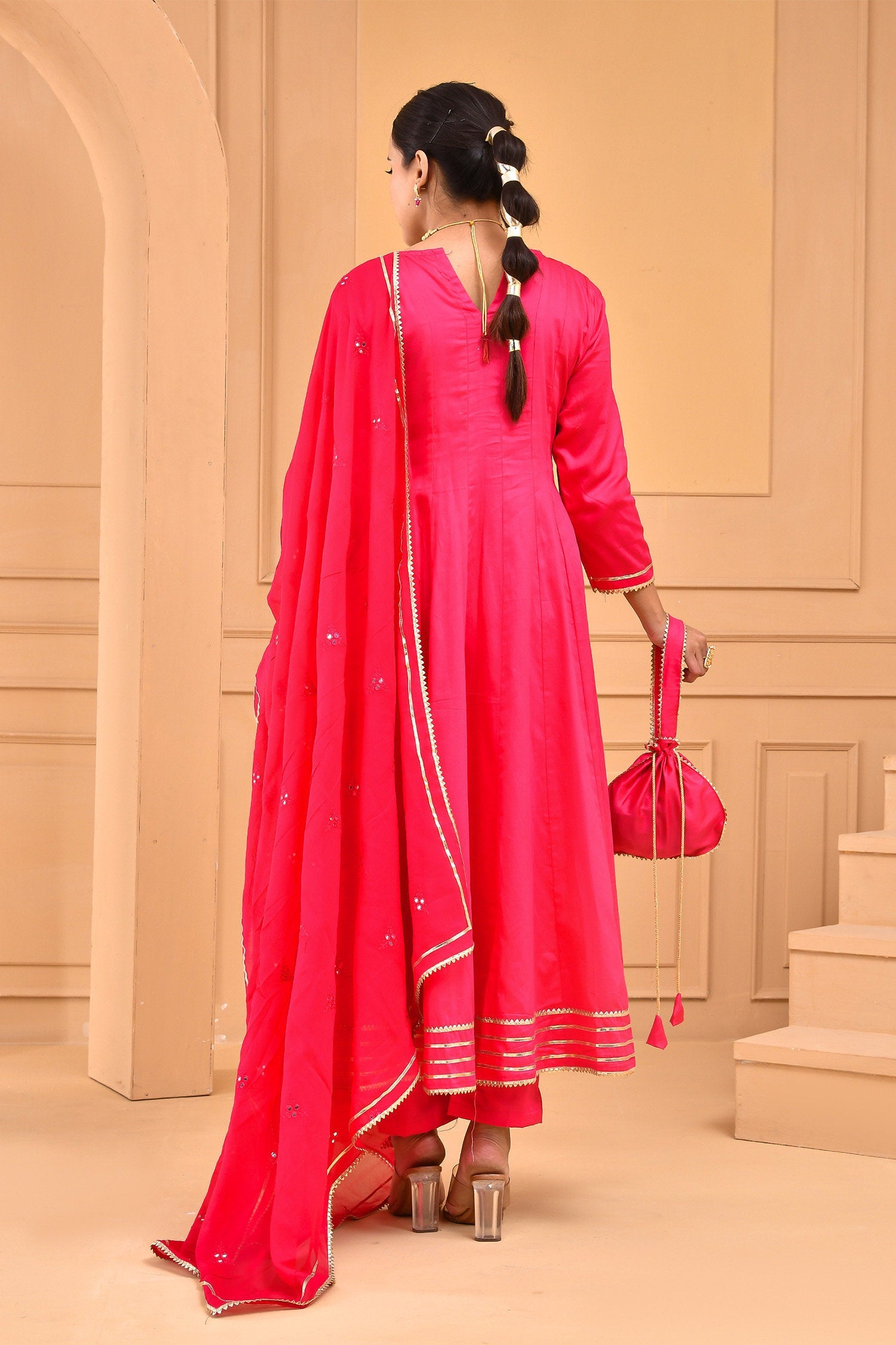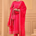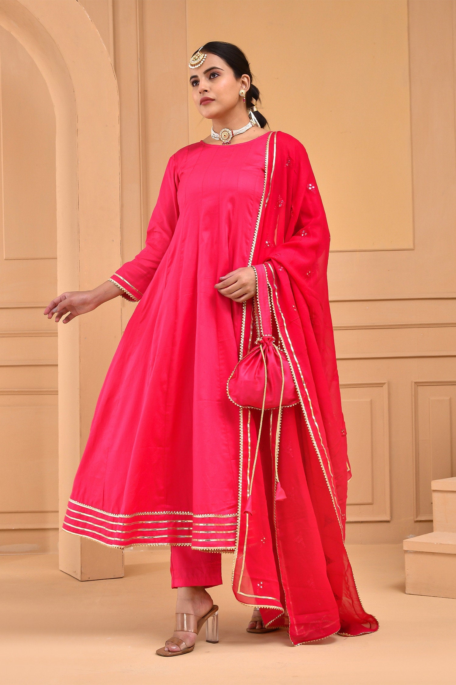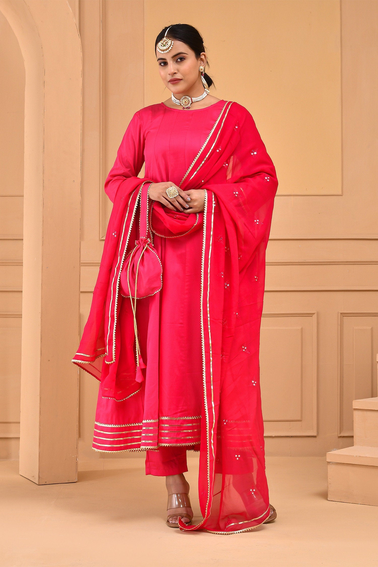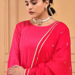 A comforting Ruby pink cotton silk kurta set features full sleeves accompanied with straight pant making it an ideal choice for any causal events with georgette dupatta adorned with mirror work and potli bag.