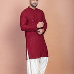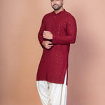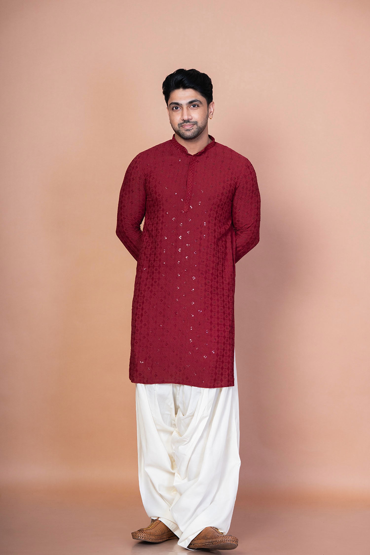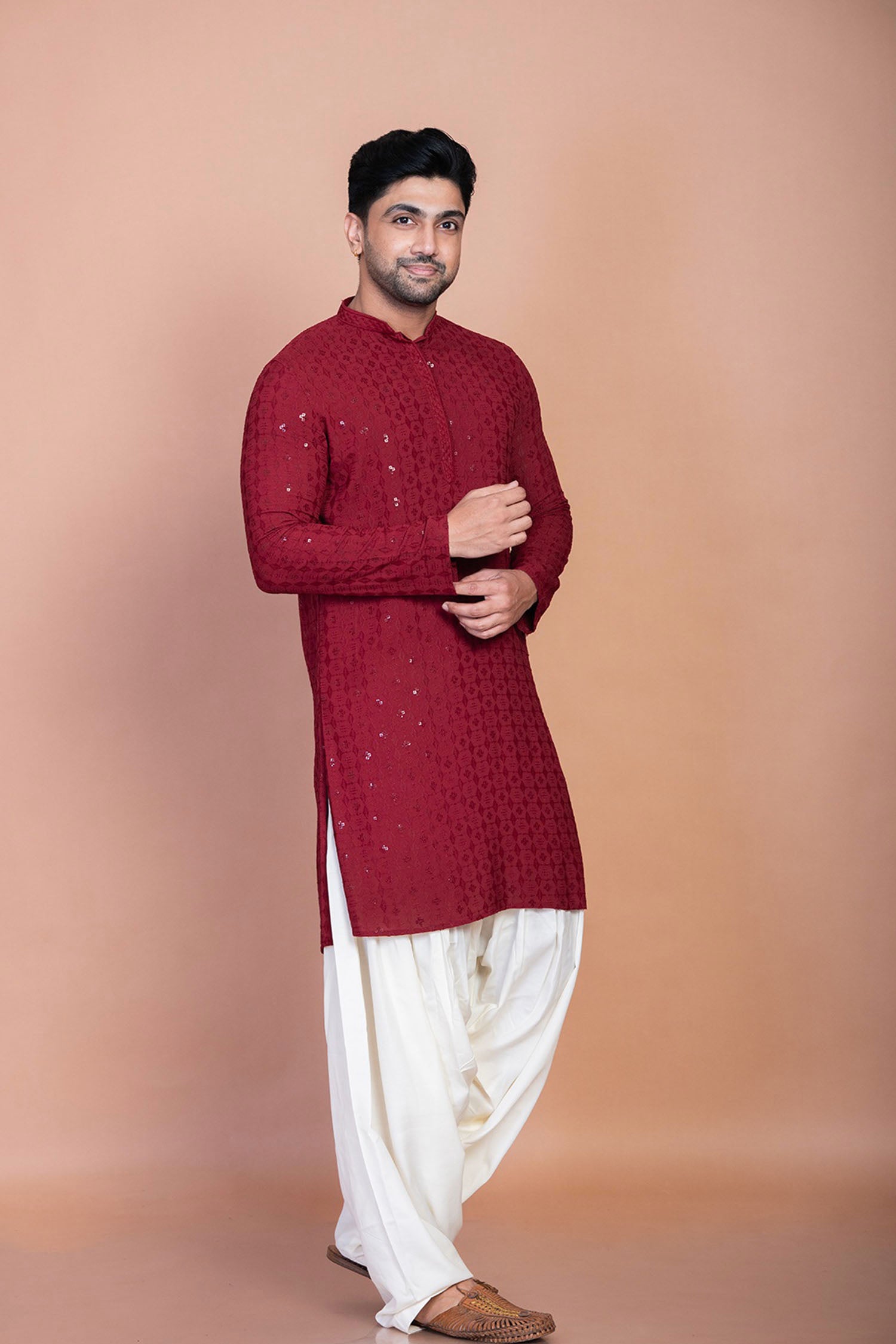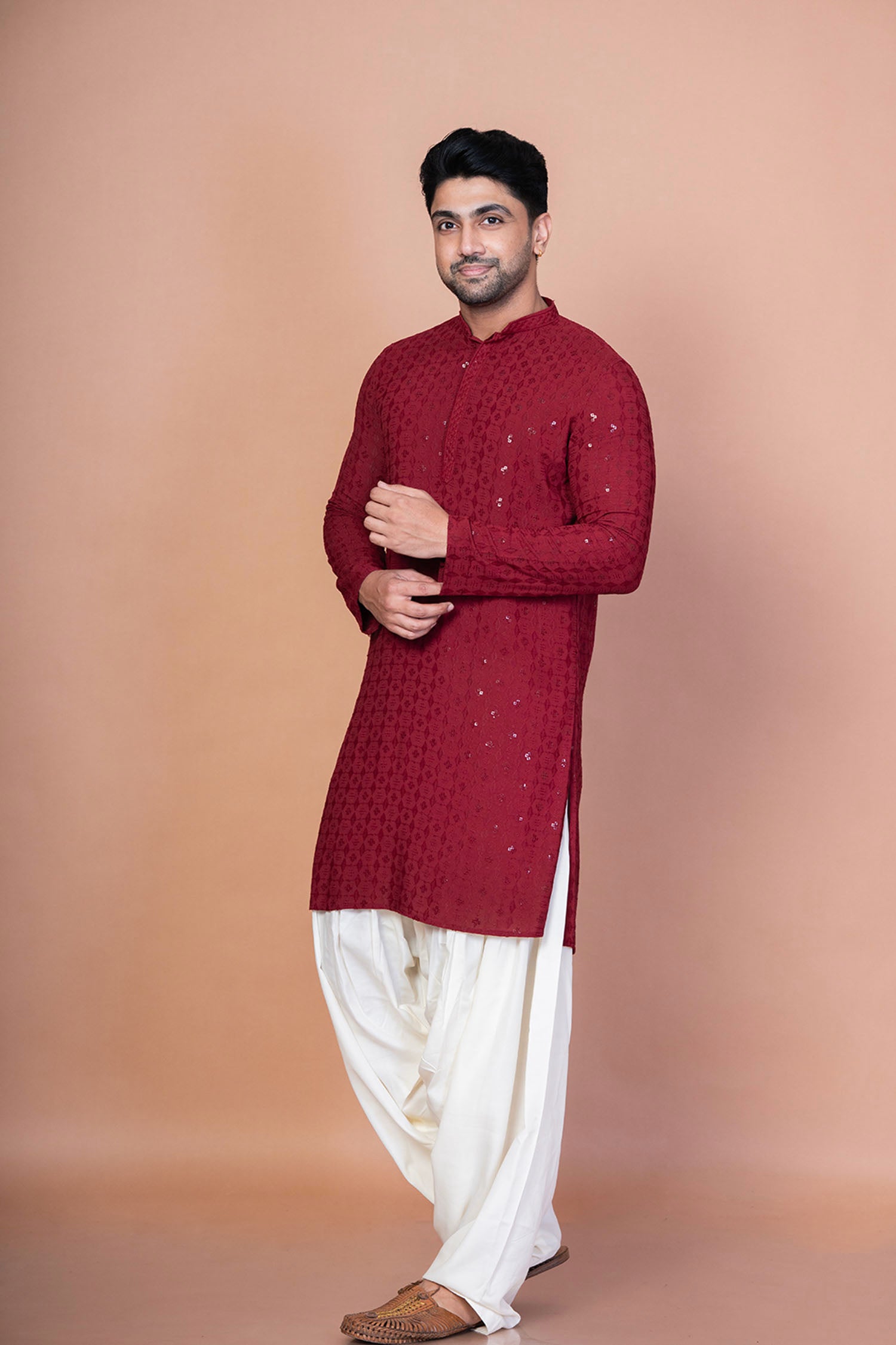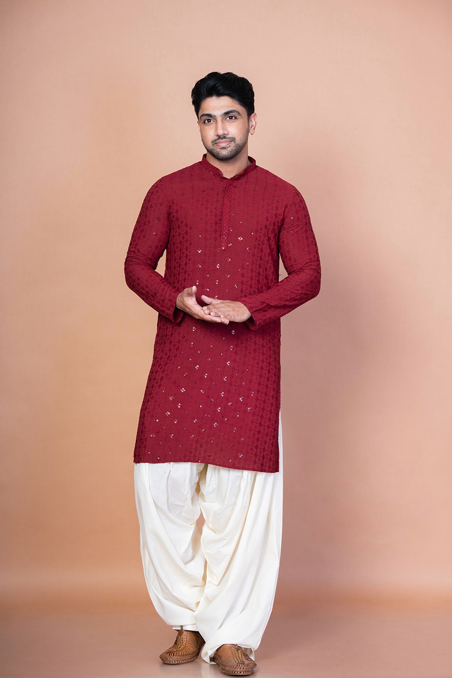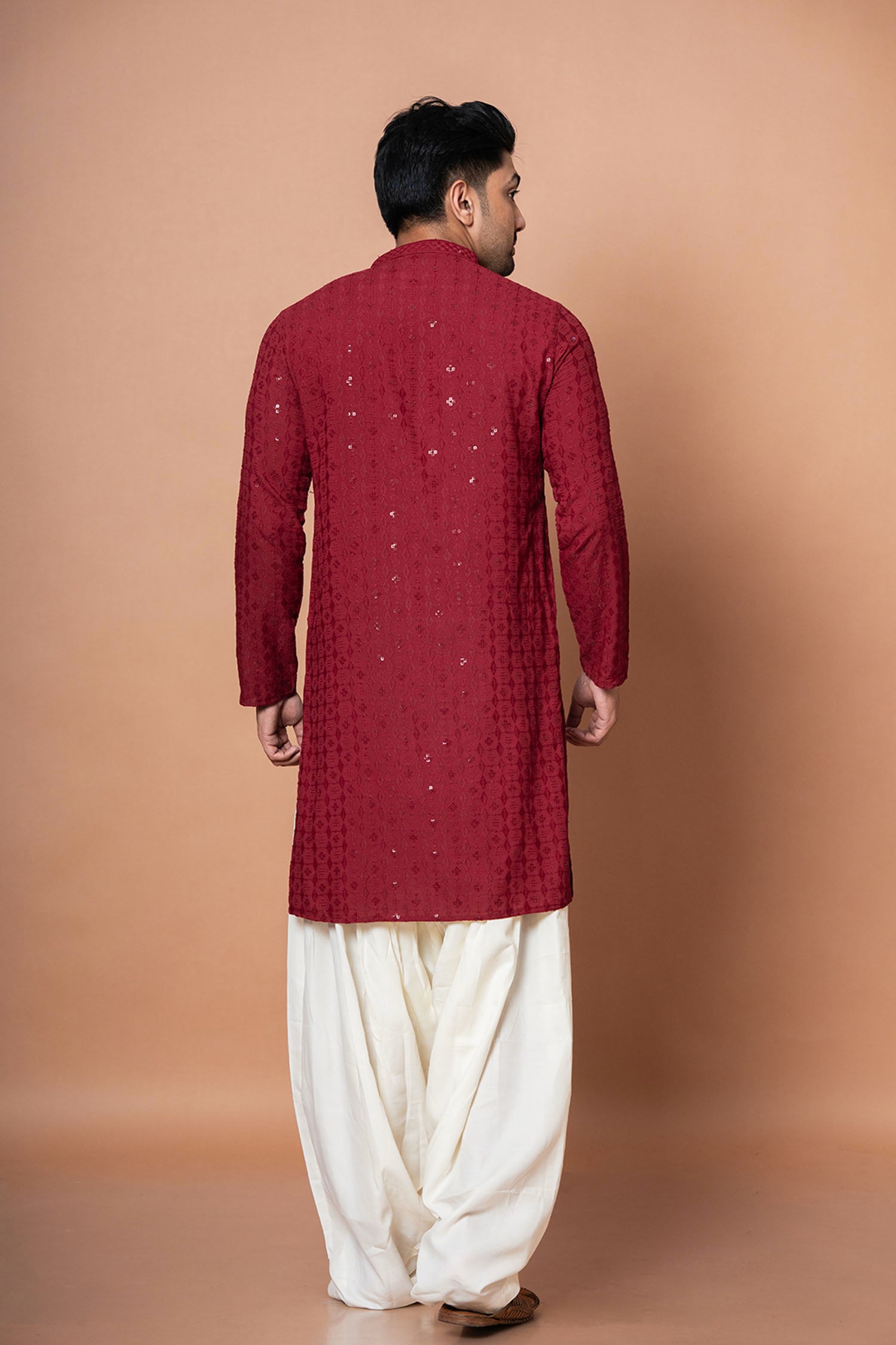 The embroidered Ruby red cotton blend kurta set with mandarin neckline and full sleeves paired with white patiala pants