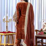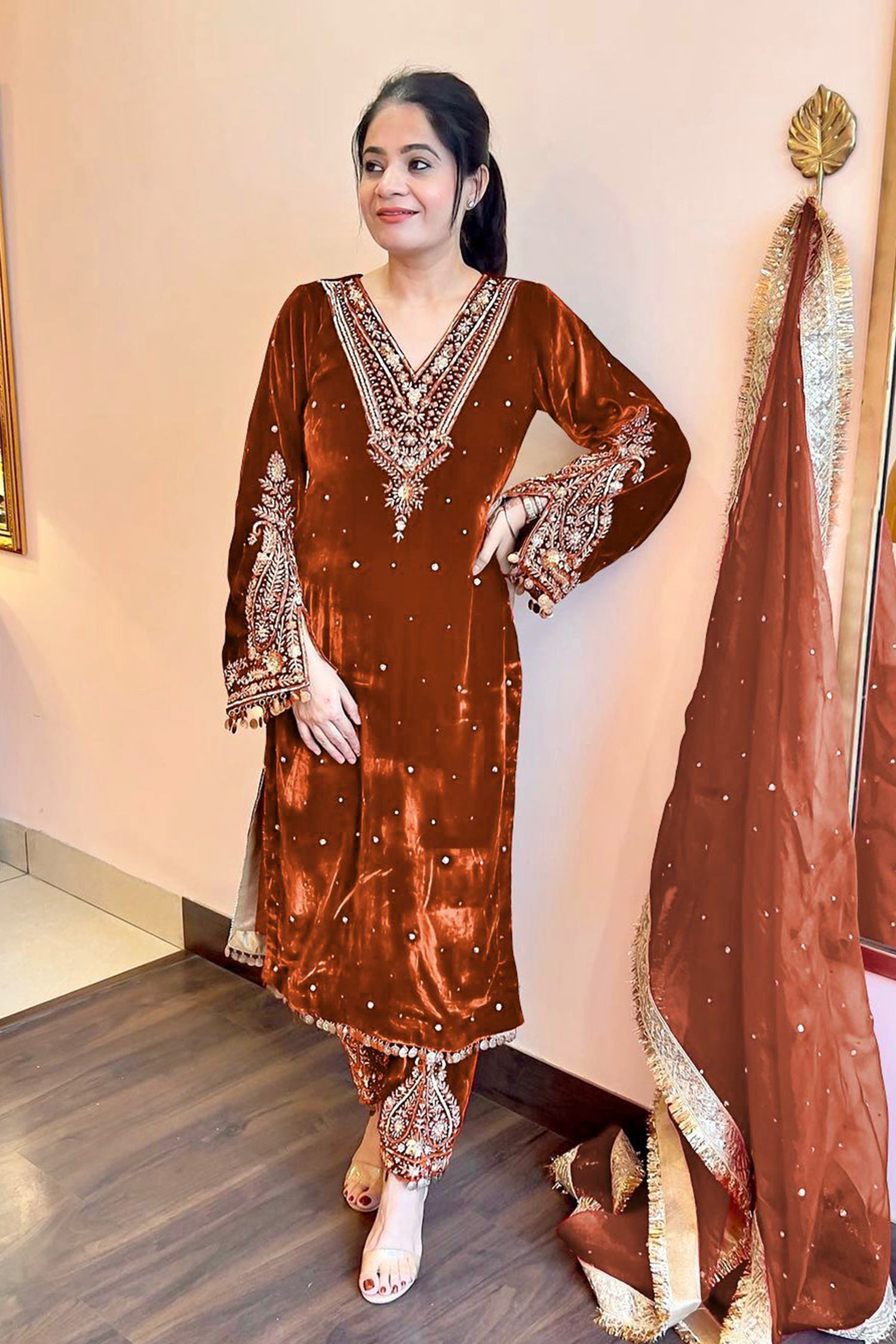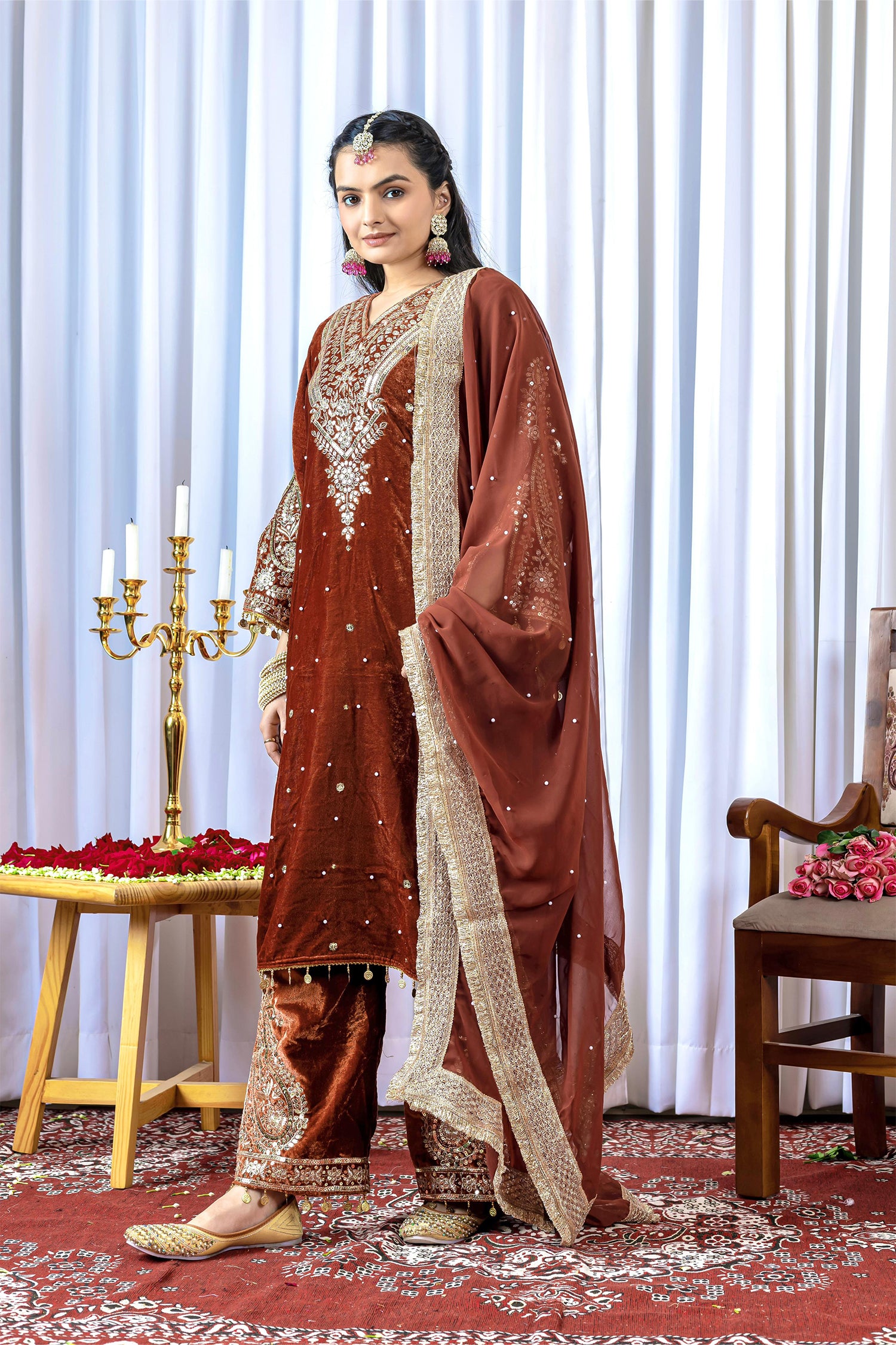 The rust brown velvet embroidered kurti set with matching pant and a georgette dupatta for an elegant and rich look with trendy and neat finish.