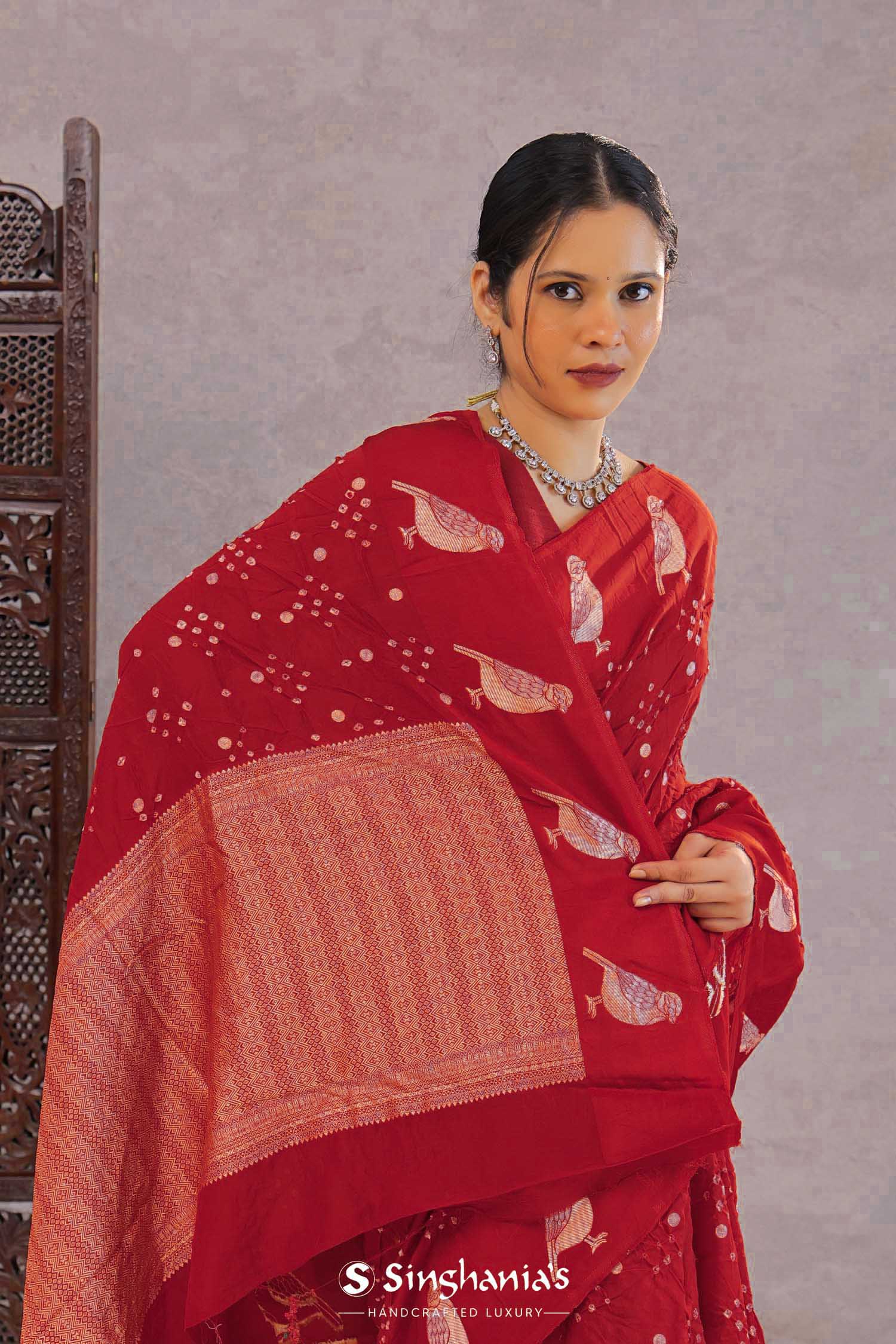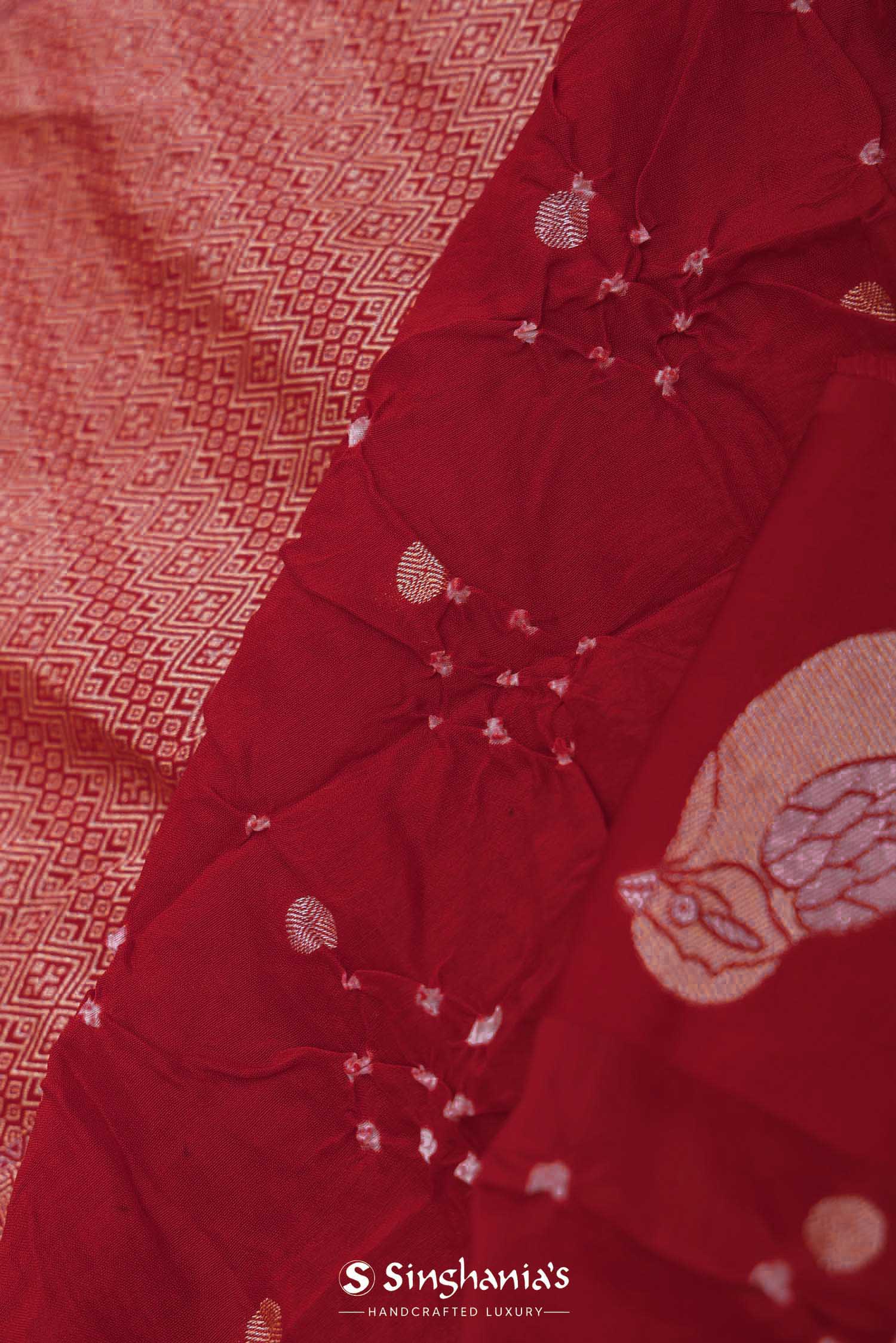 This dye pattern on Saffron red silk bandhani saree with border featuring avian motifs is a ideal choice for any occasion.Making you satisfy with each drape