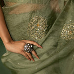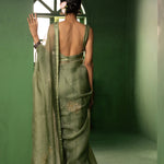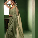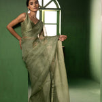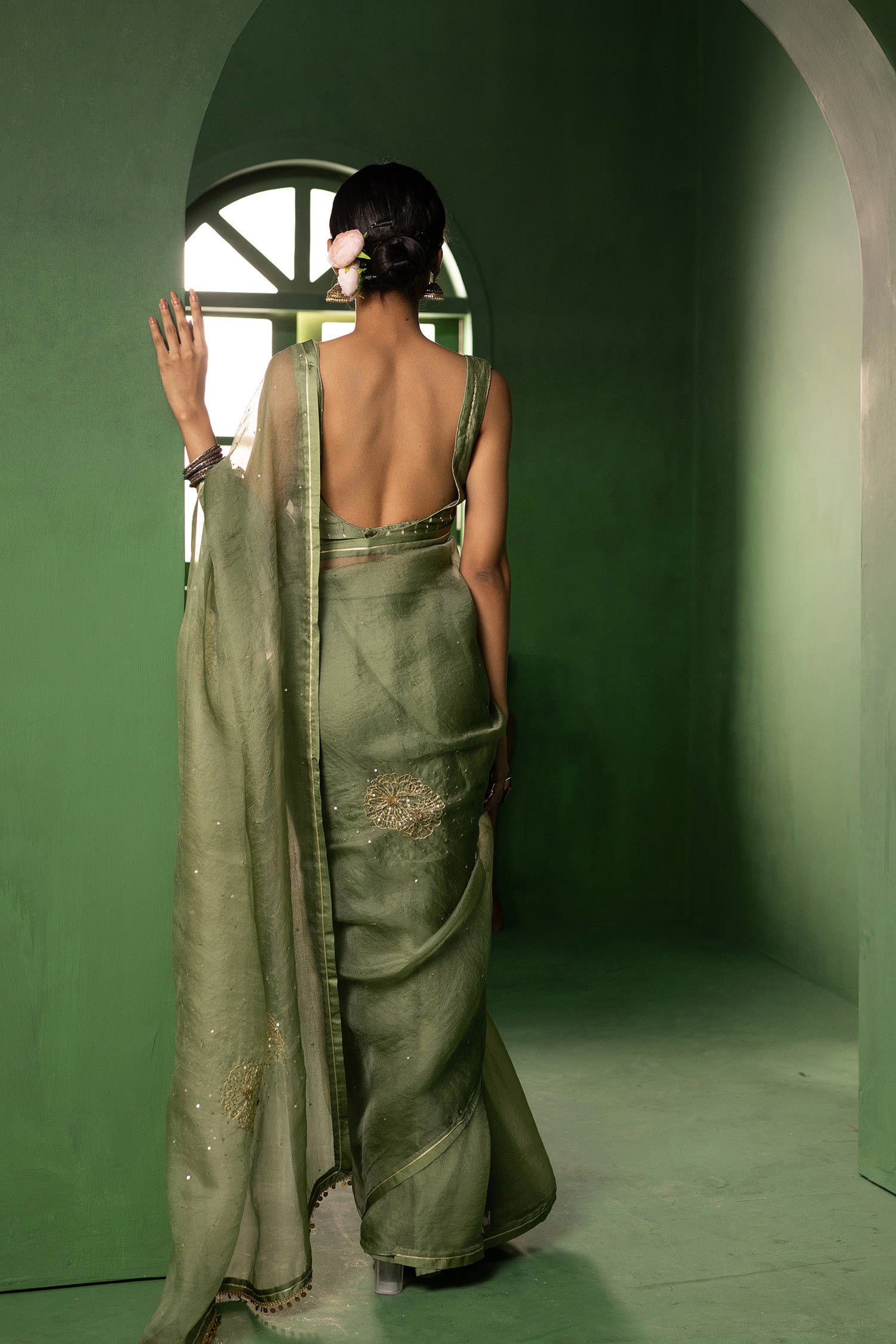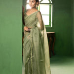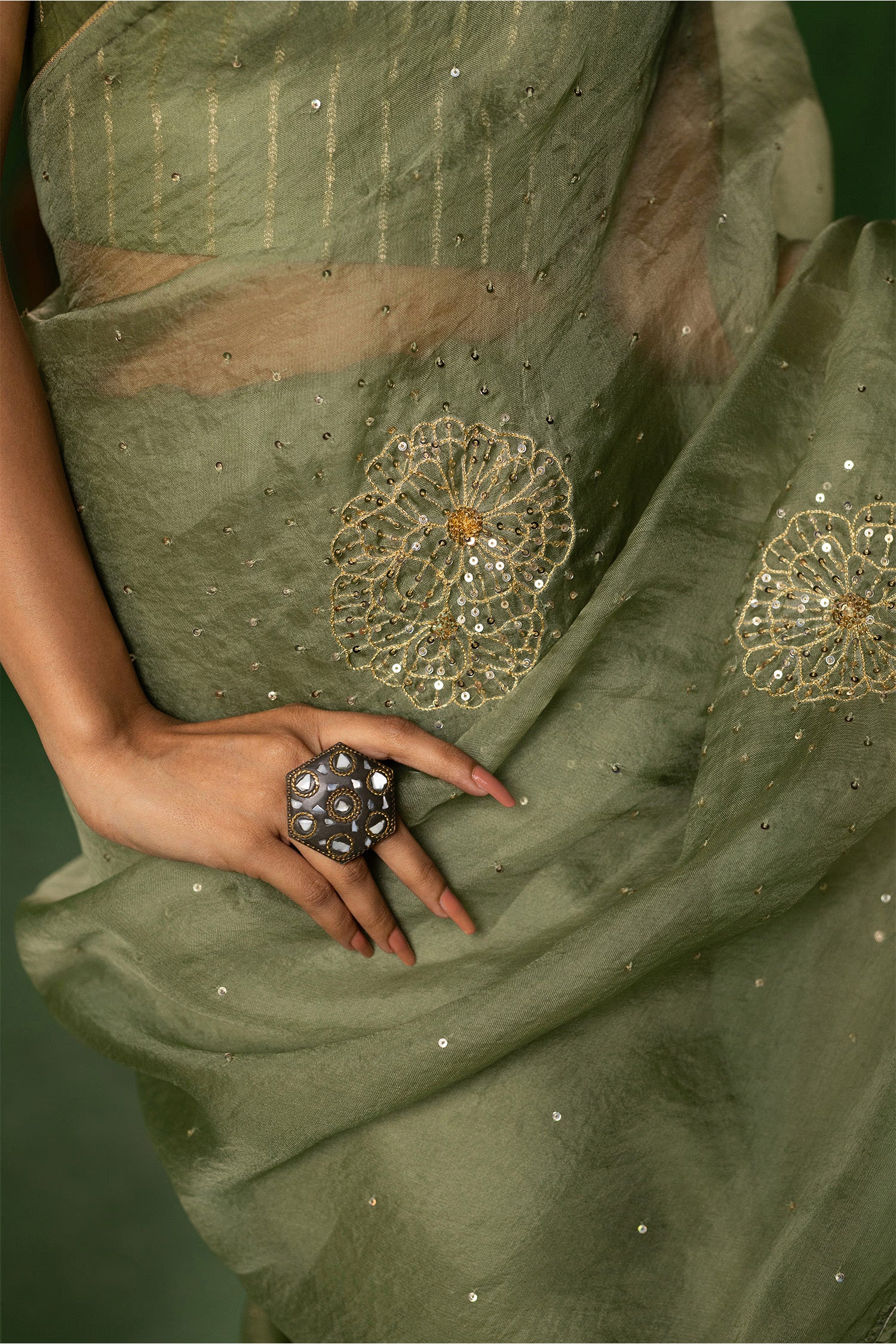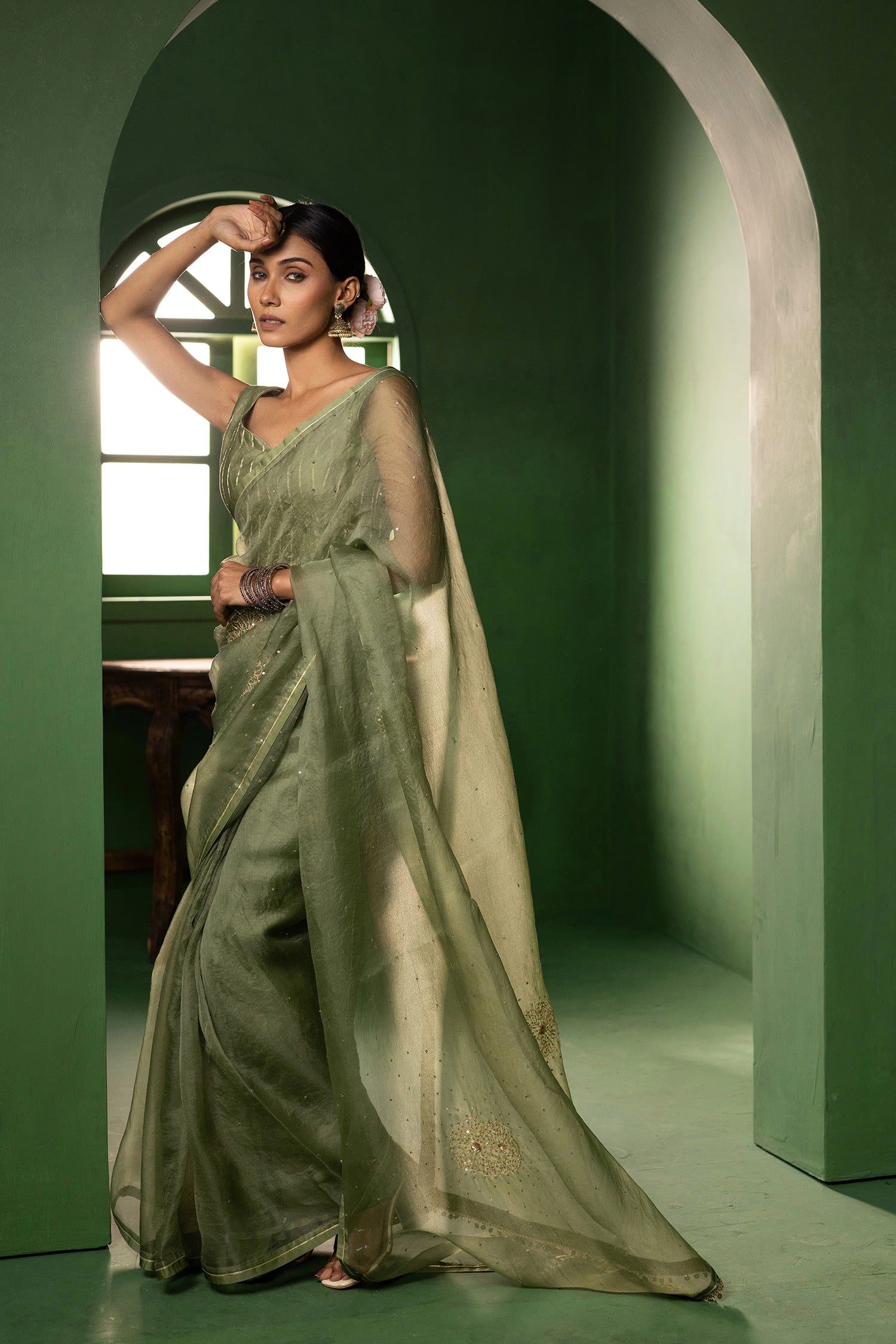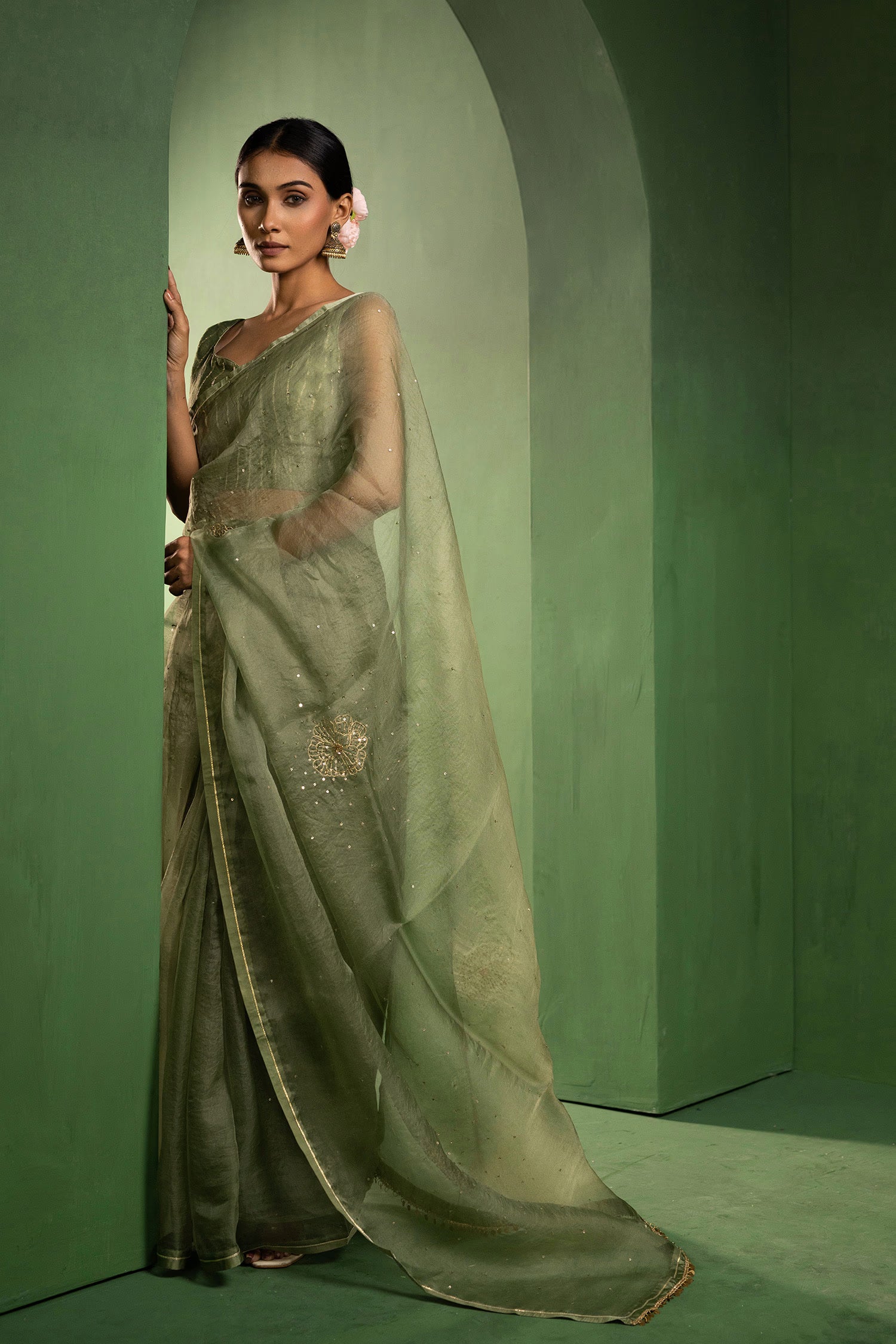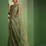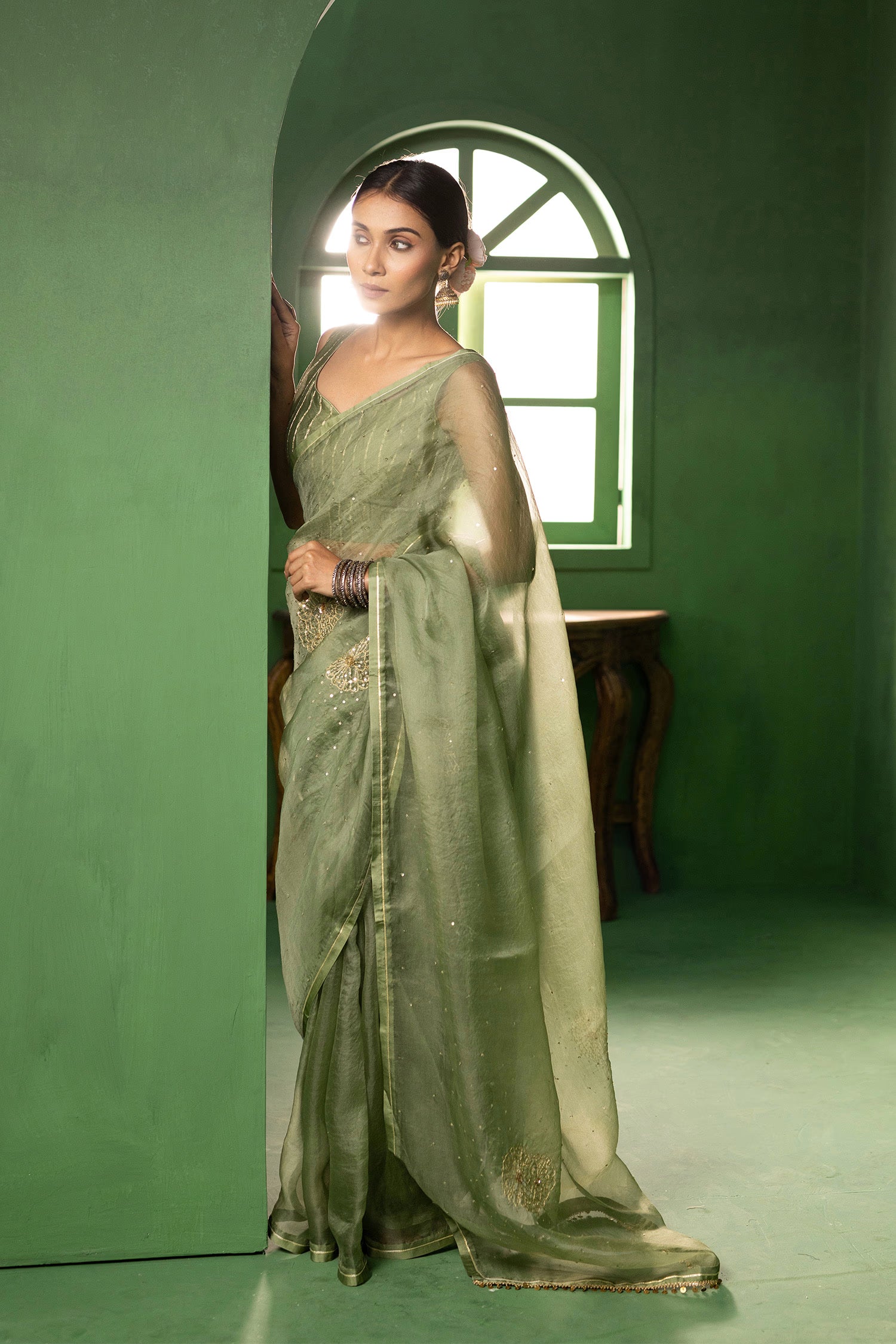 This versatile and flowy drape of this Sage green silk organza saree adorned with sequins and embroidery work forming floral design spread all over the saree complemented with chanderi jacquard blouse piece making it ideal choice for any fancy parties