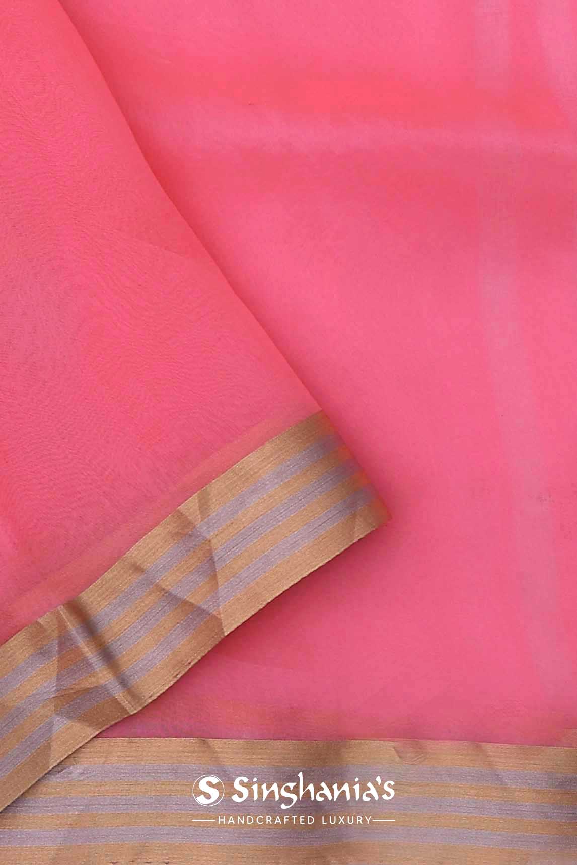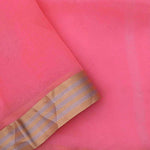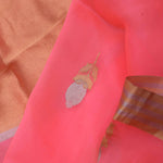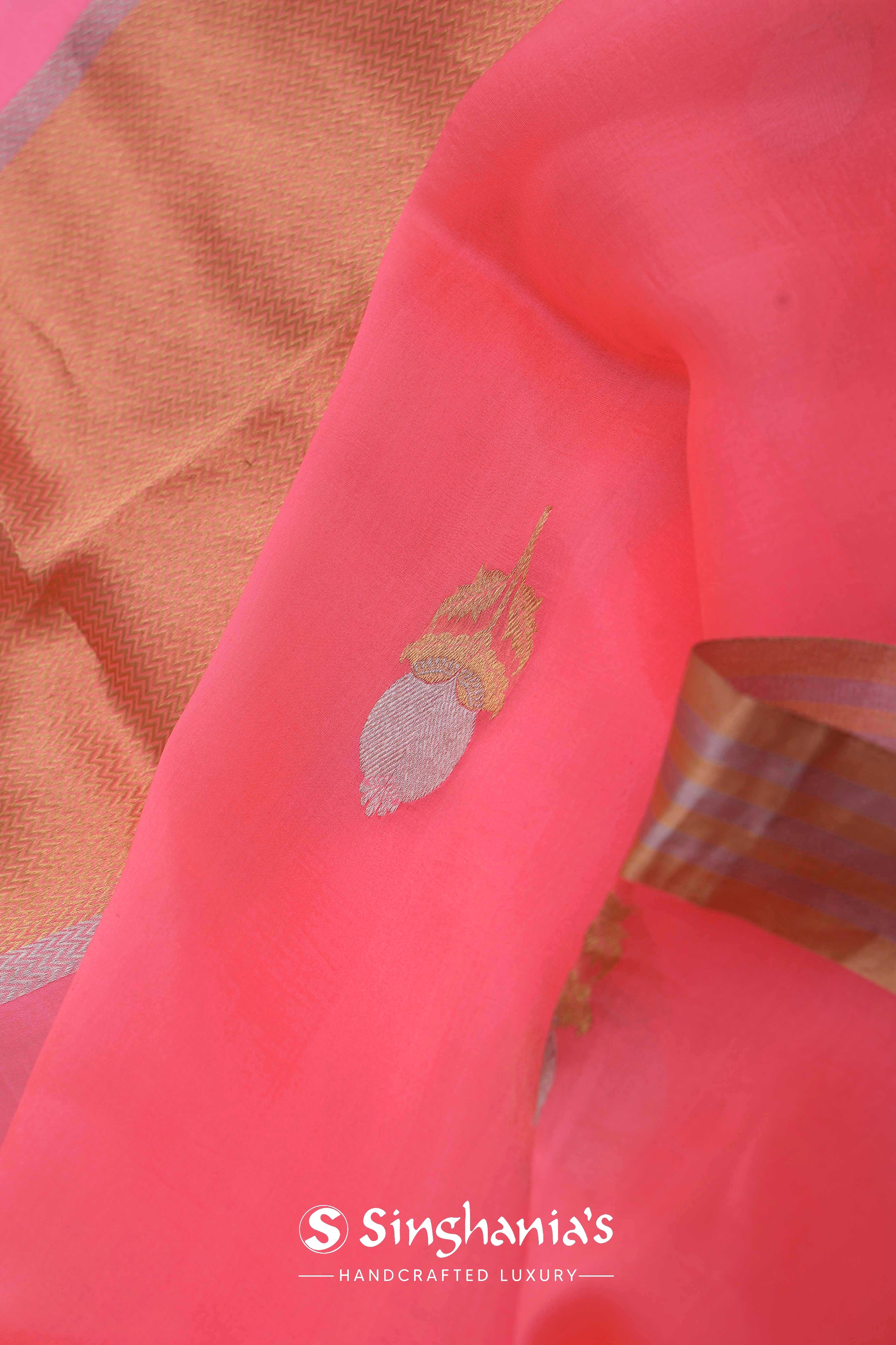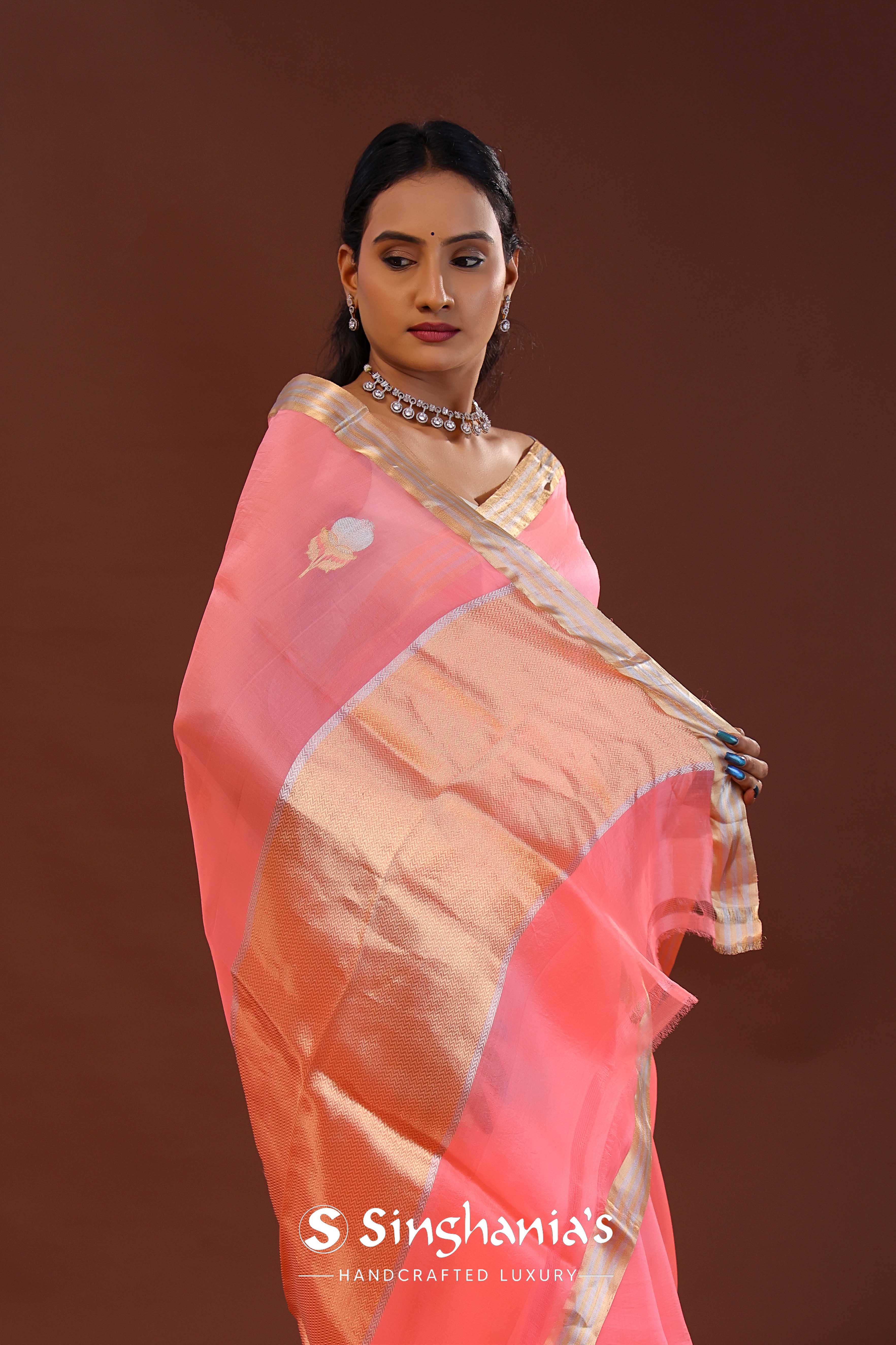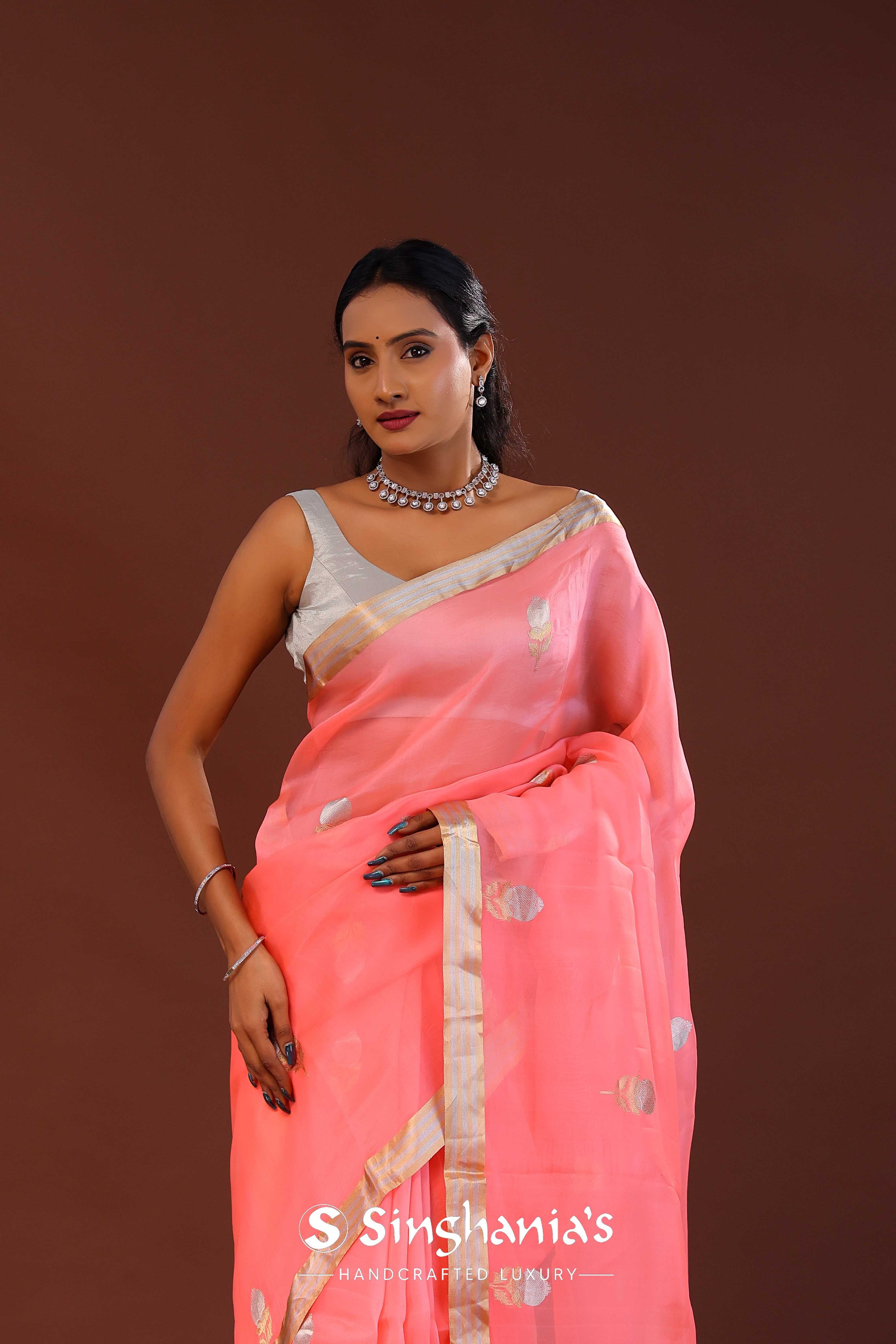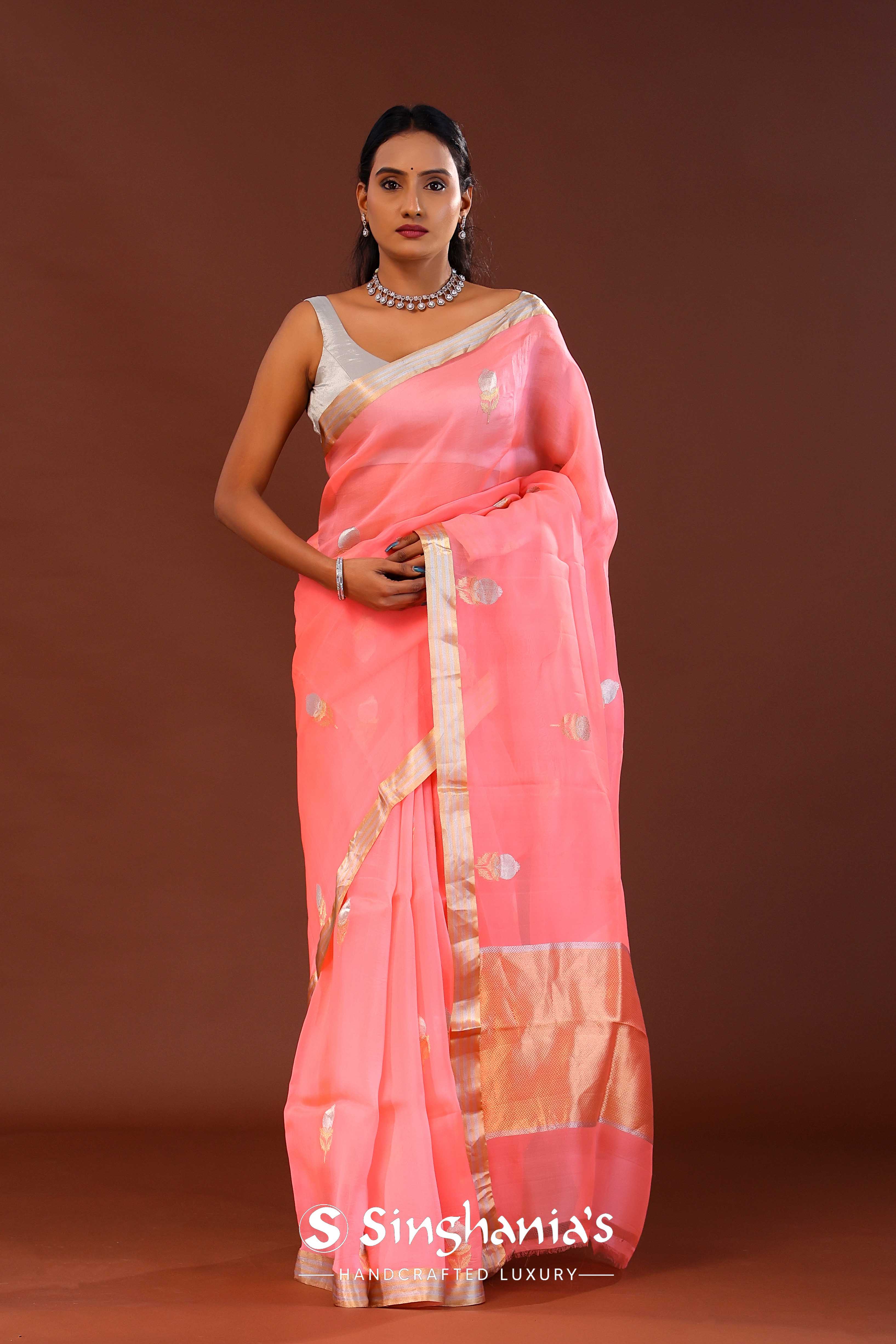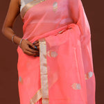 This Salmon pink organza banarasi saree reflects grace by the simple floral butti's with gold and silver and small contrast border, which adds extra charm and elegence to the overall look of the saree
