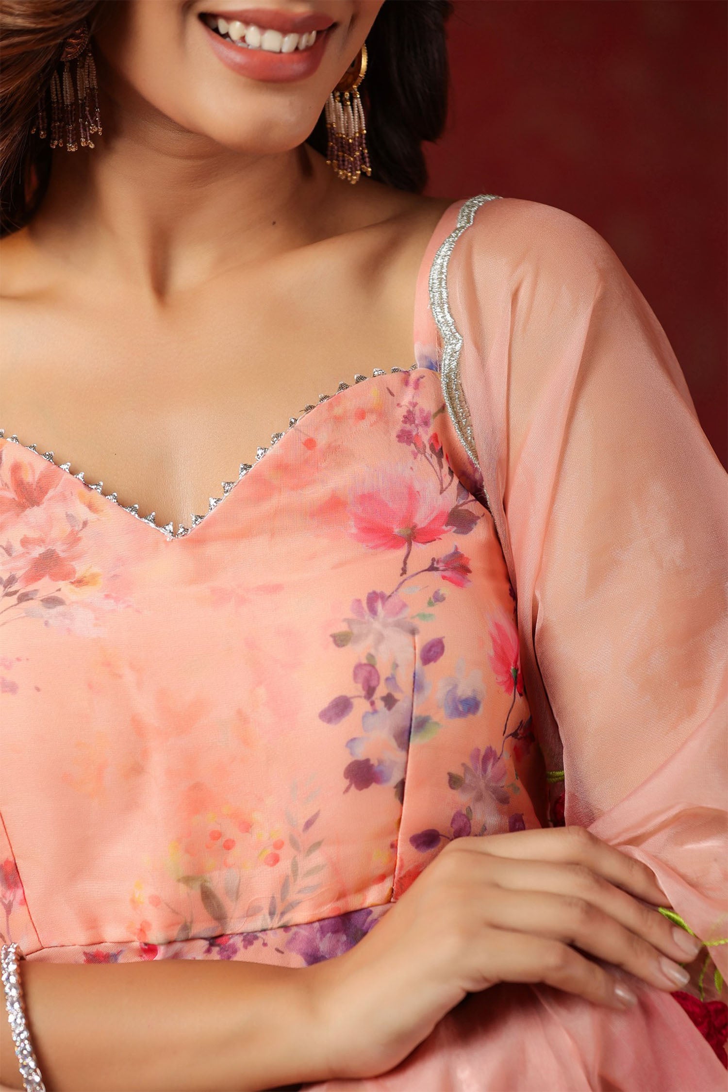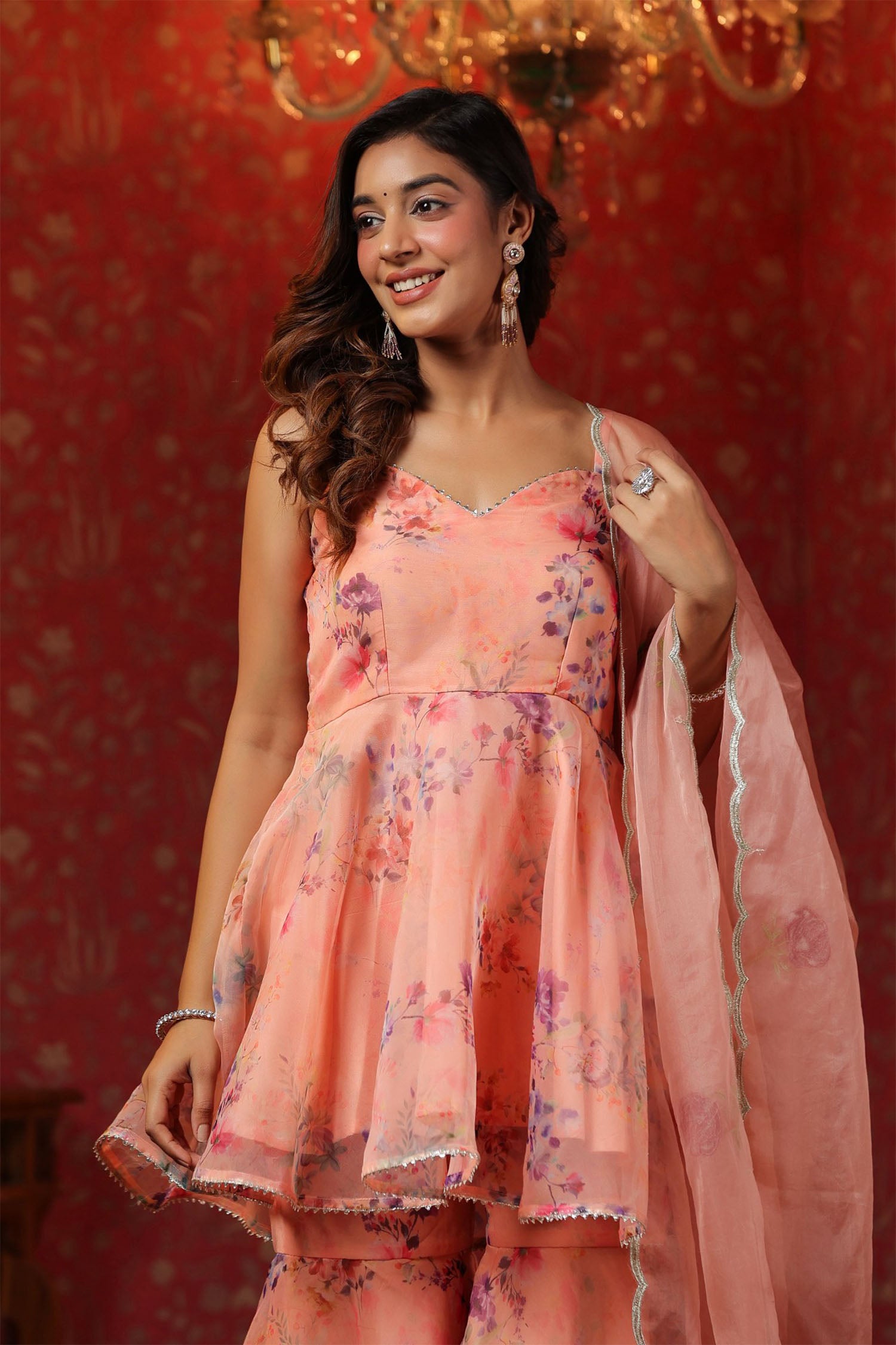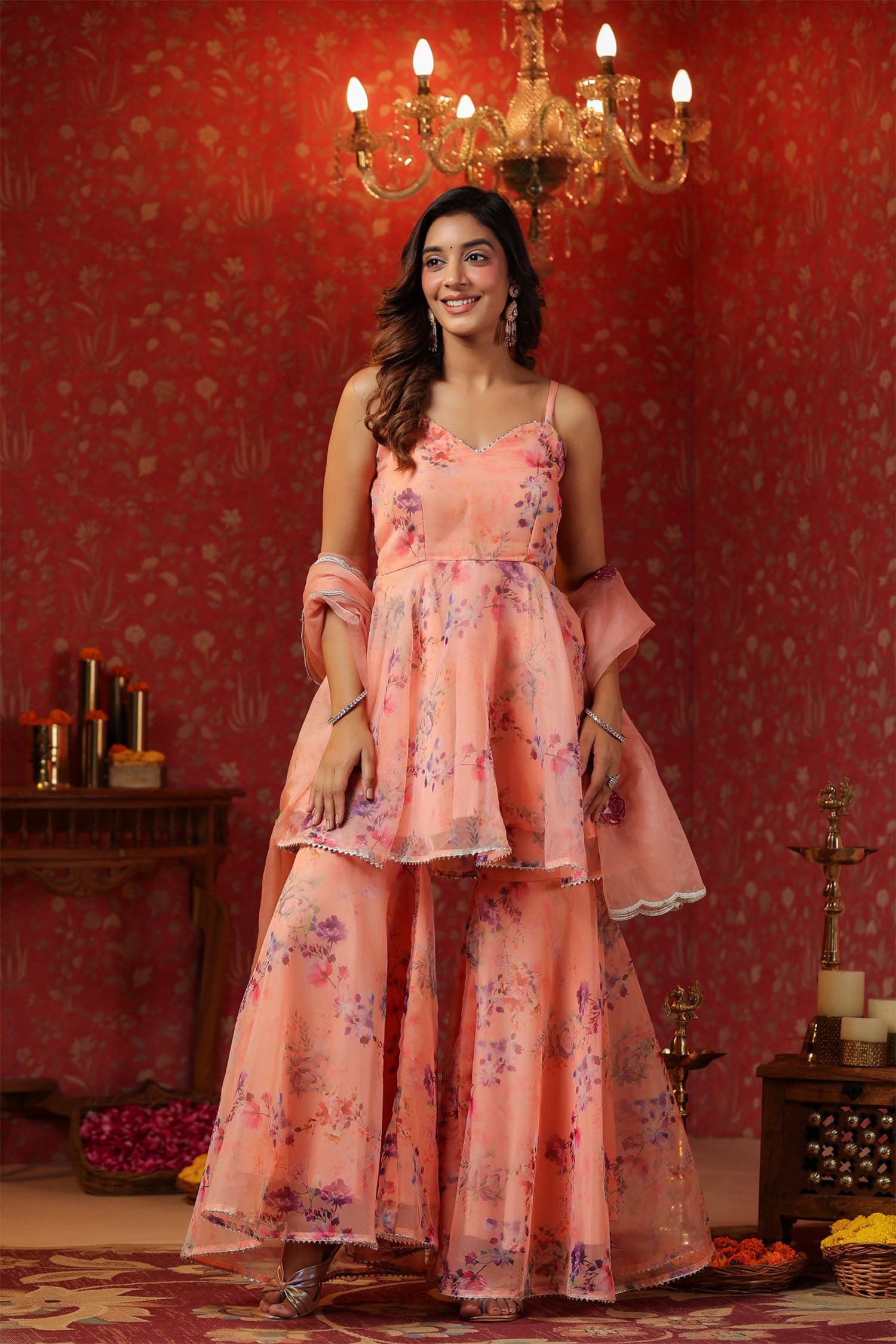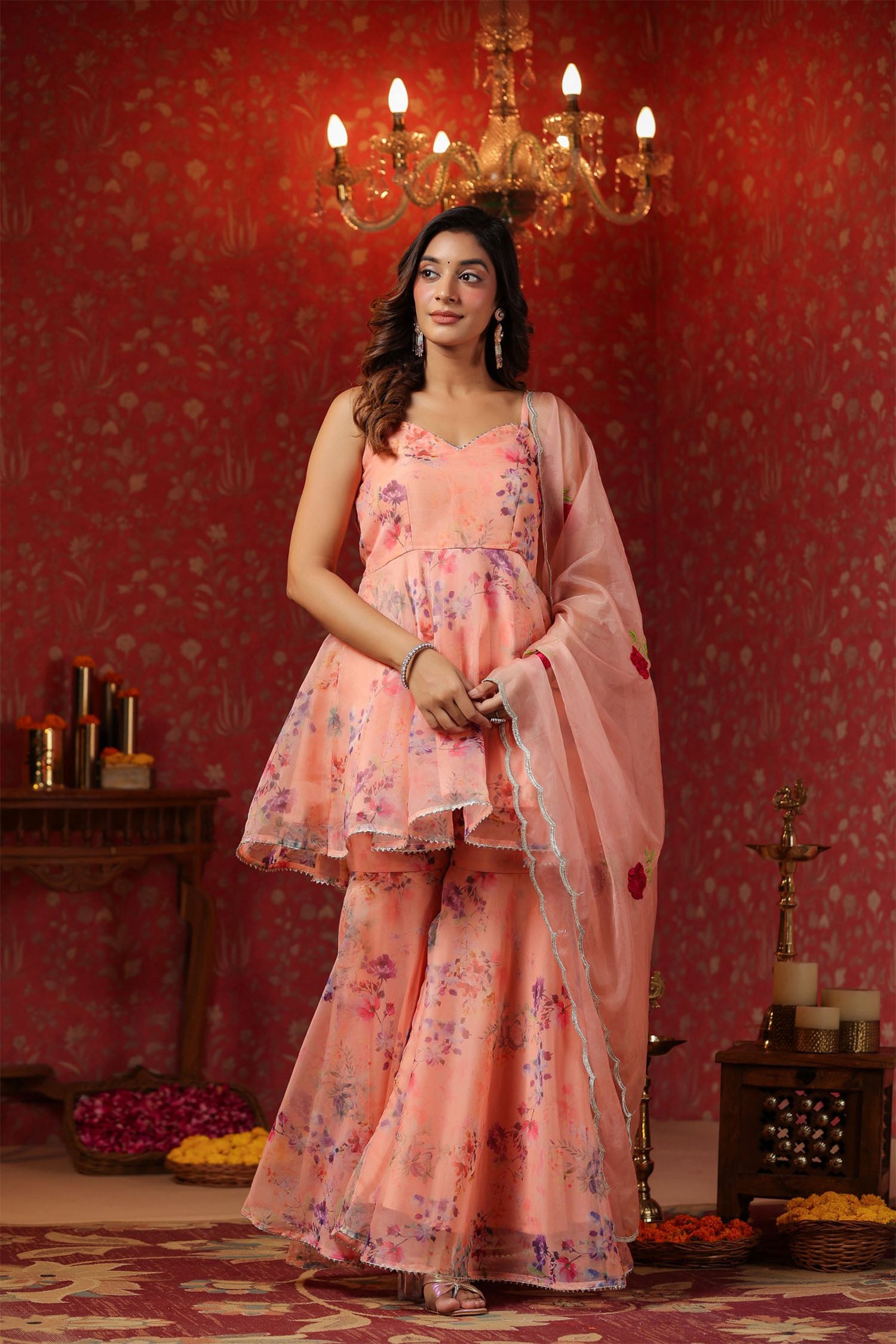 The salmon pink organza floral sharara set with organza dupatta for a stylish and charming look.