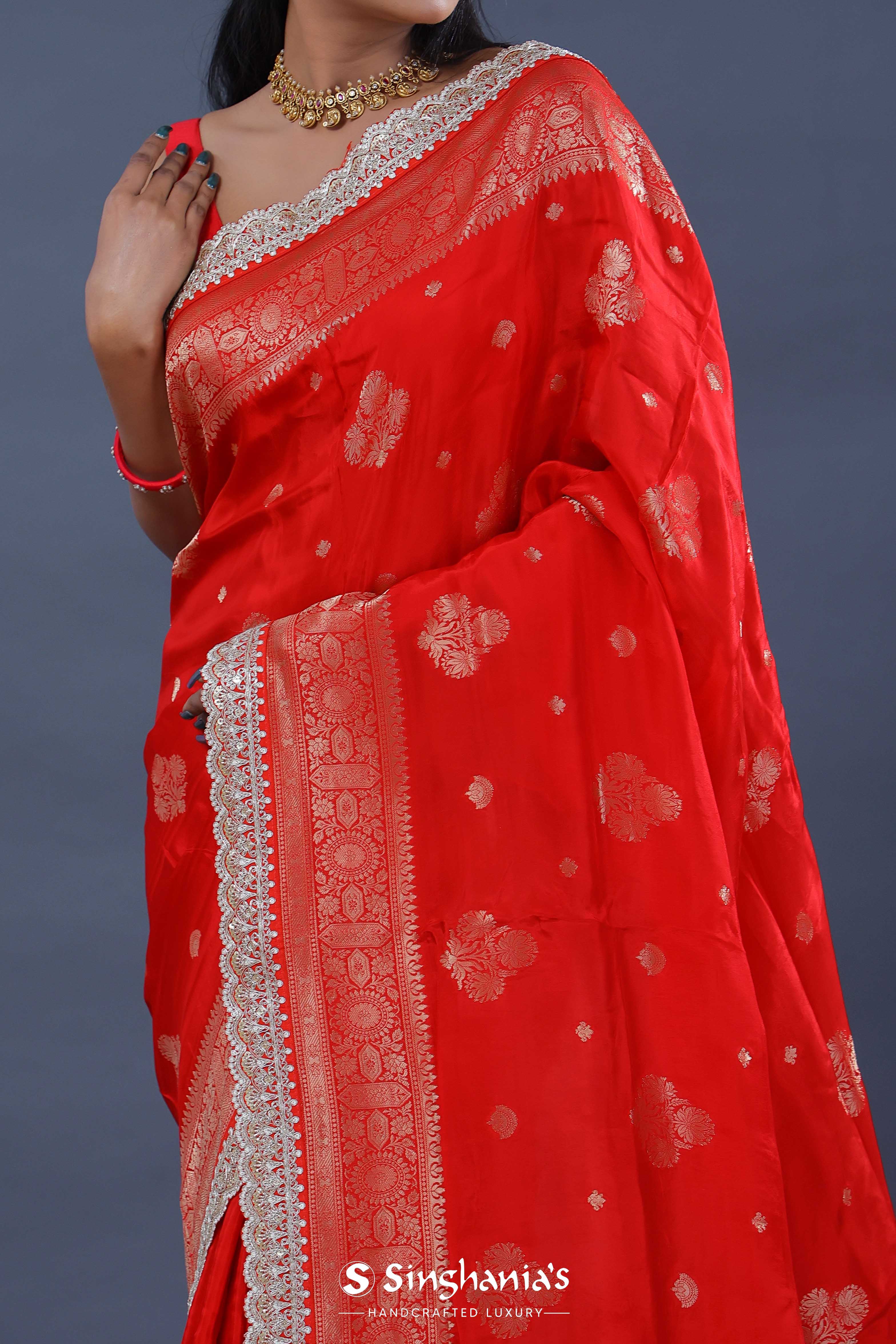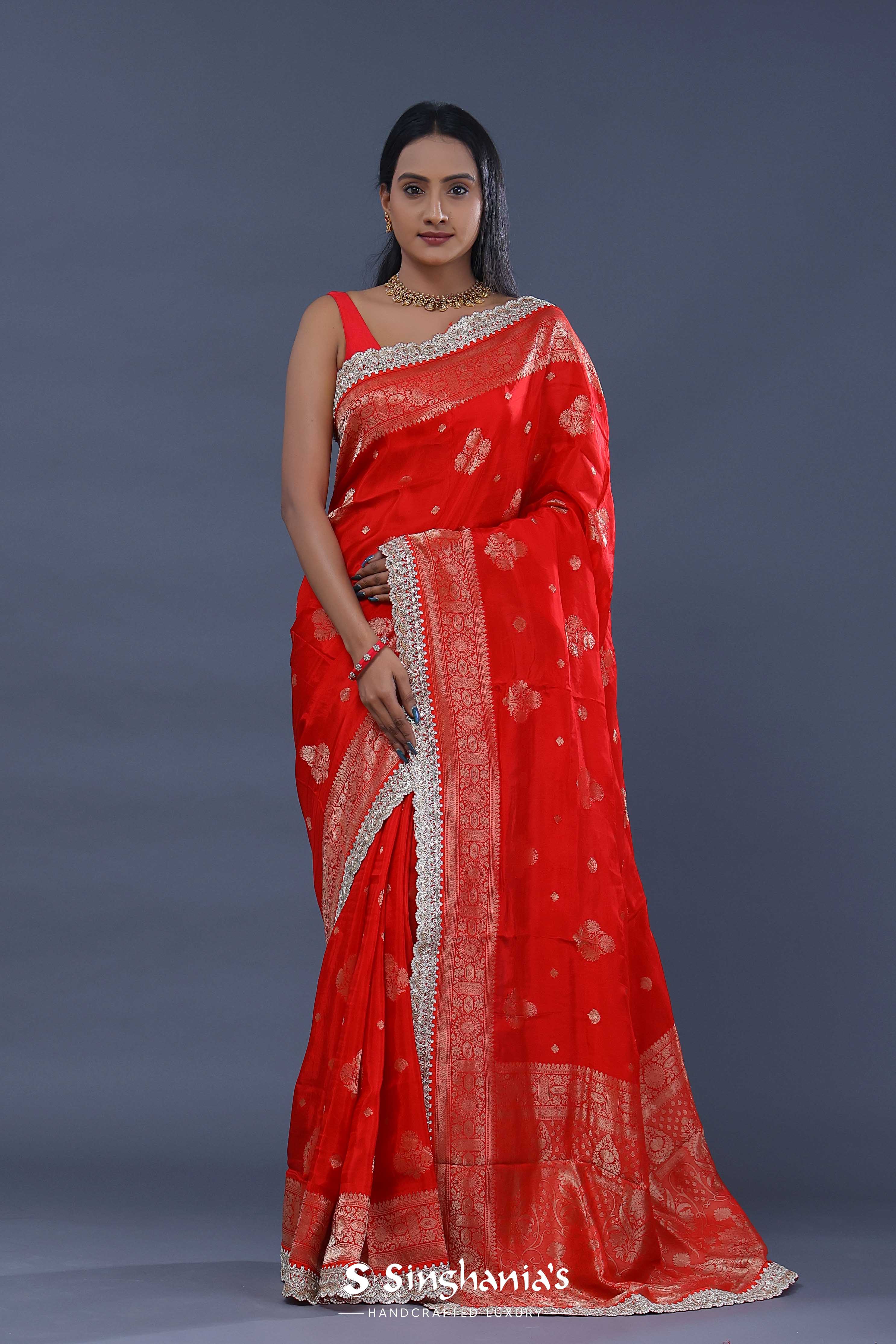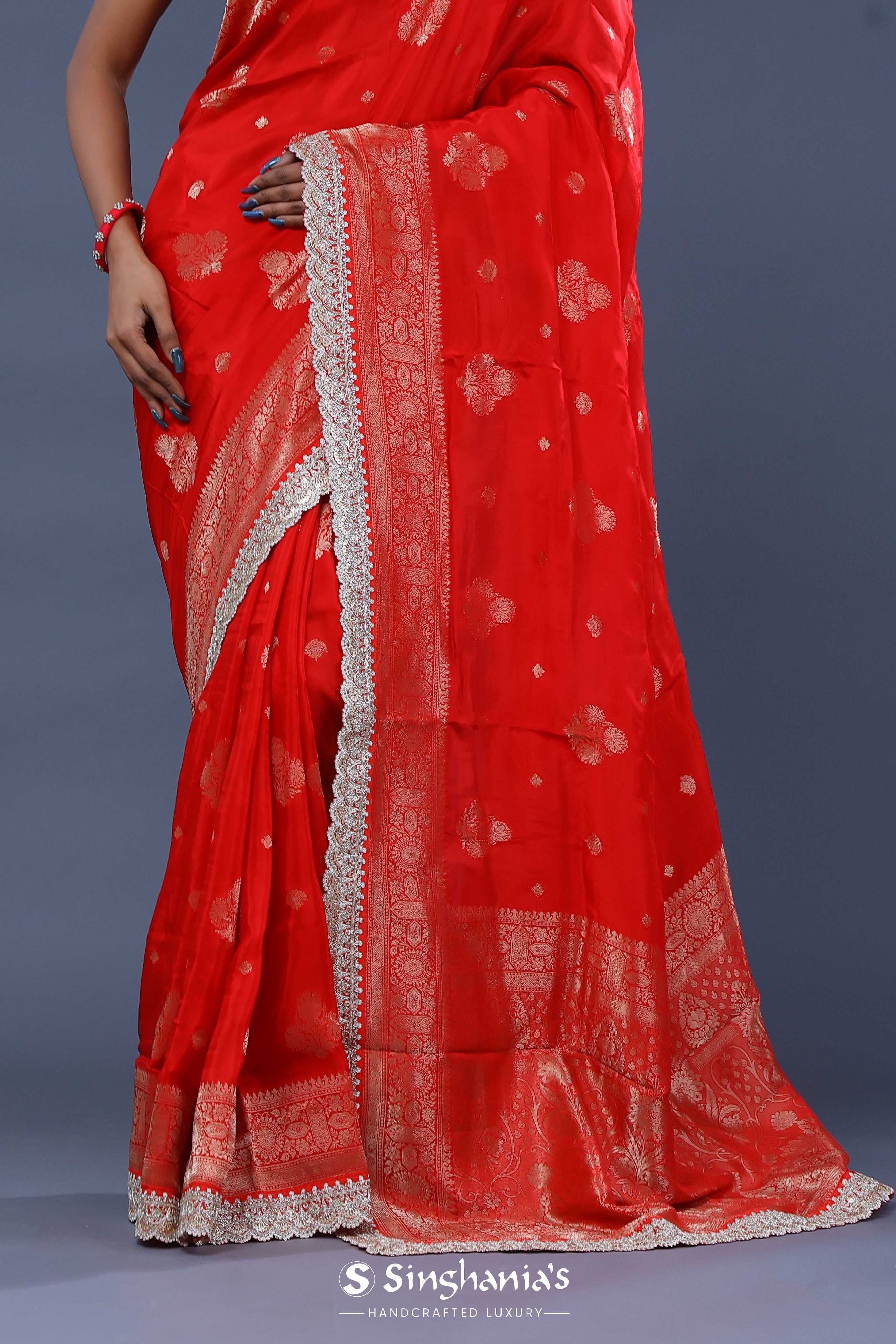 Scarlet red banarasi saree adorned with gold weaving floral shaped butta’s and butti's spread all across the saree with embroidered scallop border emits elegance and grace which is making it stand-out in any event
