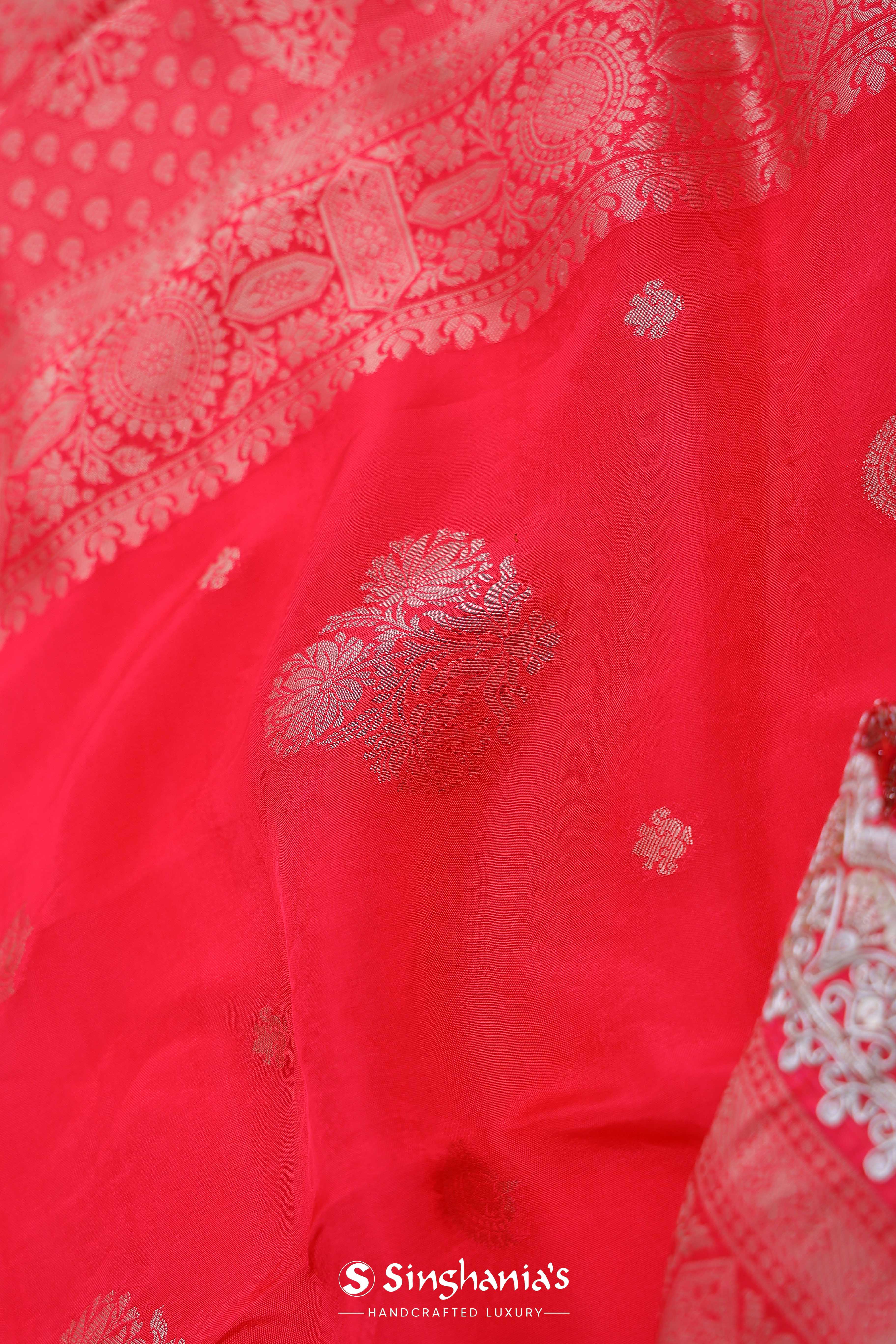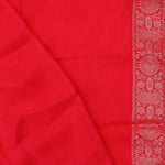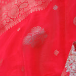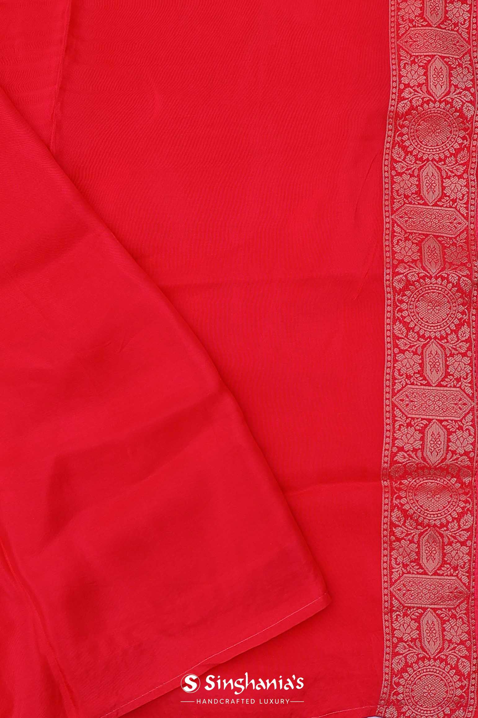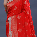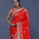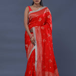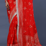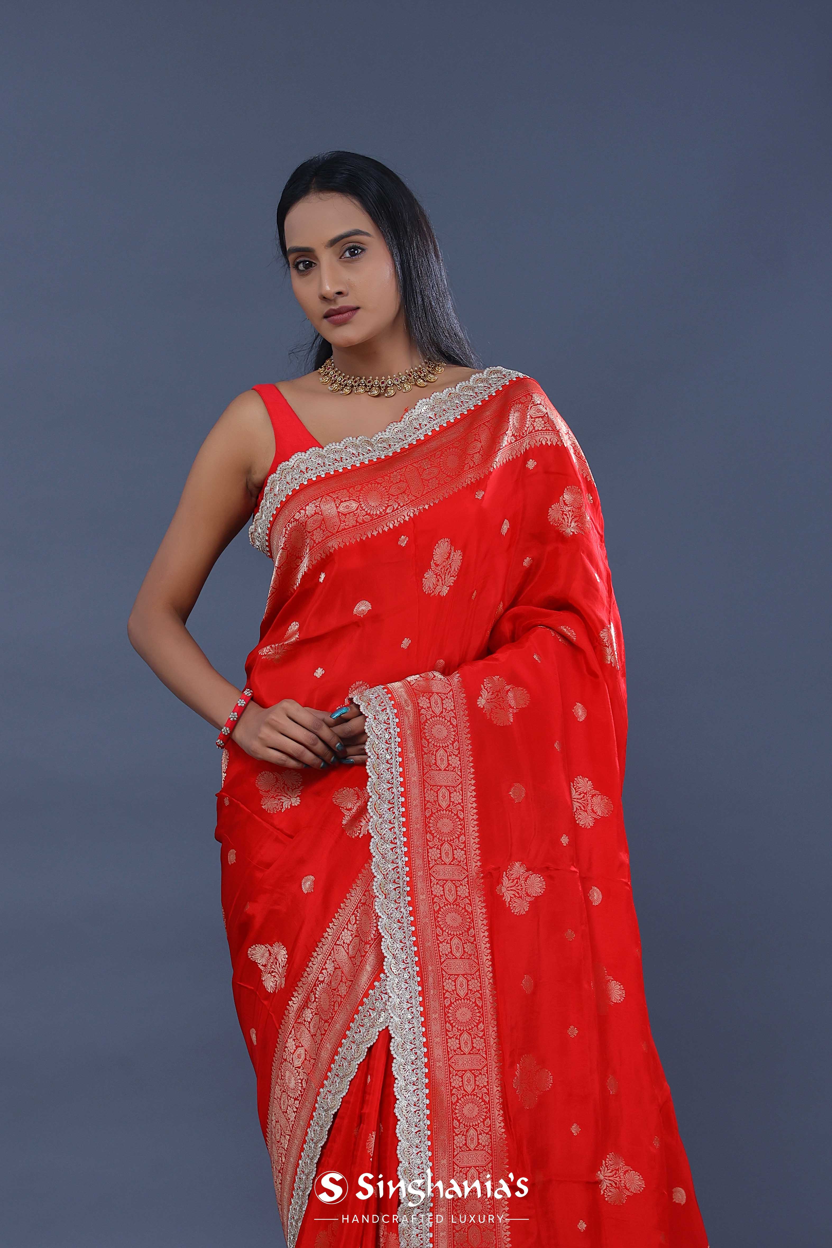 Scarlet red banarasi saree adorned with gold weaving floral shaped butta’s and butti's spread all across the saree with embroidered scallop border emits elegance and grace which is making it stand-out in any event
