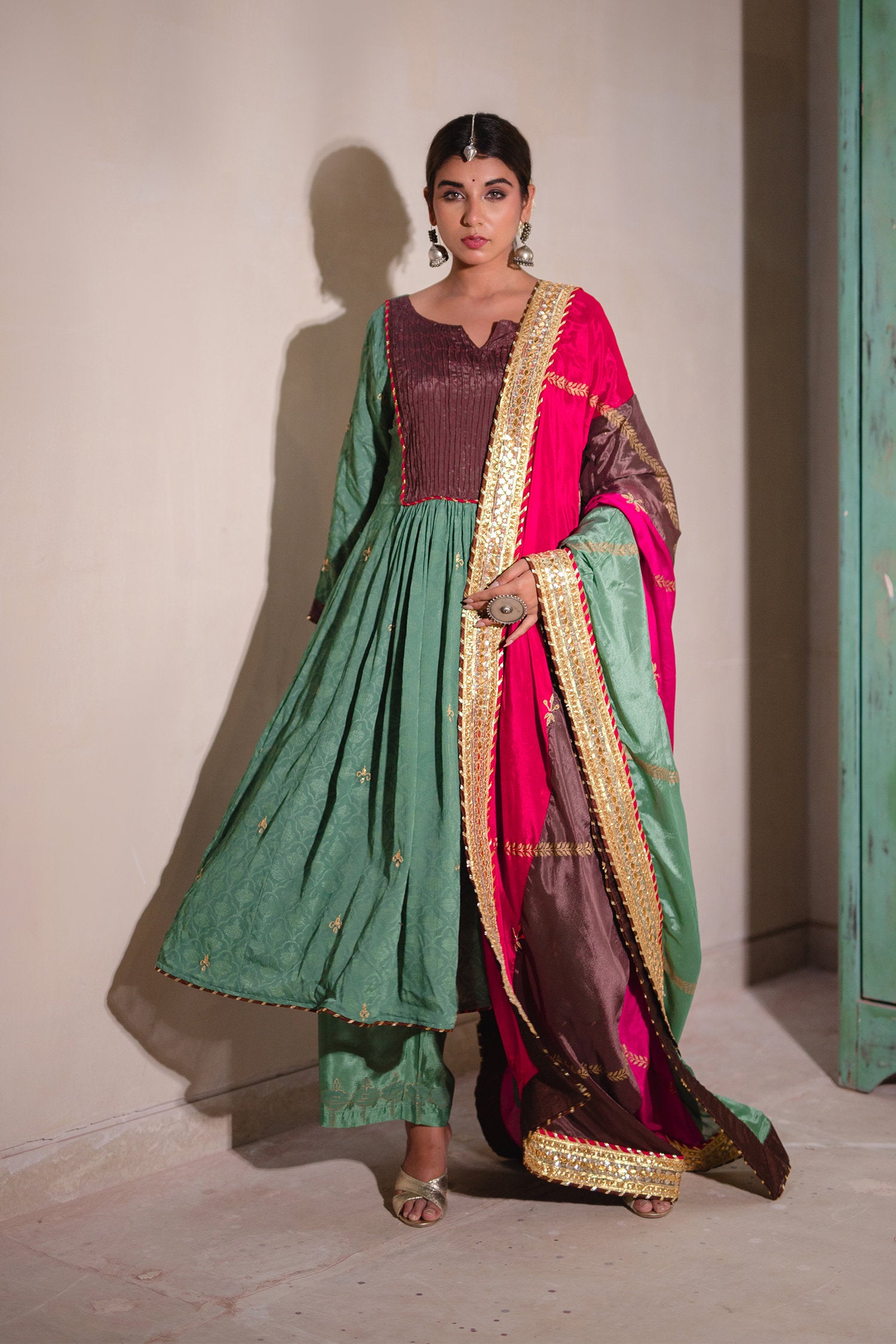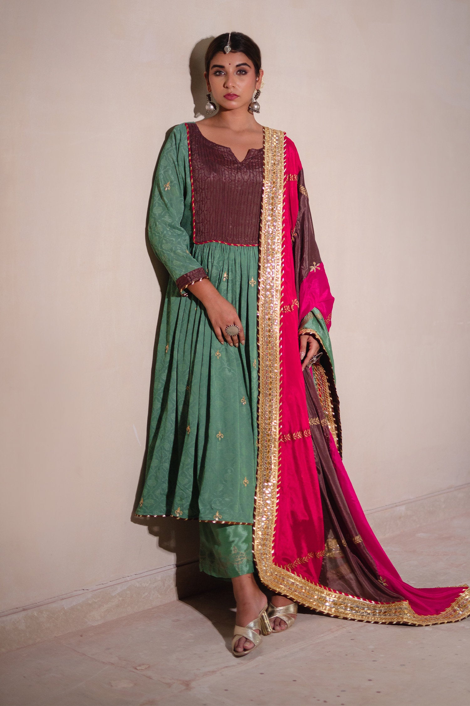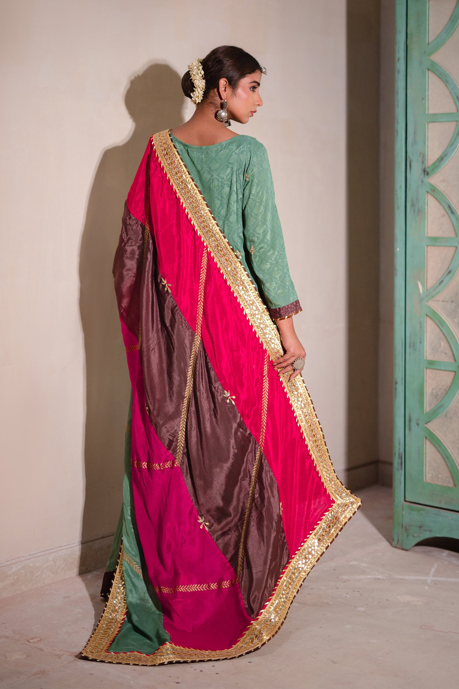 The sea green and multicolour gota patti chinon suit and palazzo set for a beautiful way of dressing with elegance and beauty with a stylish look.