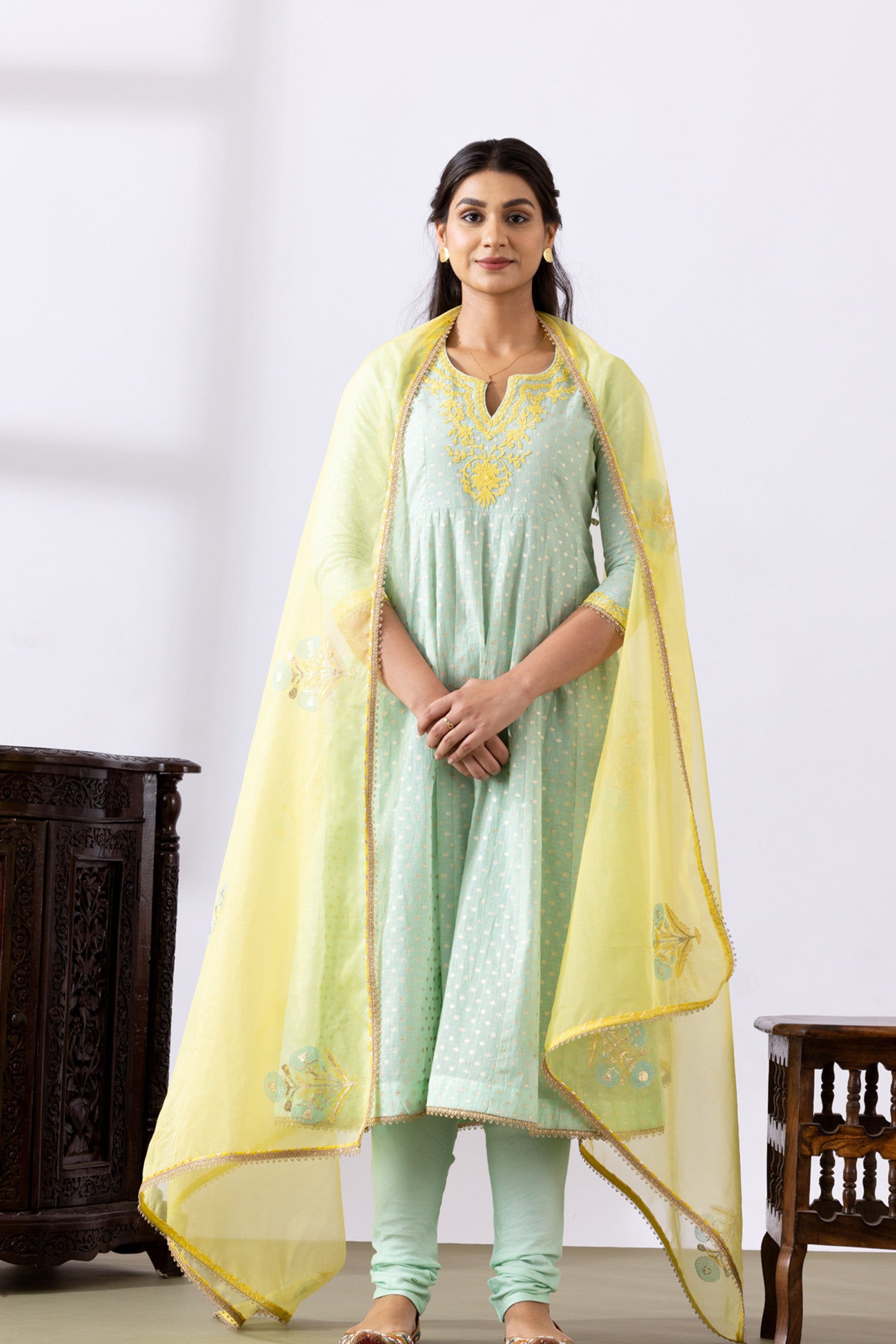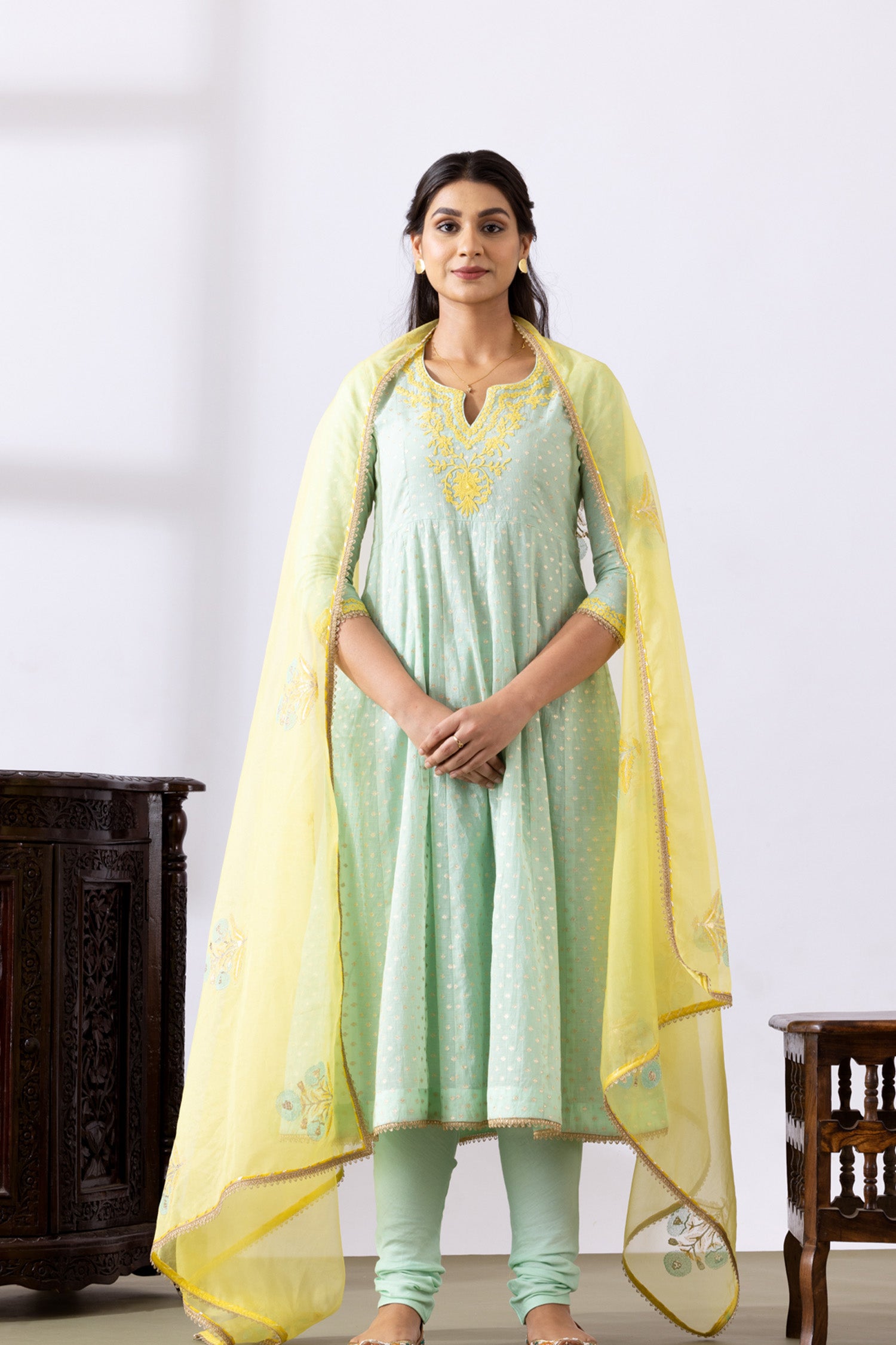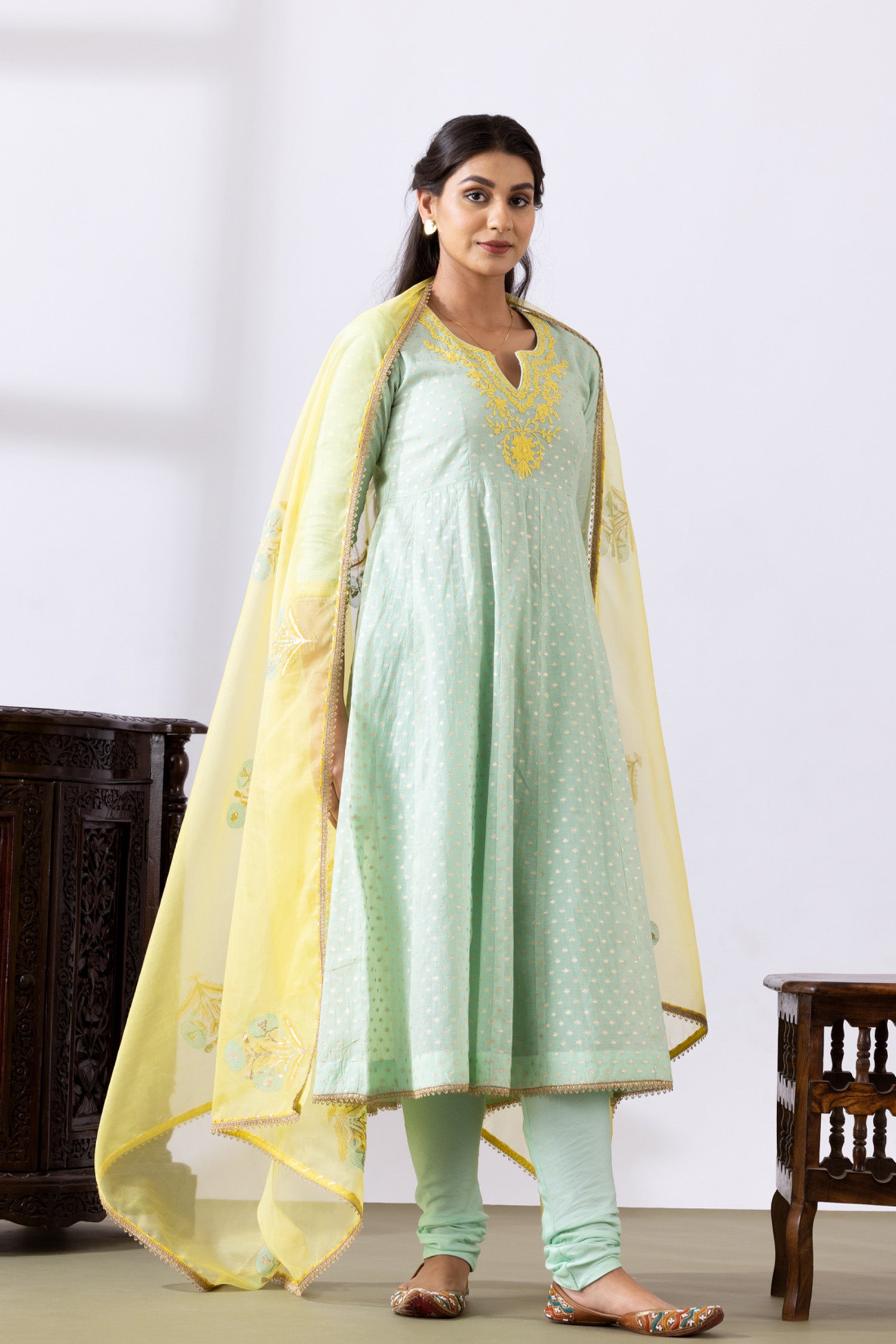 Sea Green Dori Embroidery Chanderi Anarkali Churidar Set