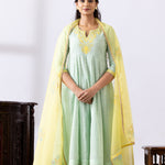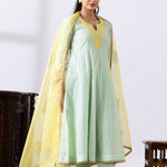 The Dori Embroidered Green Chanderi Anarkali with matching Cotton churidar and a contrast Organza dupatta for an Ethnic and elegant look.