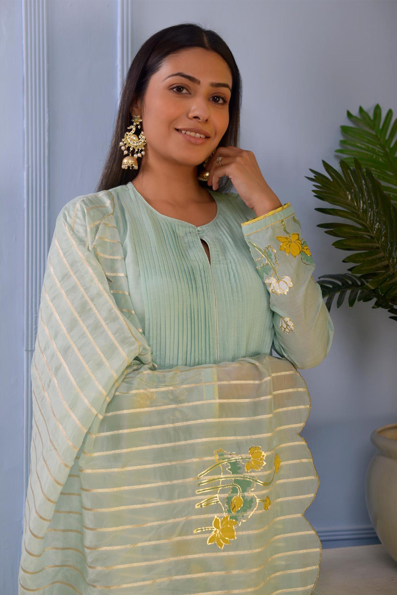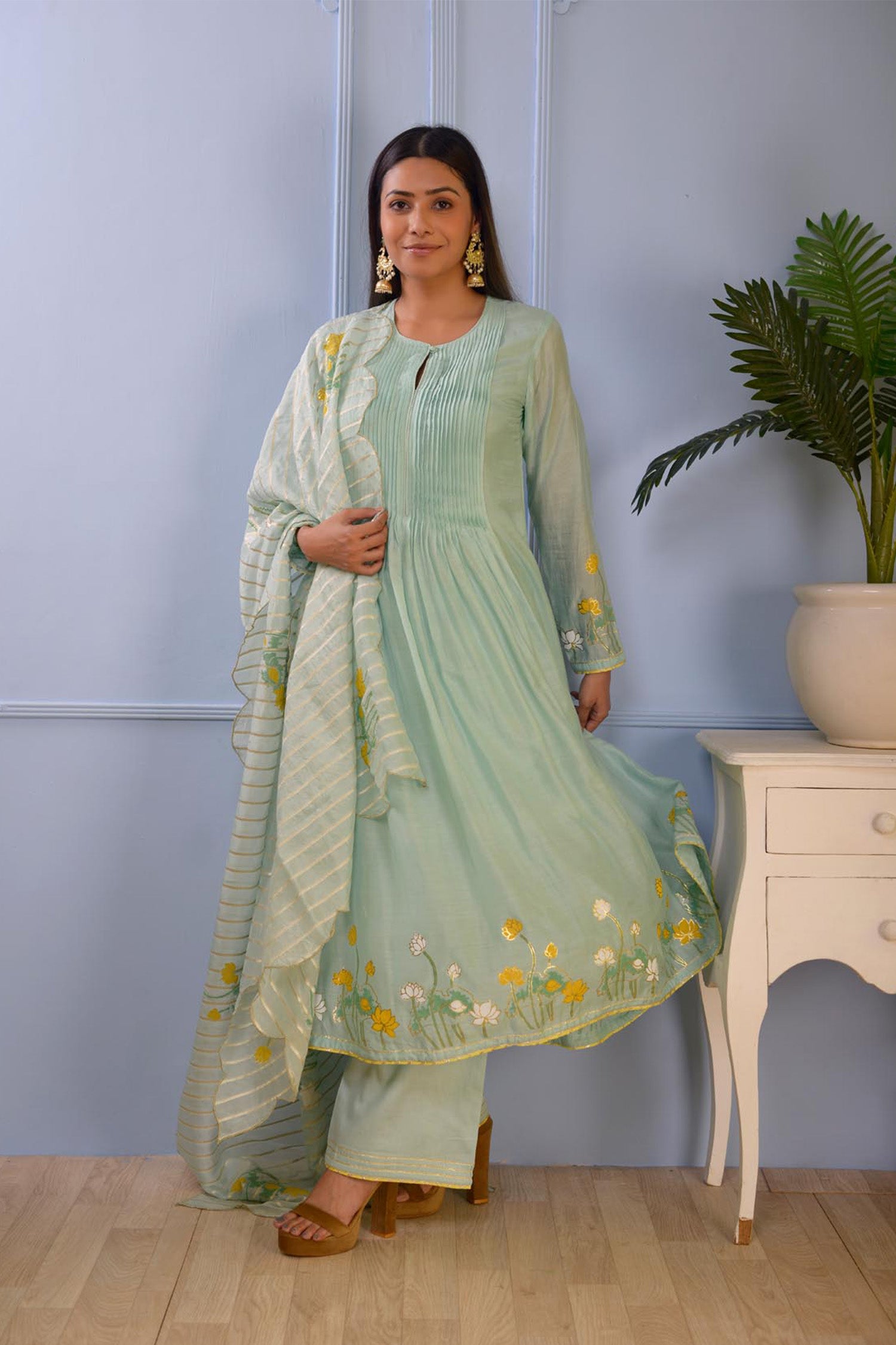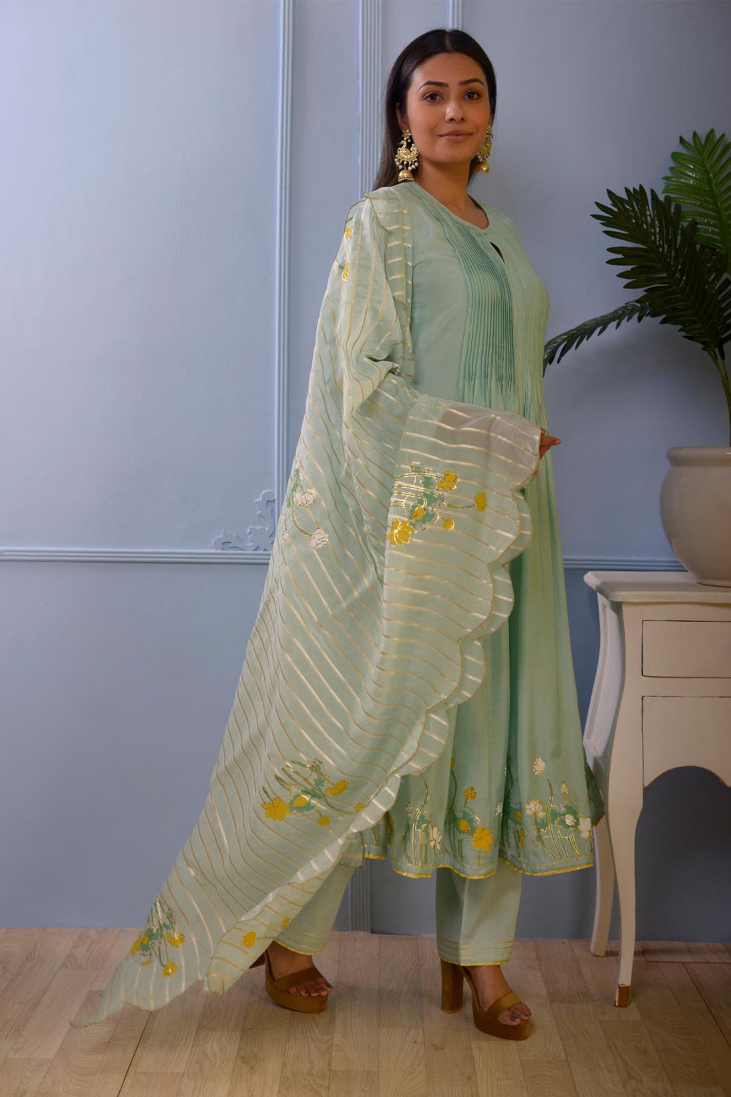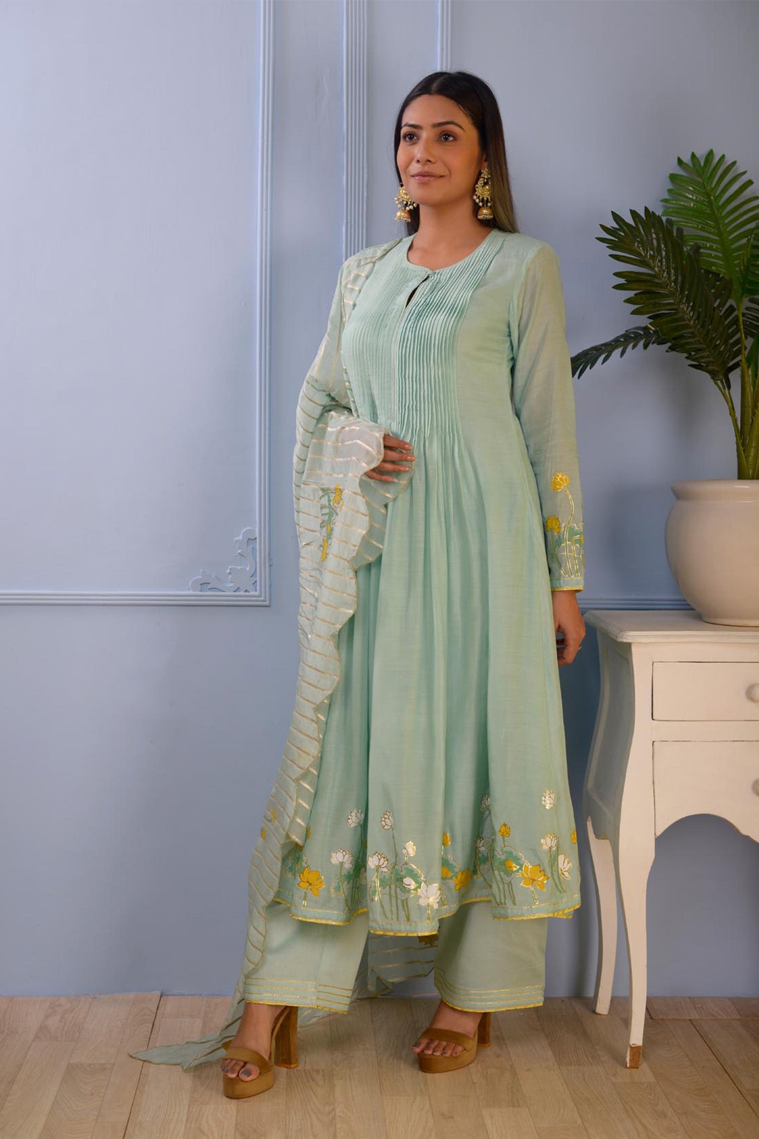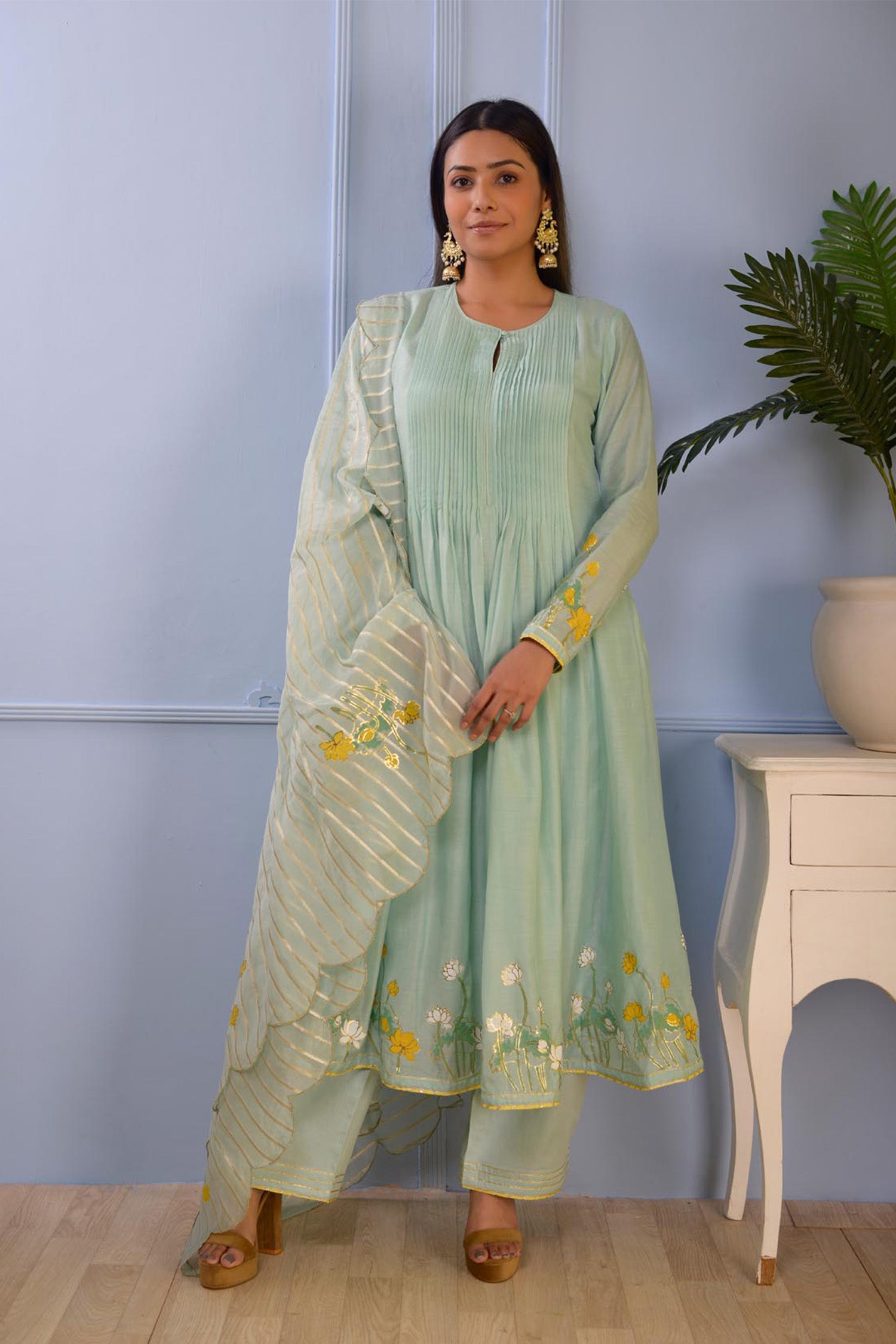 The Anarkali set includes a Foil Print Cotton Silk Kurta , Gotta Finished Pant and a Banarasi Strip Dupatta for an elegant look with subtle floral design.