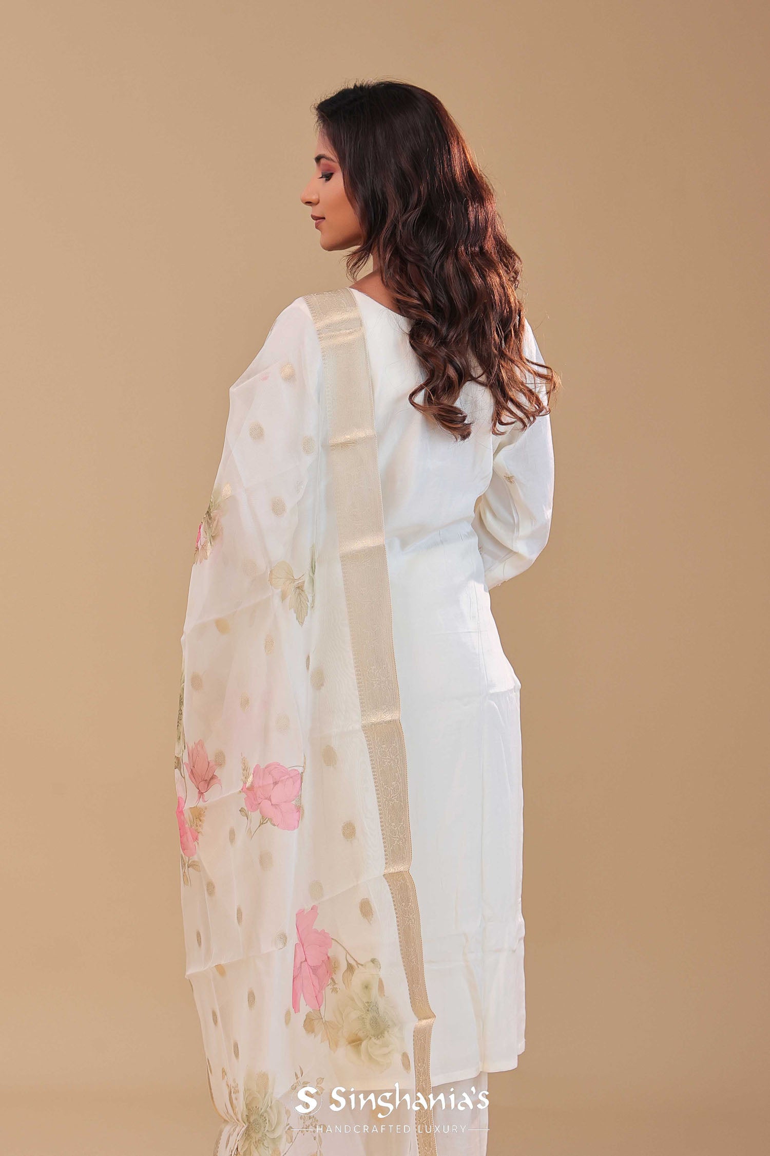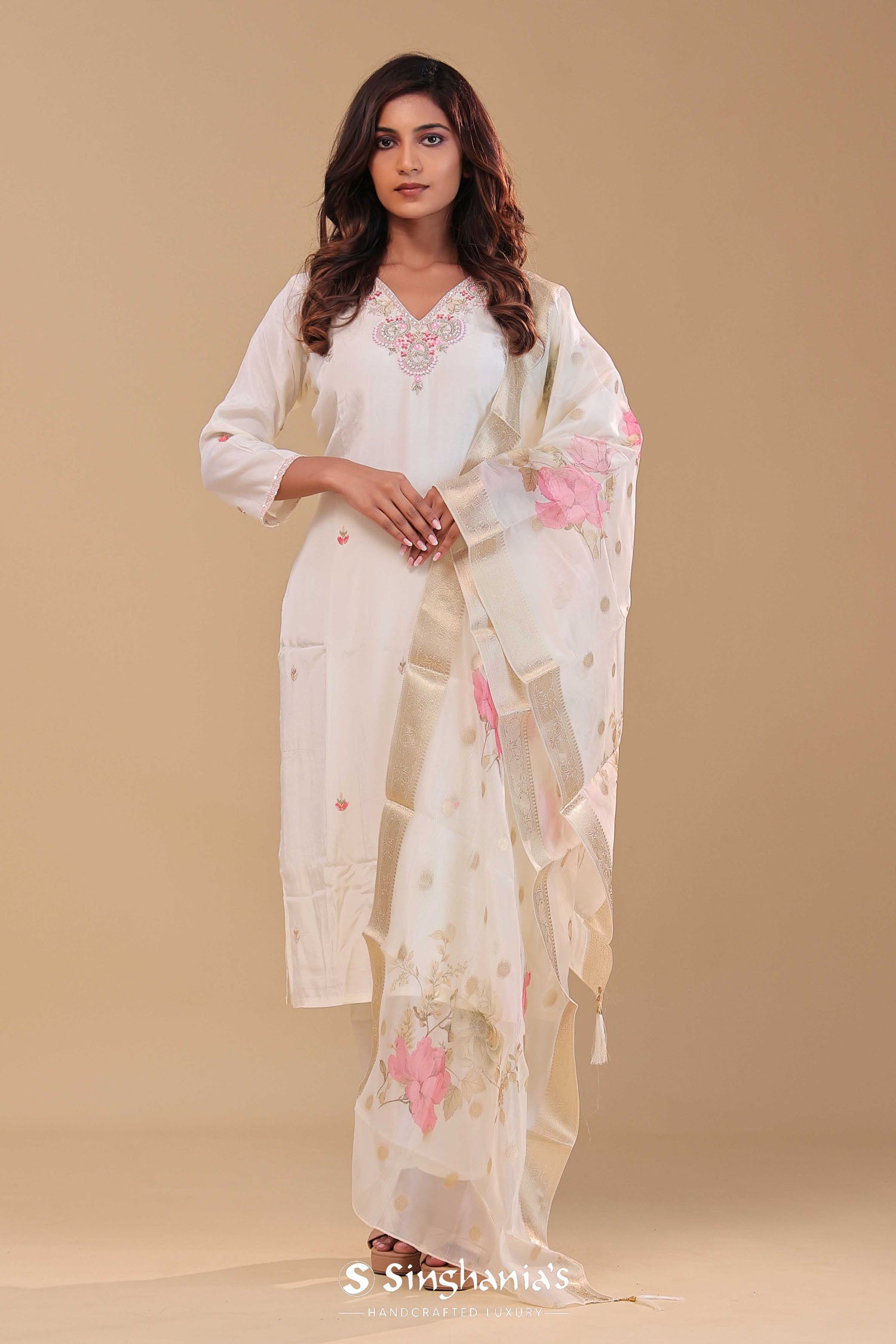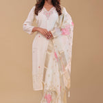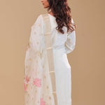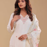 Simple white chanderi kurta set features mid-forearm sleeves and embroidery work around the V neckline and butti's along with straight pant .The organza dupatta adorned with banarasi border and floral prints spread across the dupatta