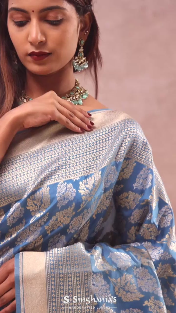 A sky blue Banarasi silk saree, richly woven with lavish gold and silver zari weaving on floral buttis . The pleasing sky blue fabric is a perfect canvas for the shimmering gold and silver zari, creating a stunning interplay of classic and modern elegance