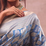 Sky Blue Banarasi Silk Saree With Gold And Silver Zari Weaving