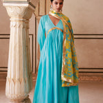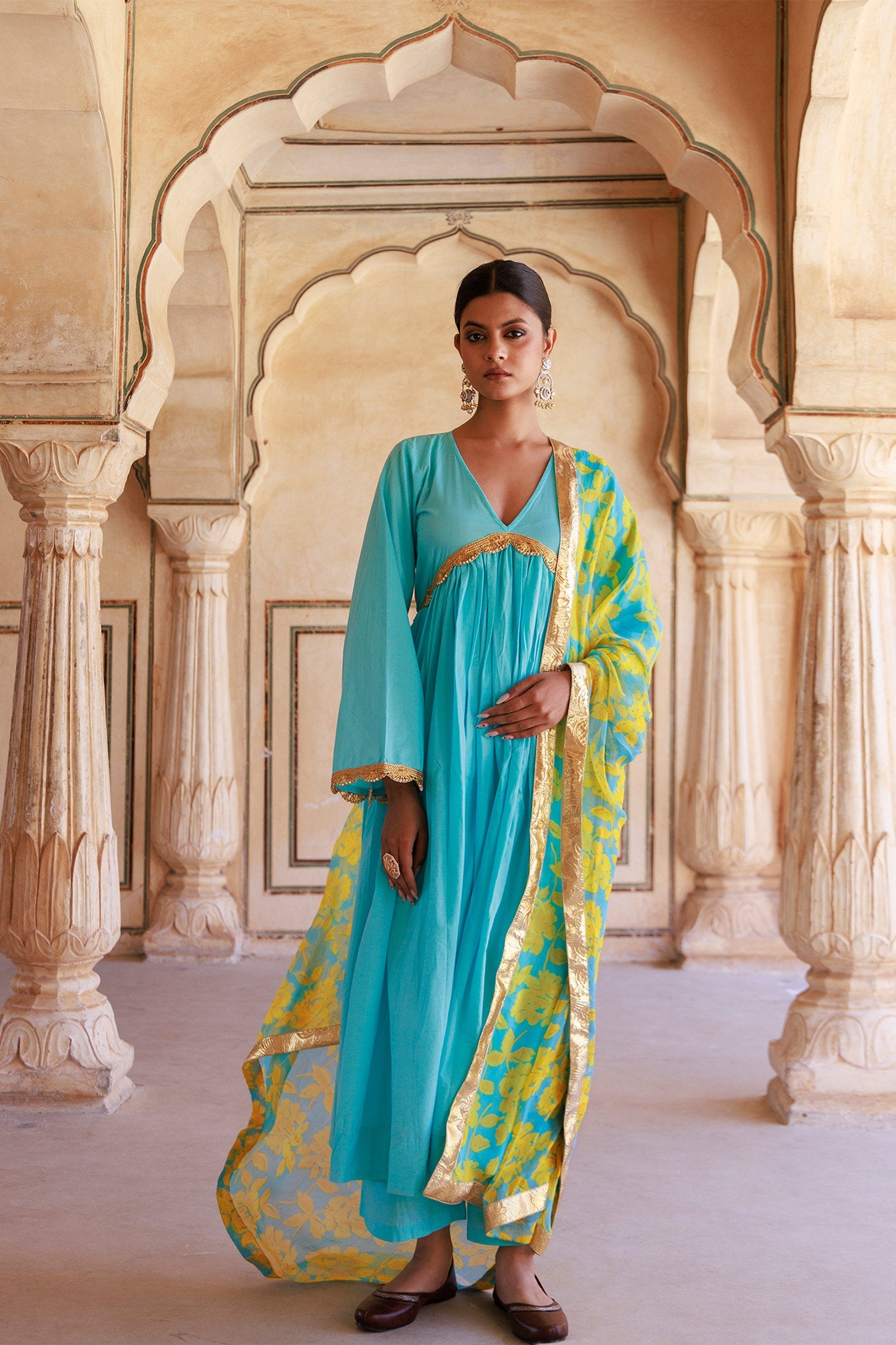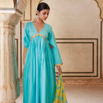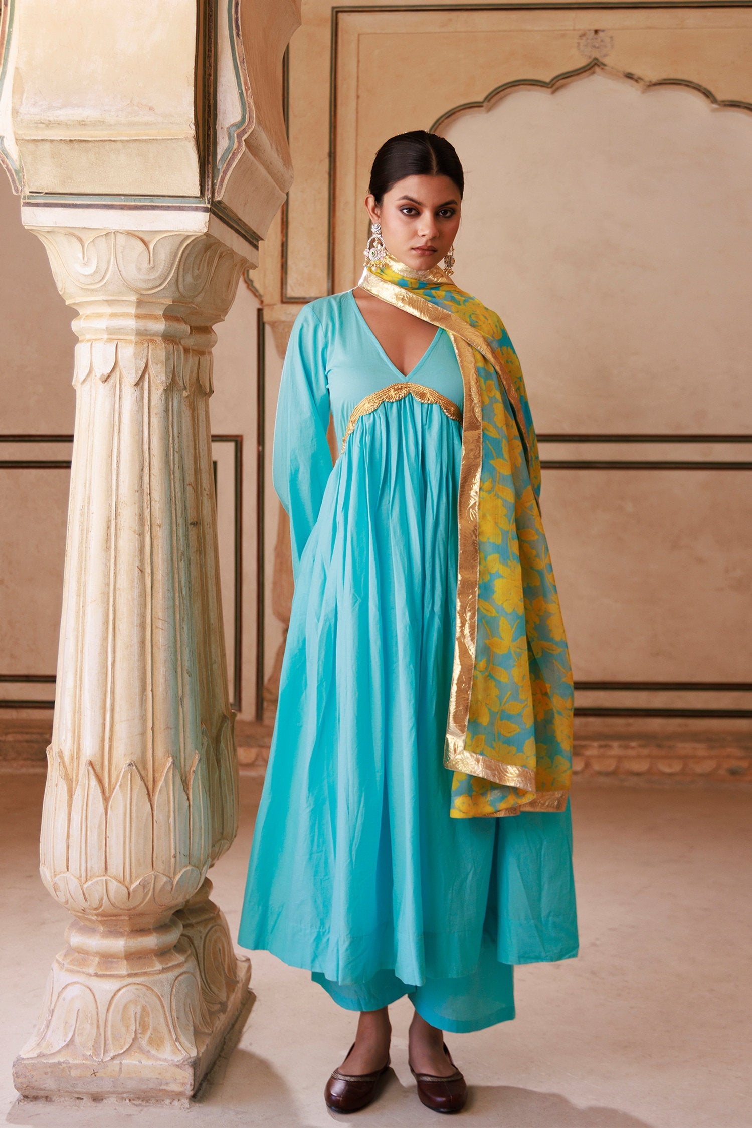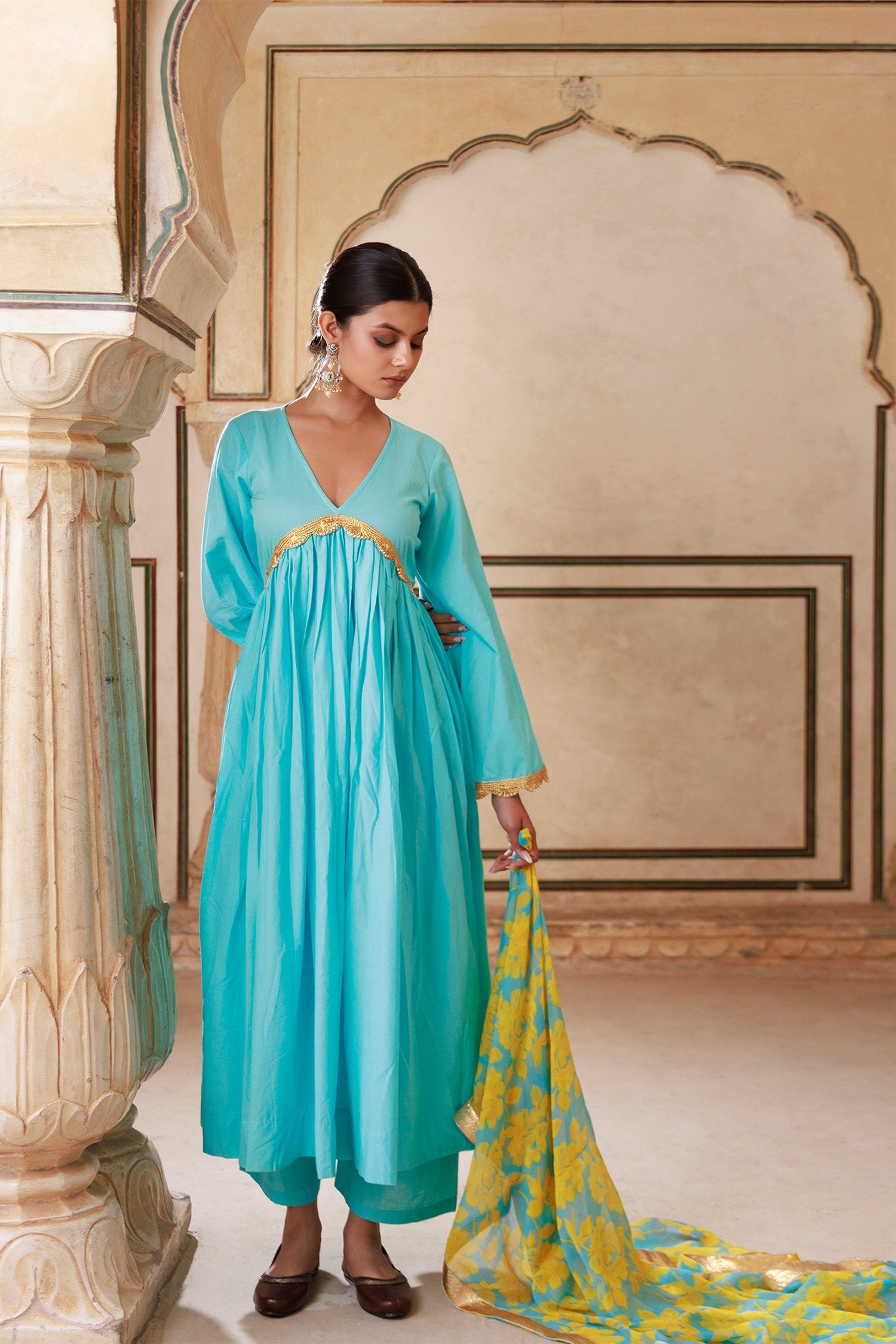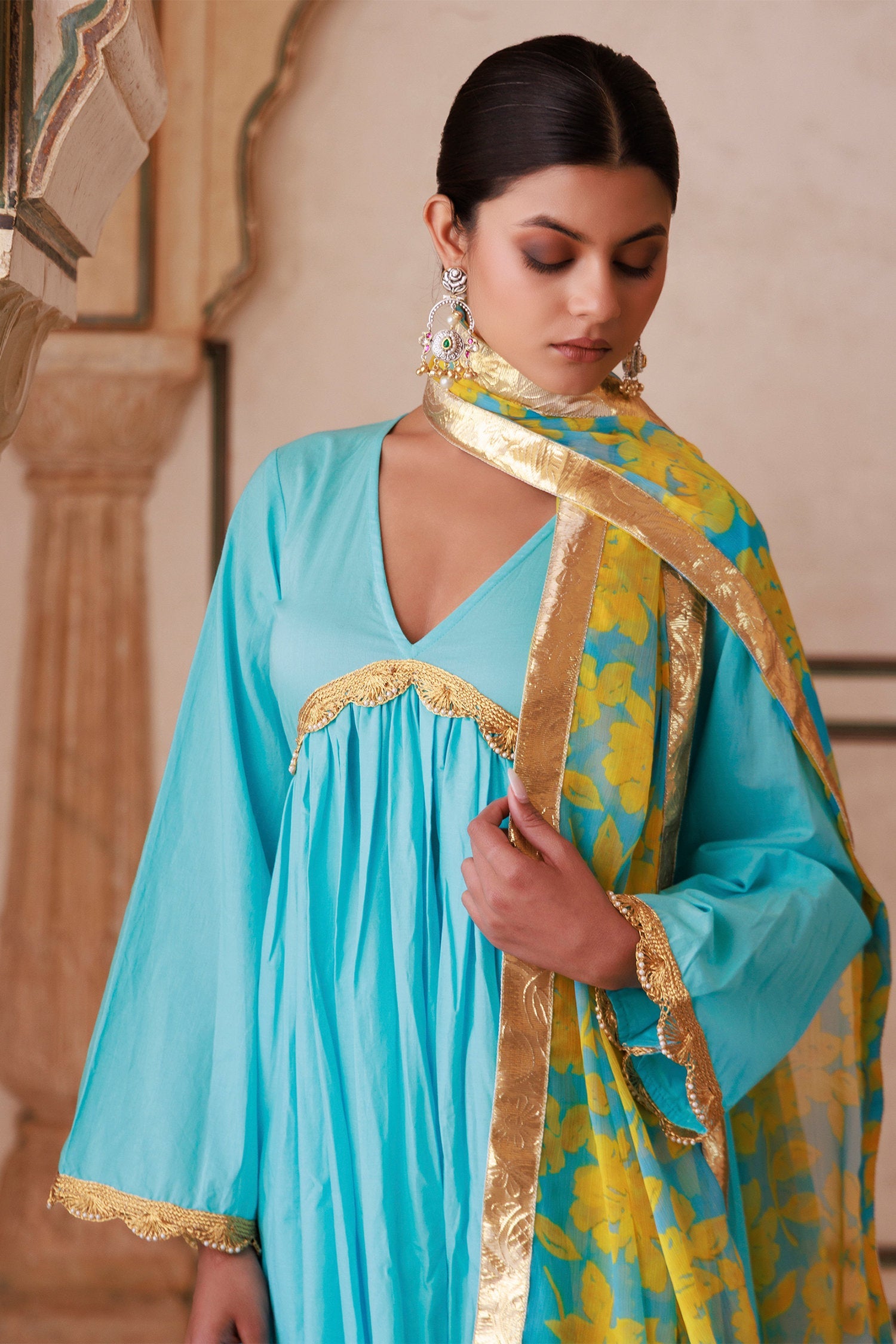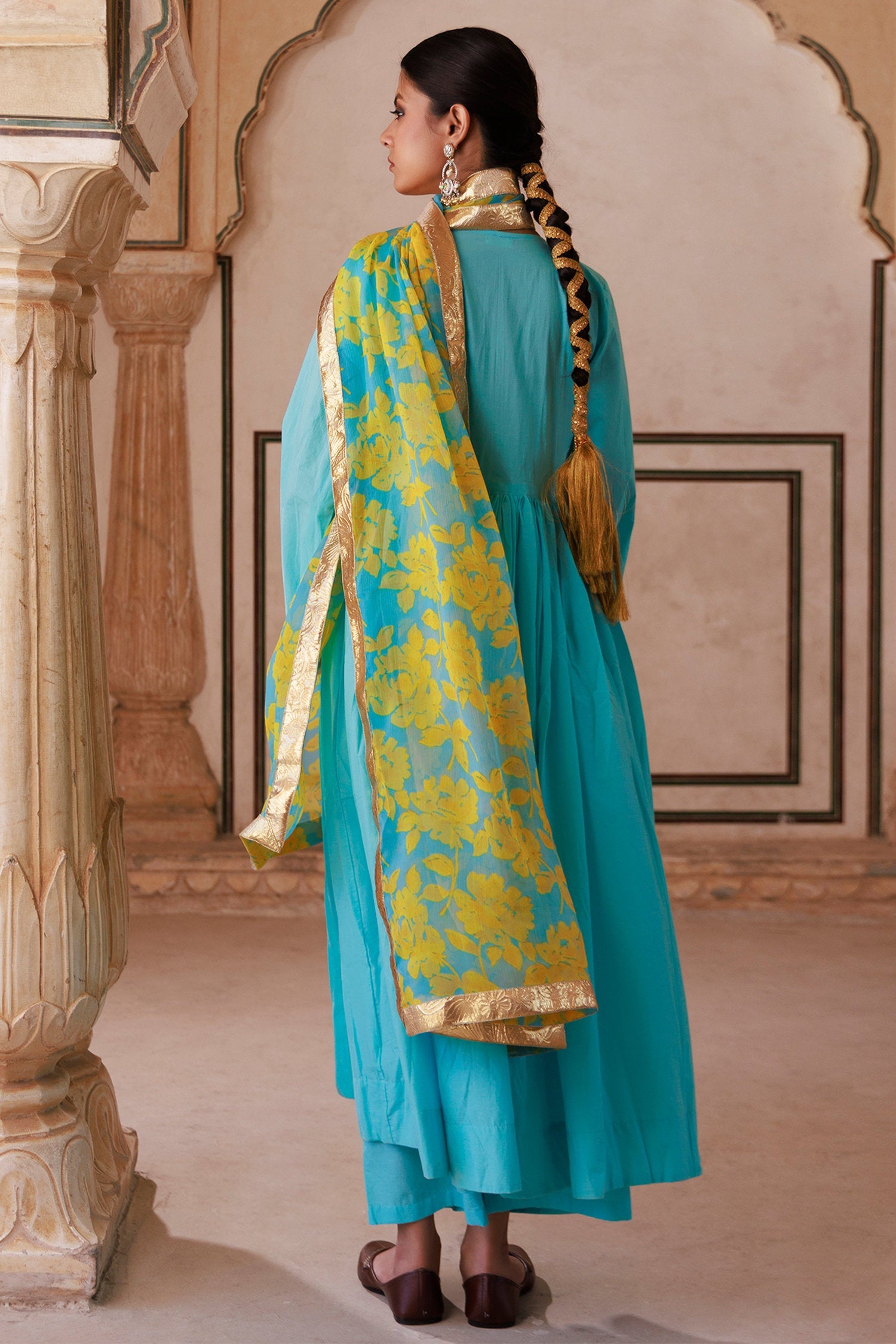 Sky Blue Cotton Kurta Set With Chiffon Dupatta