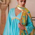 Sky blue cotton kurta set features V neck and full sleeves with matching straight pants along with chiffon printed dupatta with lace border. Making it perfect choice for any event.