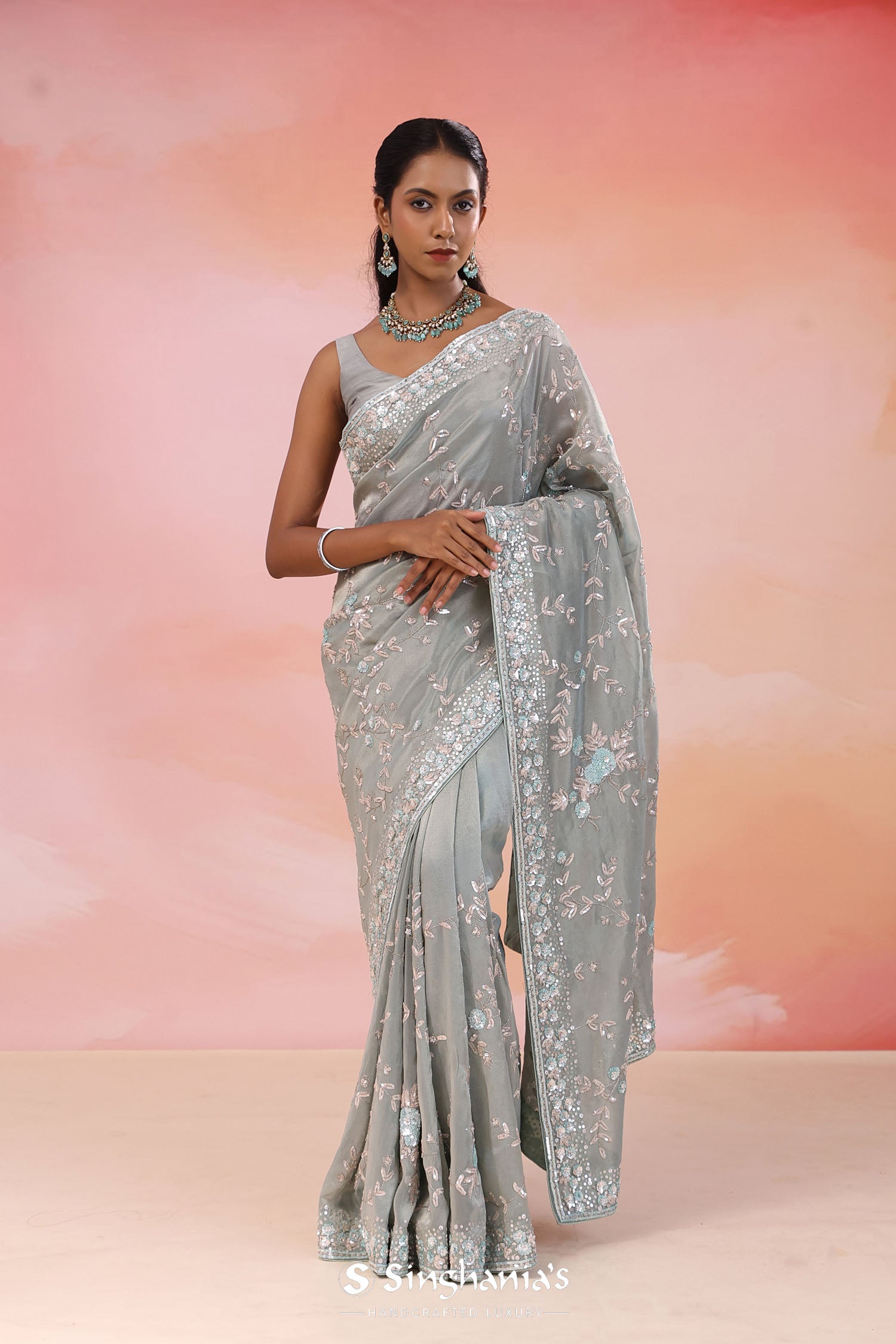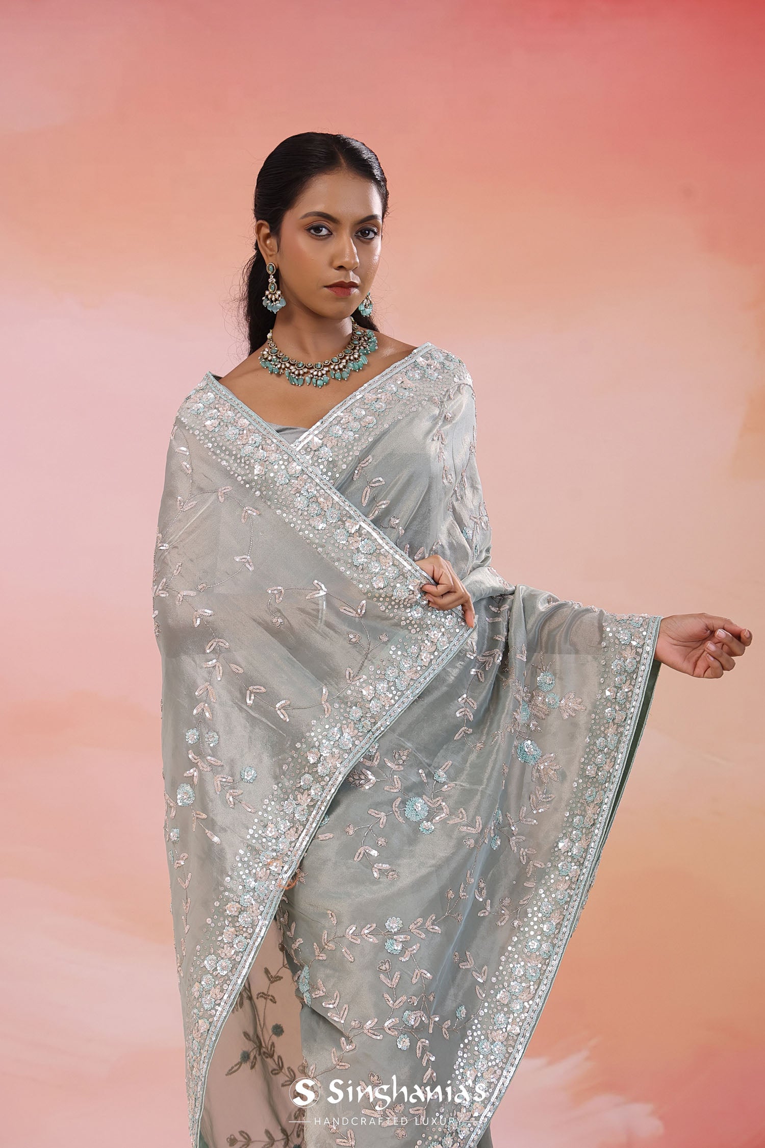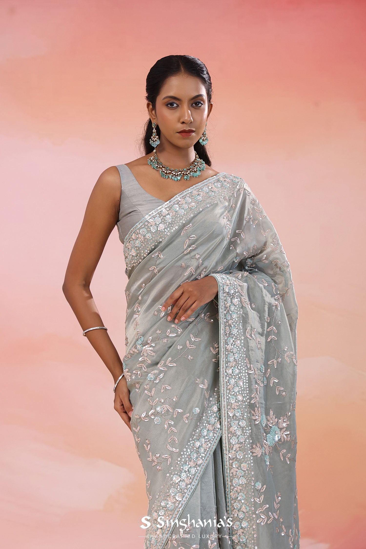 Pair with minimal jewellery and soft makeup to highlight the timeless elegance Singhania’s is known for.