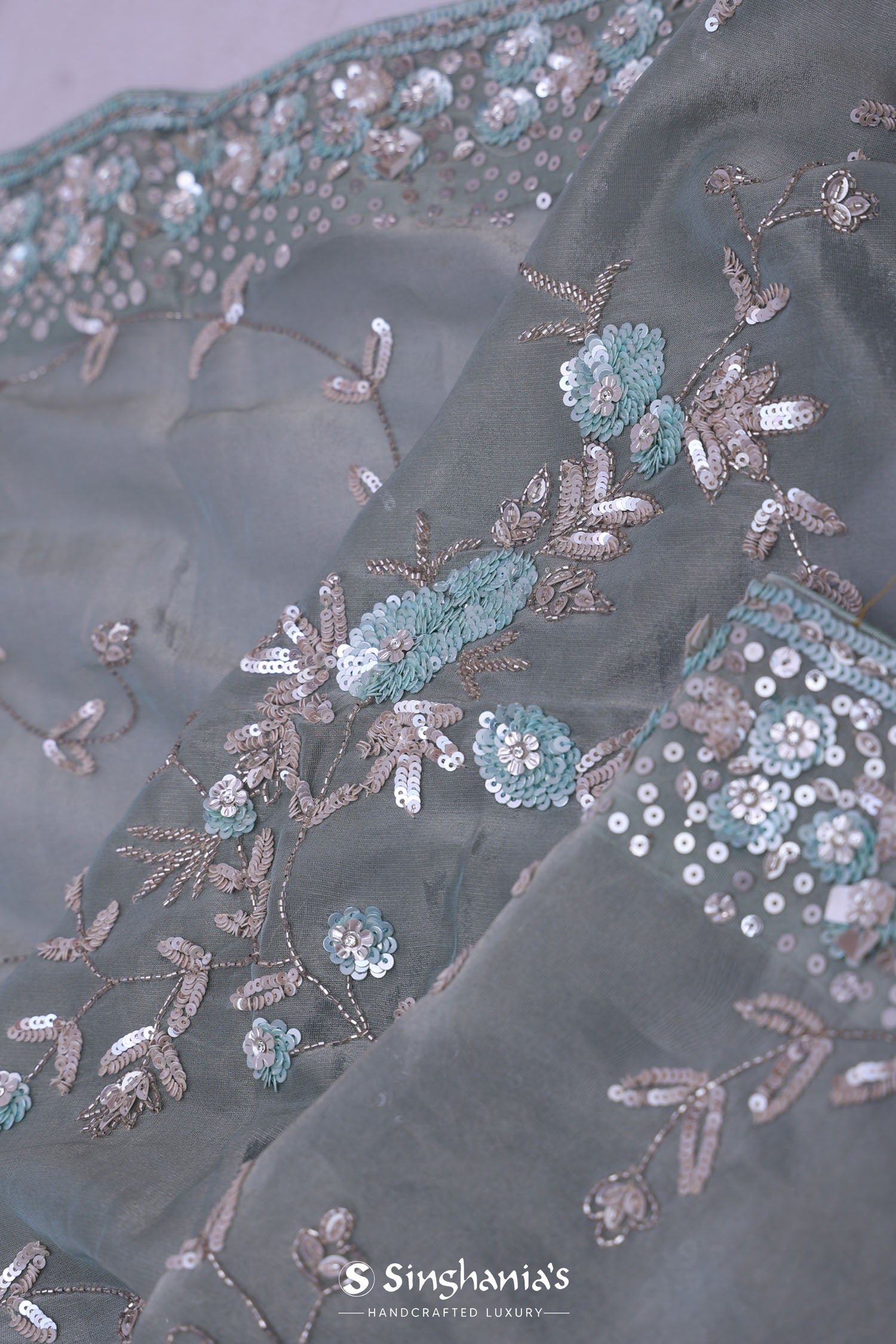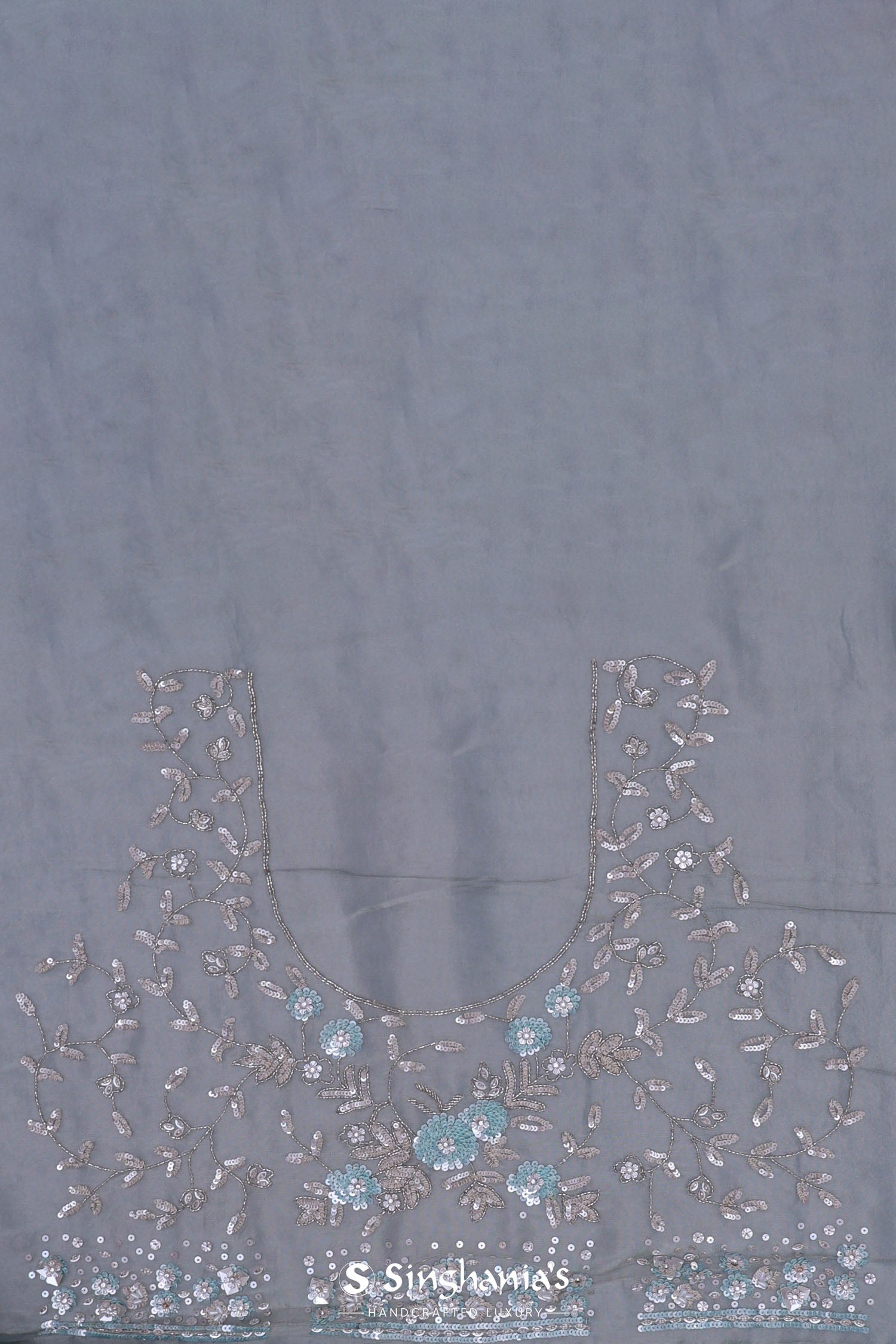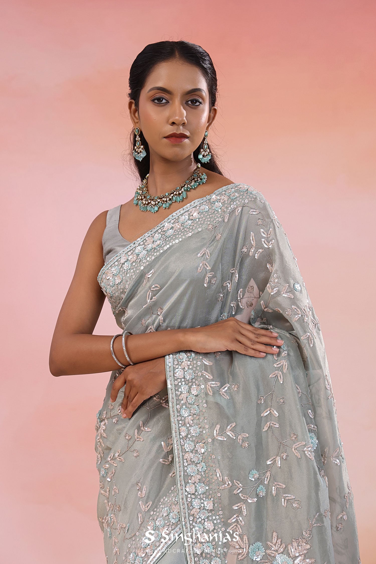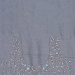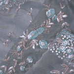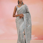 The jaal embroidered with kardana and dyeable sequins work spread all across the body of Smokey gray georgette tissue saree complemented with fancy embroidered border and unstitched blouse