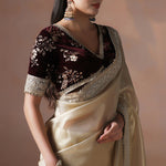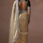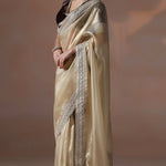 The soft golden solid silk saree with embroidered border and stitched embroidered blouse for a stunning stylish look with graceful touch.