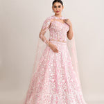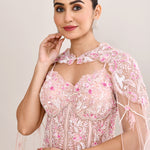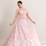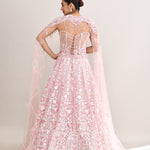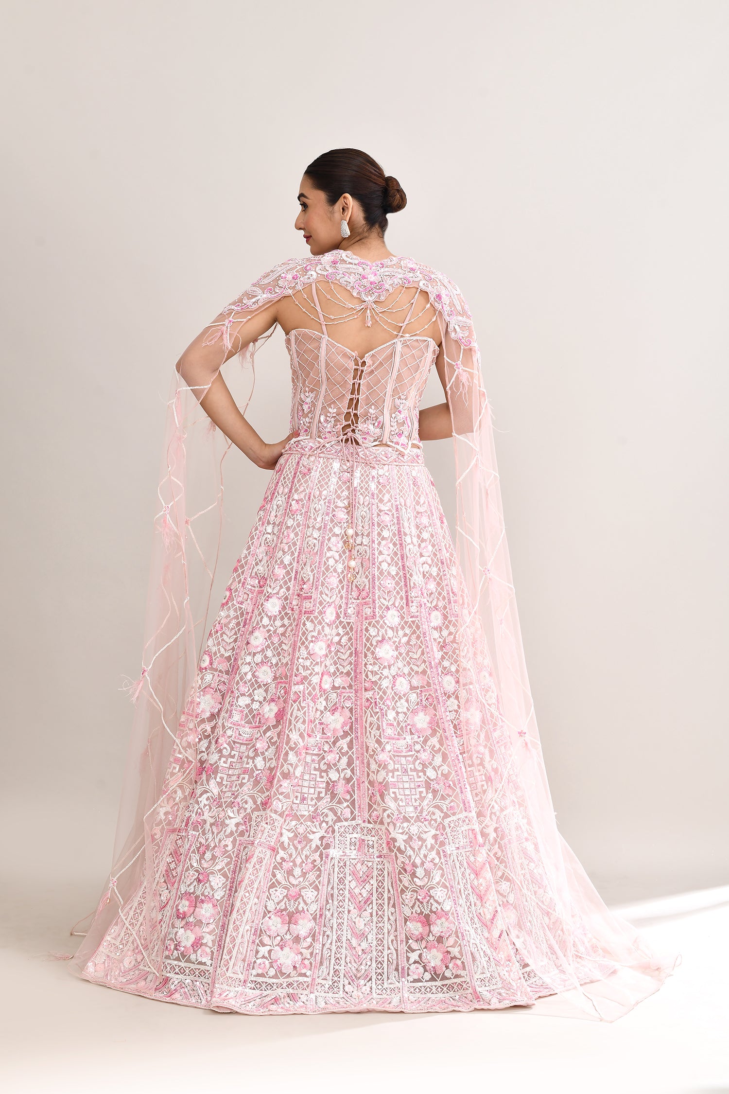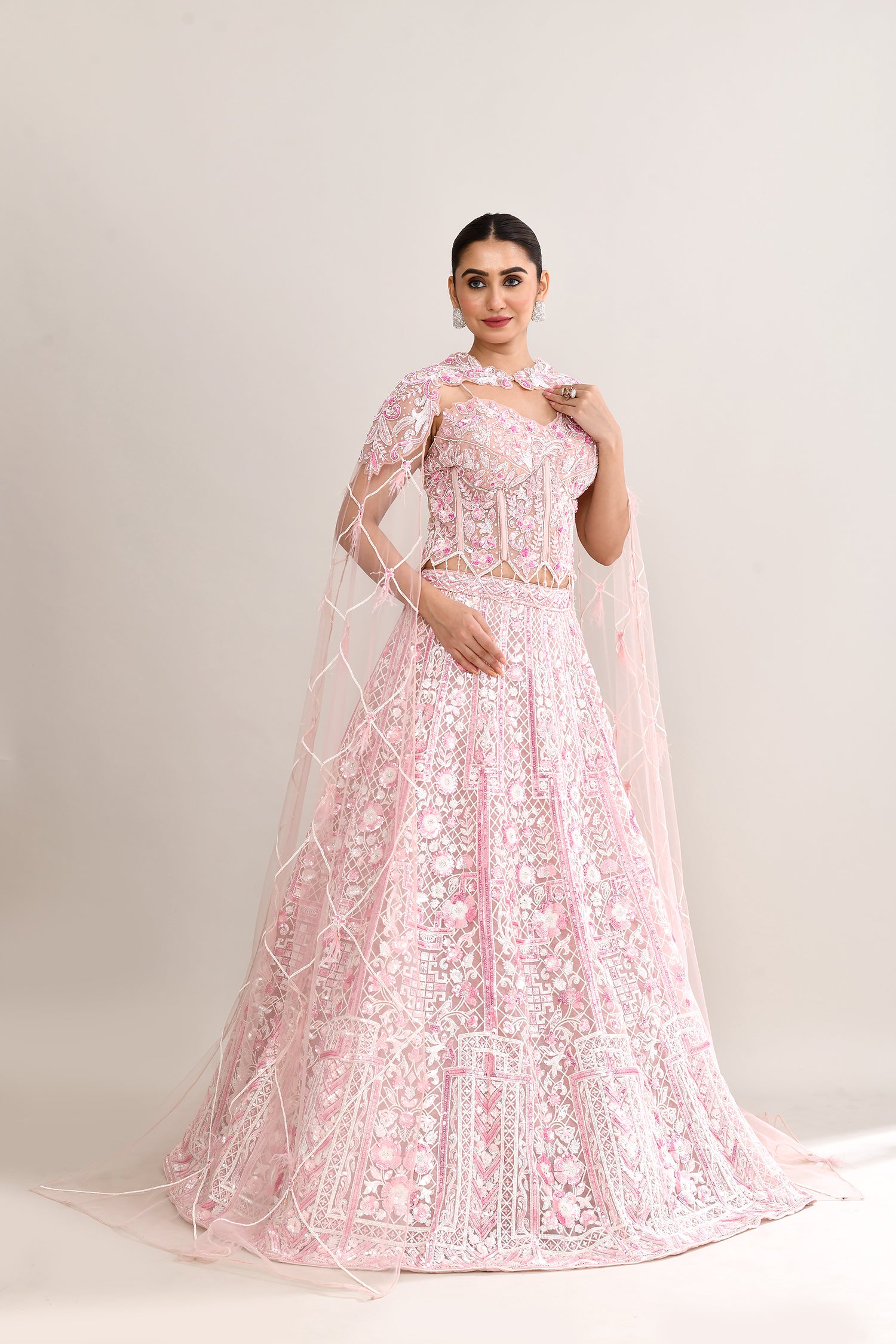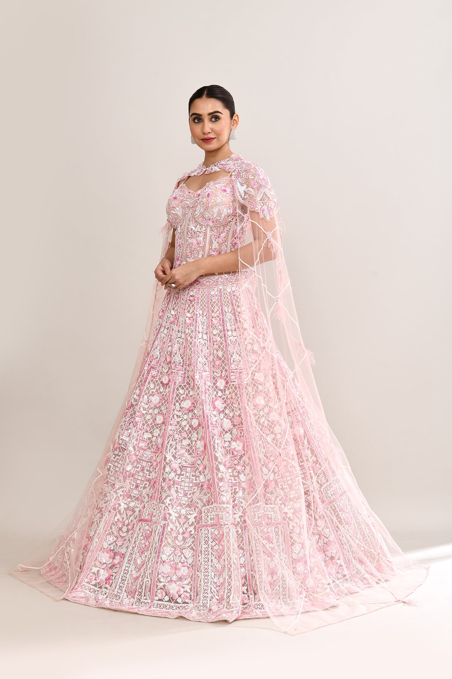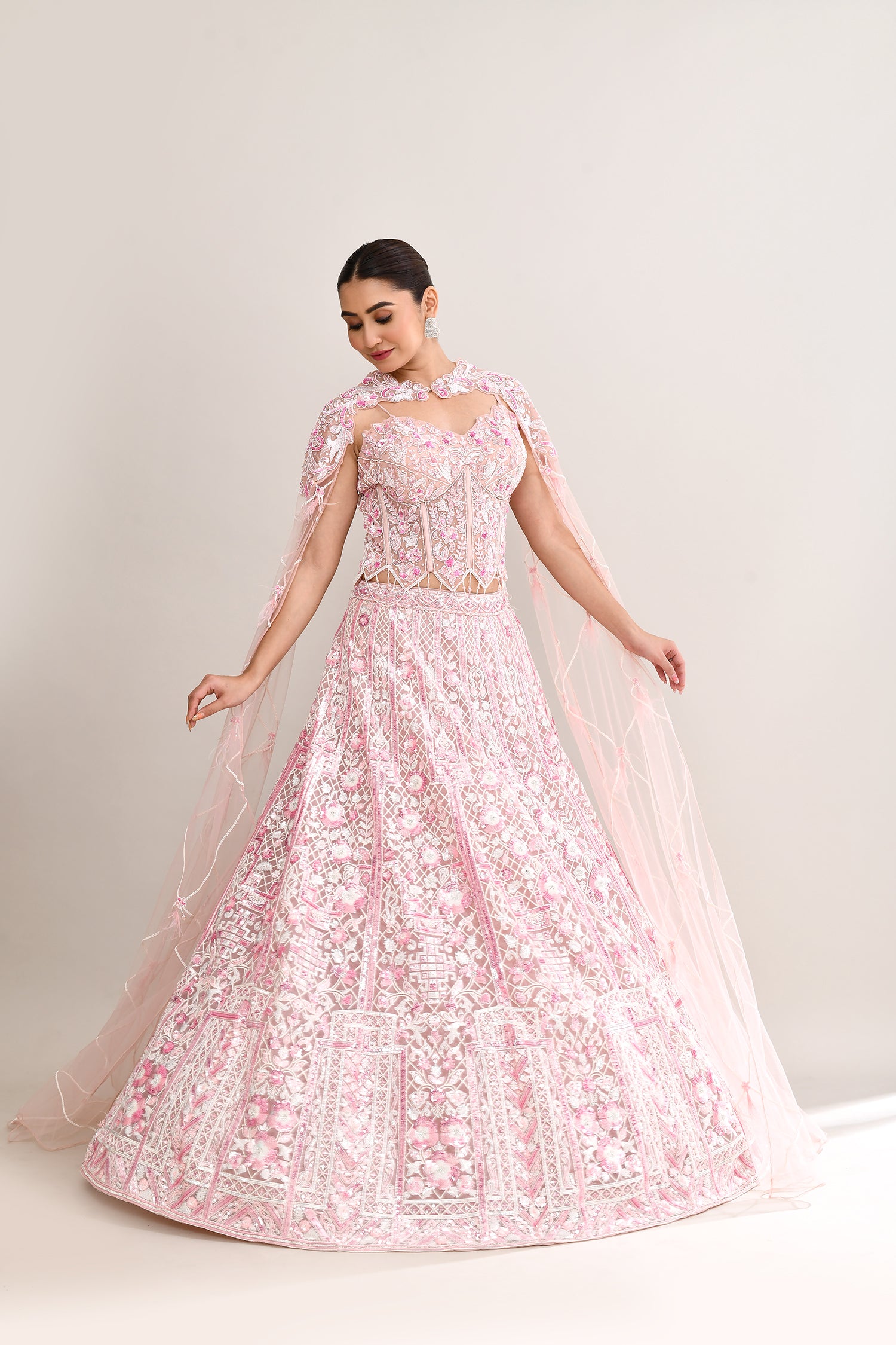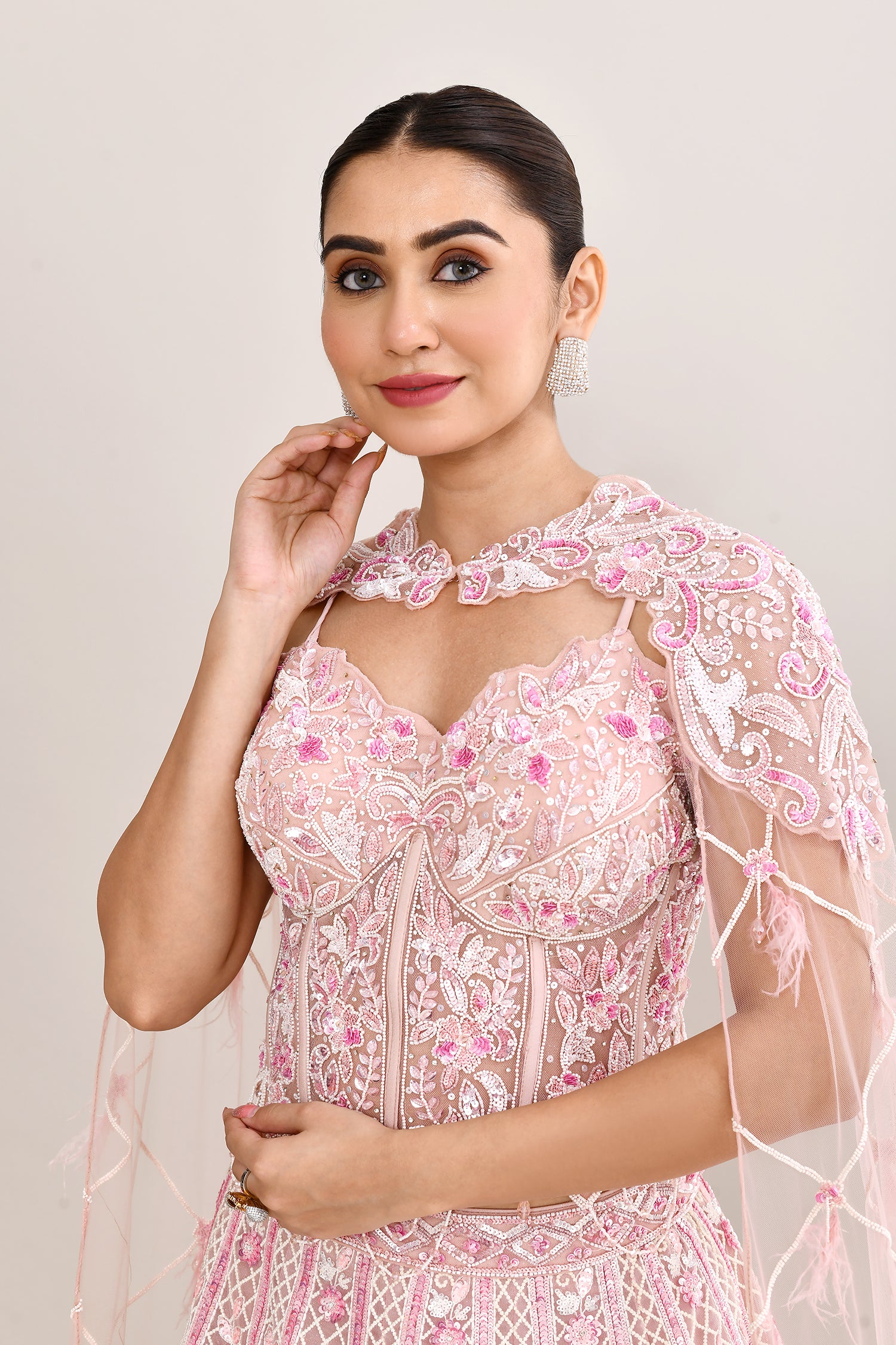 The soft pink net lehenga set with hand embroidered pearl and sequin work along with a choker cape style dupatta for a gorgeous look with elegance.