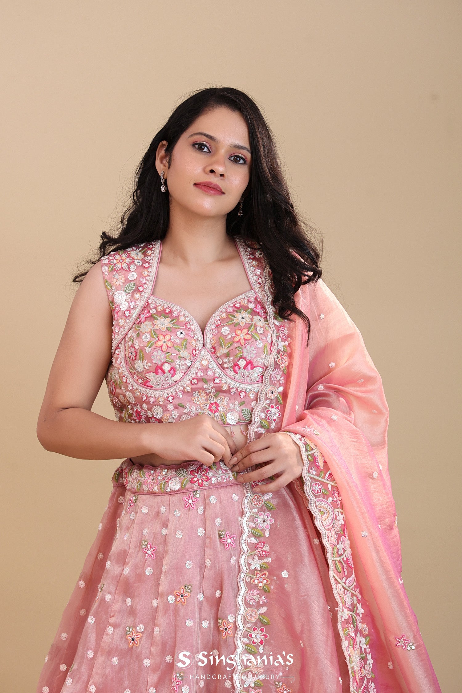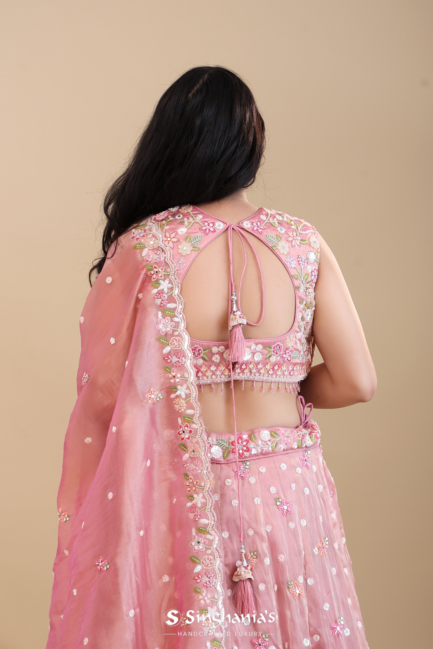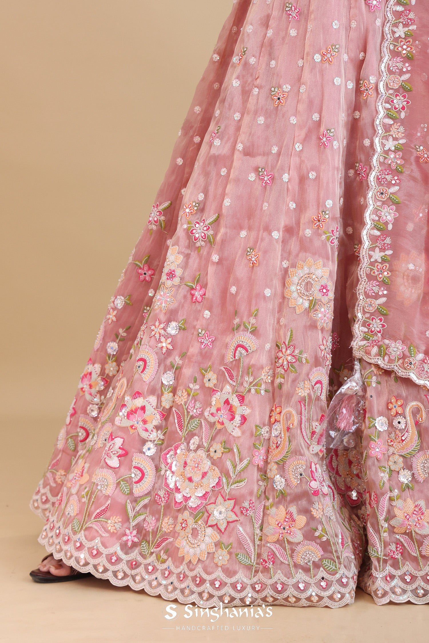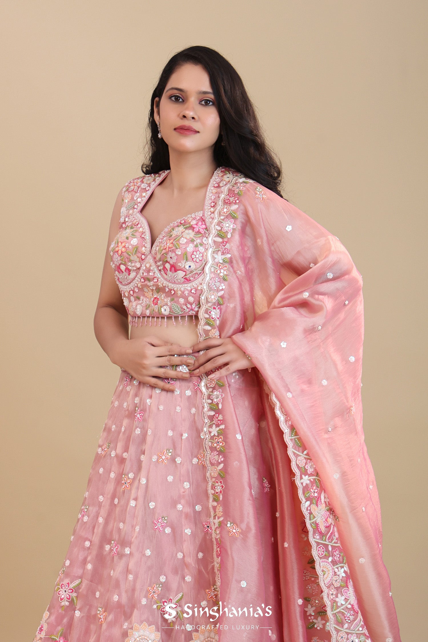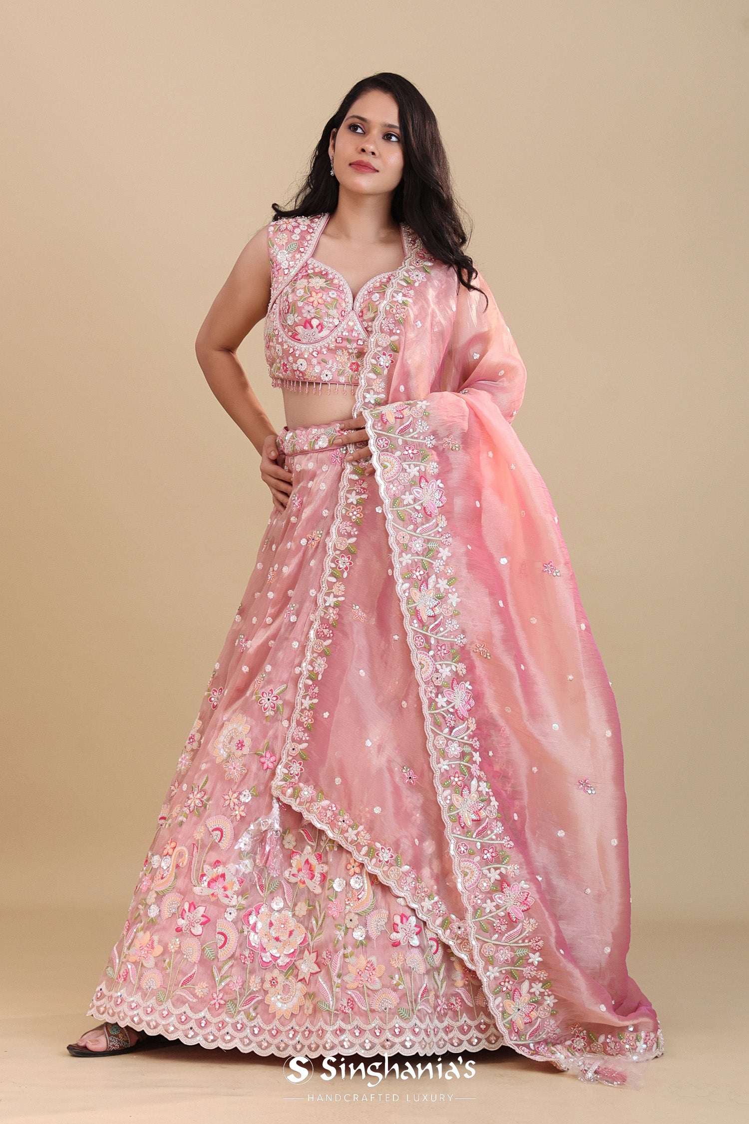 This sweetheart neck sleeveless blouse of Soft pink organza tissue lehenga set adorned with intricate embroidery work forming floral designs along with the hangings at the hem of blouse. The lehenga is embellished with floral designs and sequins work complemented with dupatta with scallop border with similar sequins and embroidery work across the border