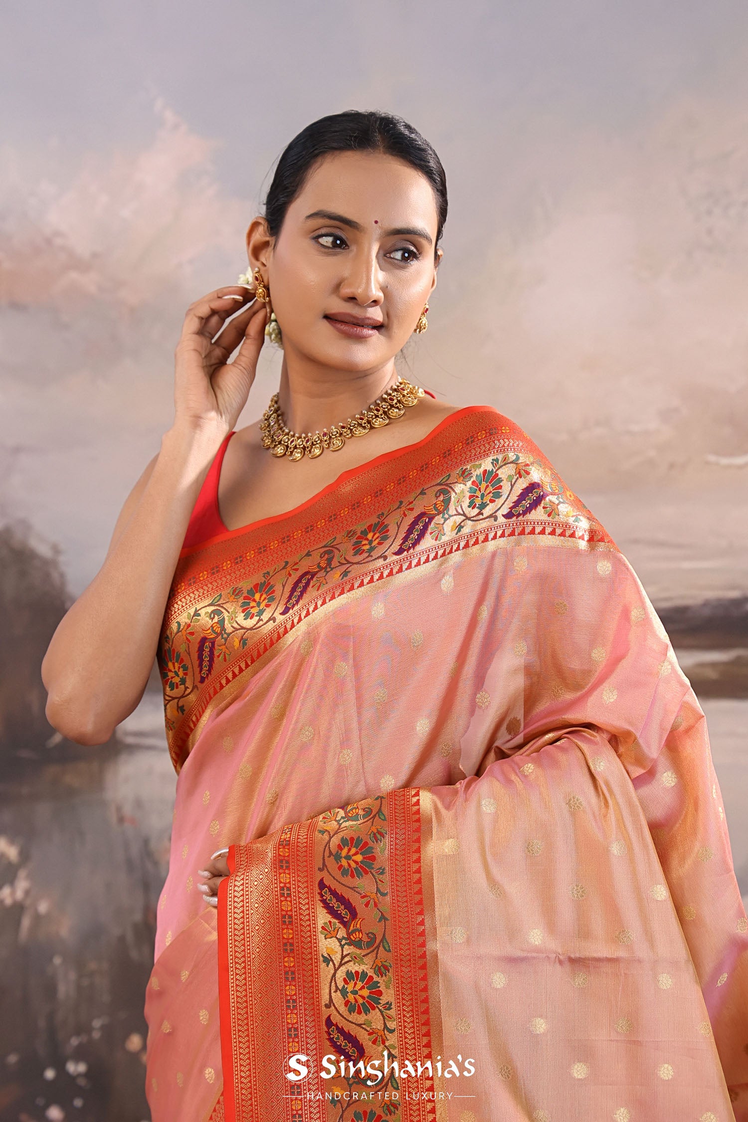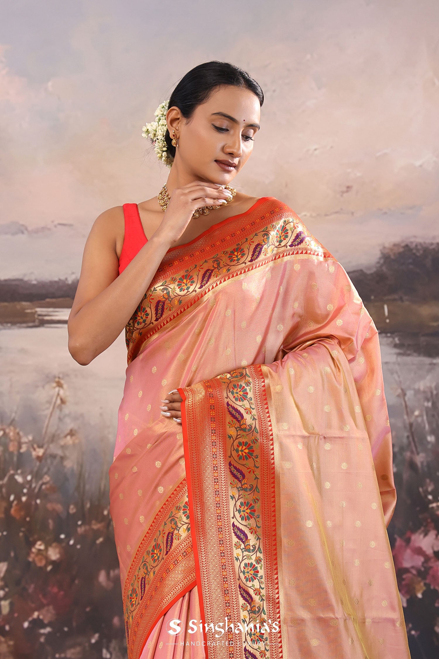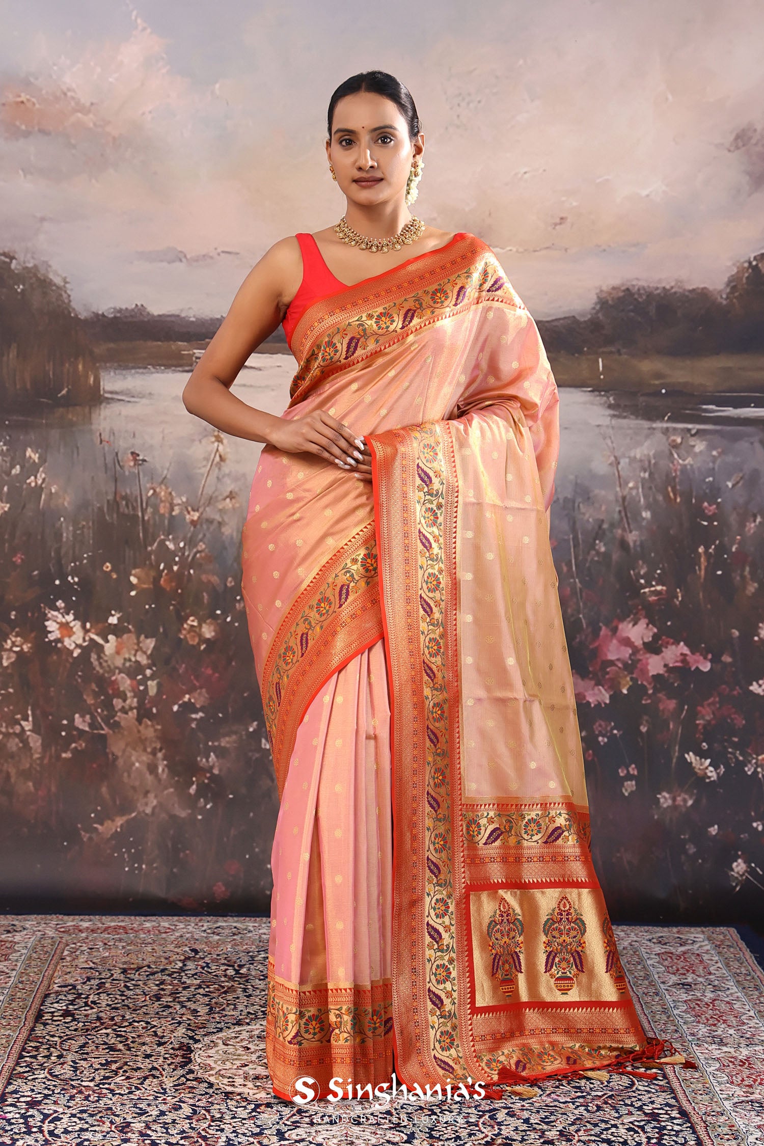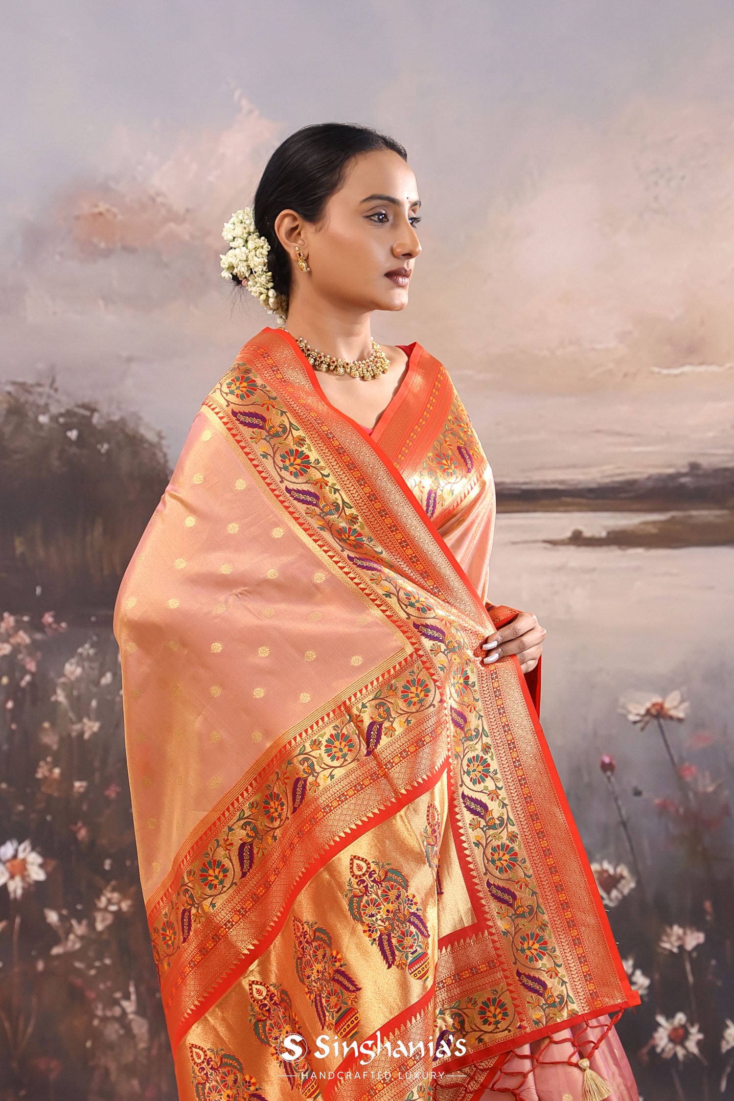 The butti's woven with gold zari scattered on body of Soft pink paithani tissue saree complemented with contrast red paithani border along with floral design which is adding the charm to overall look.