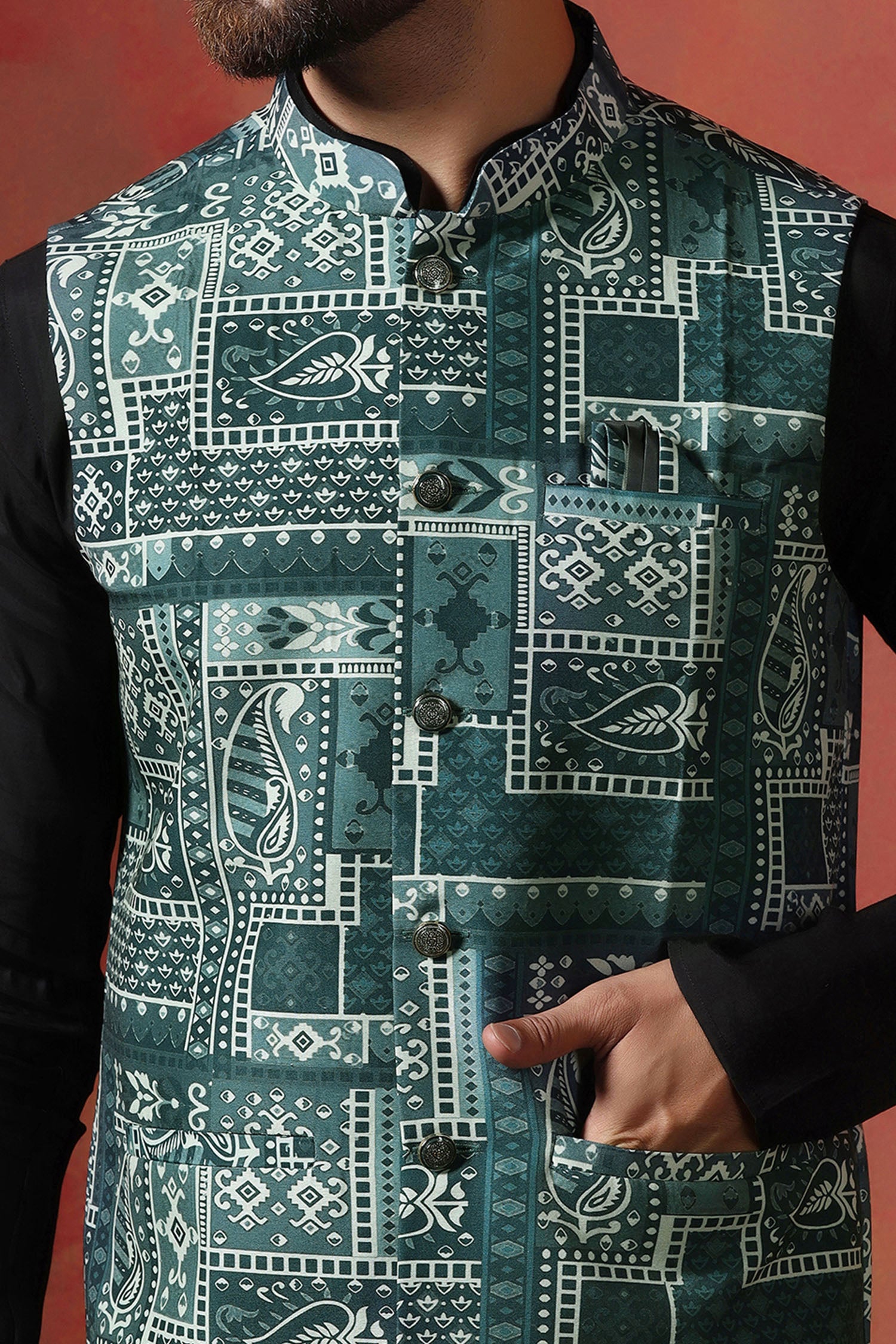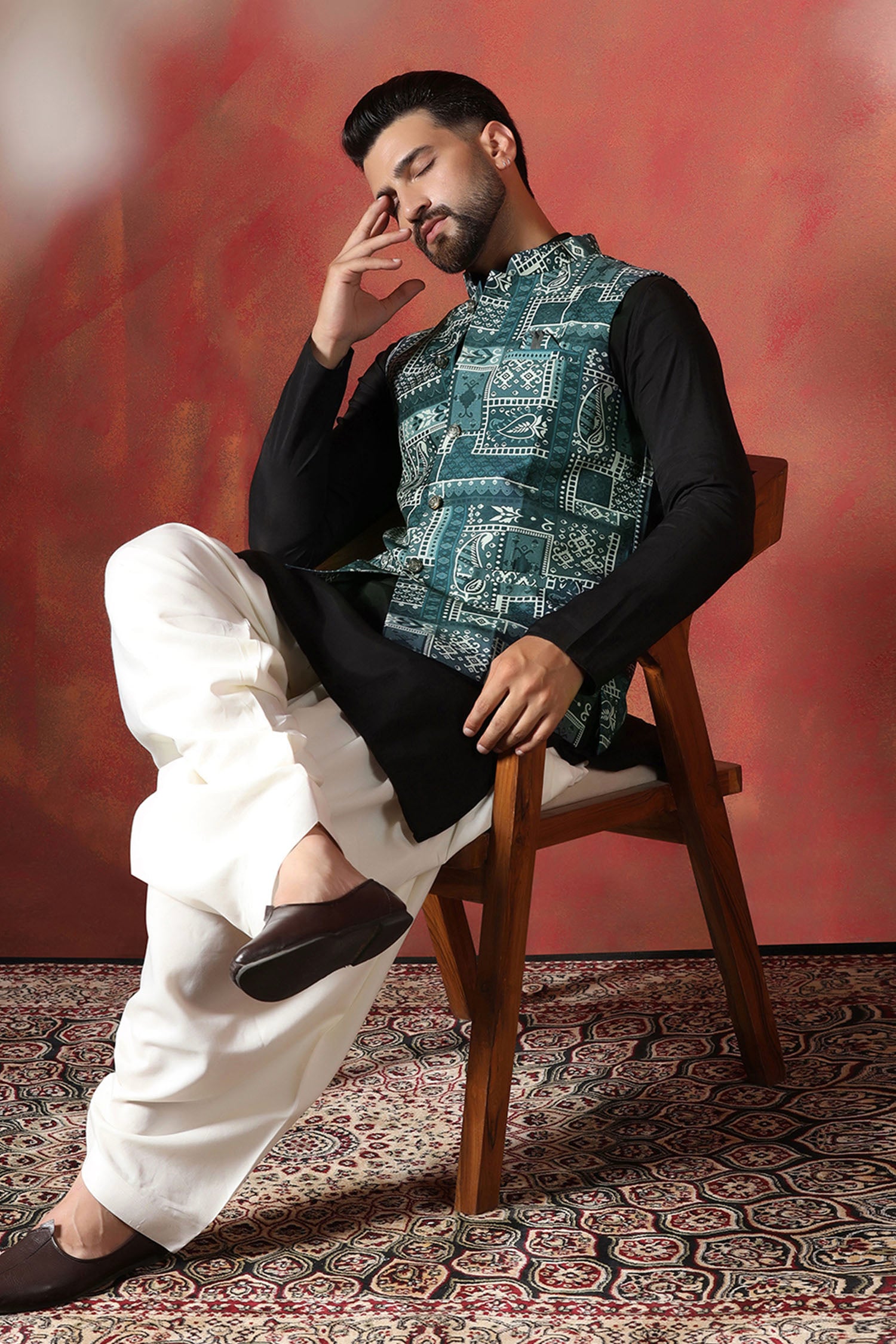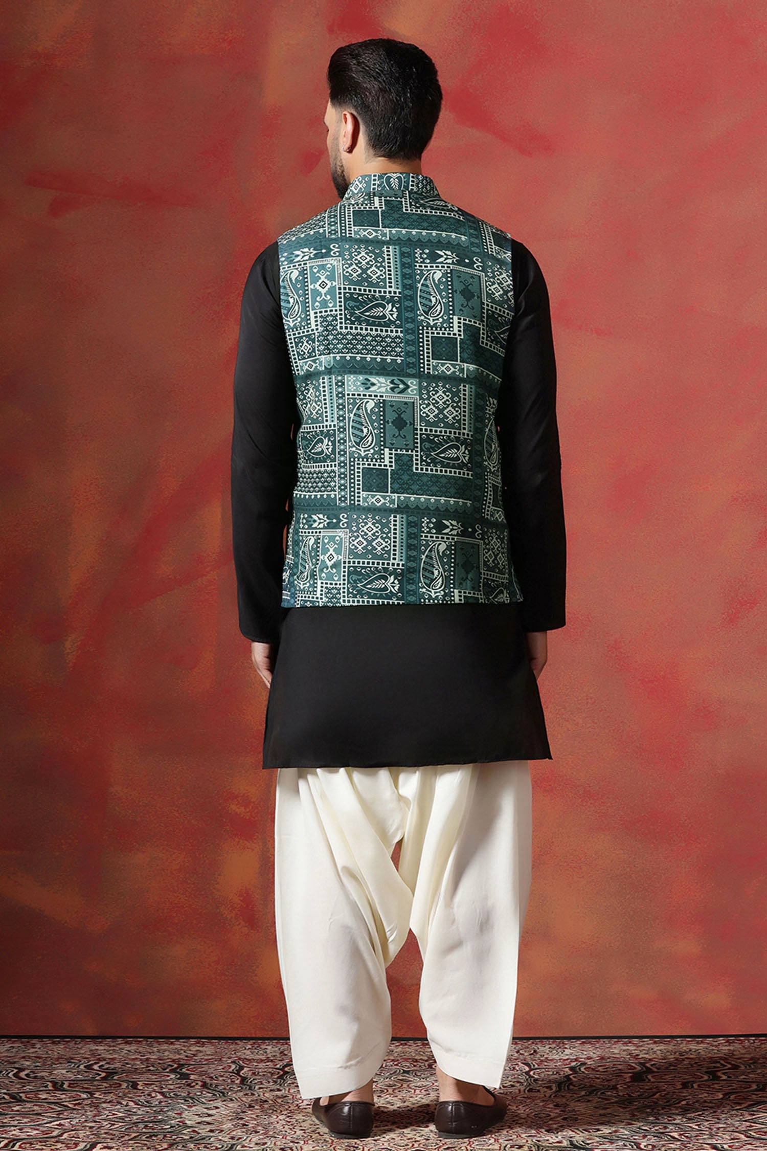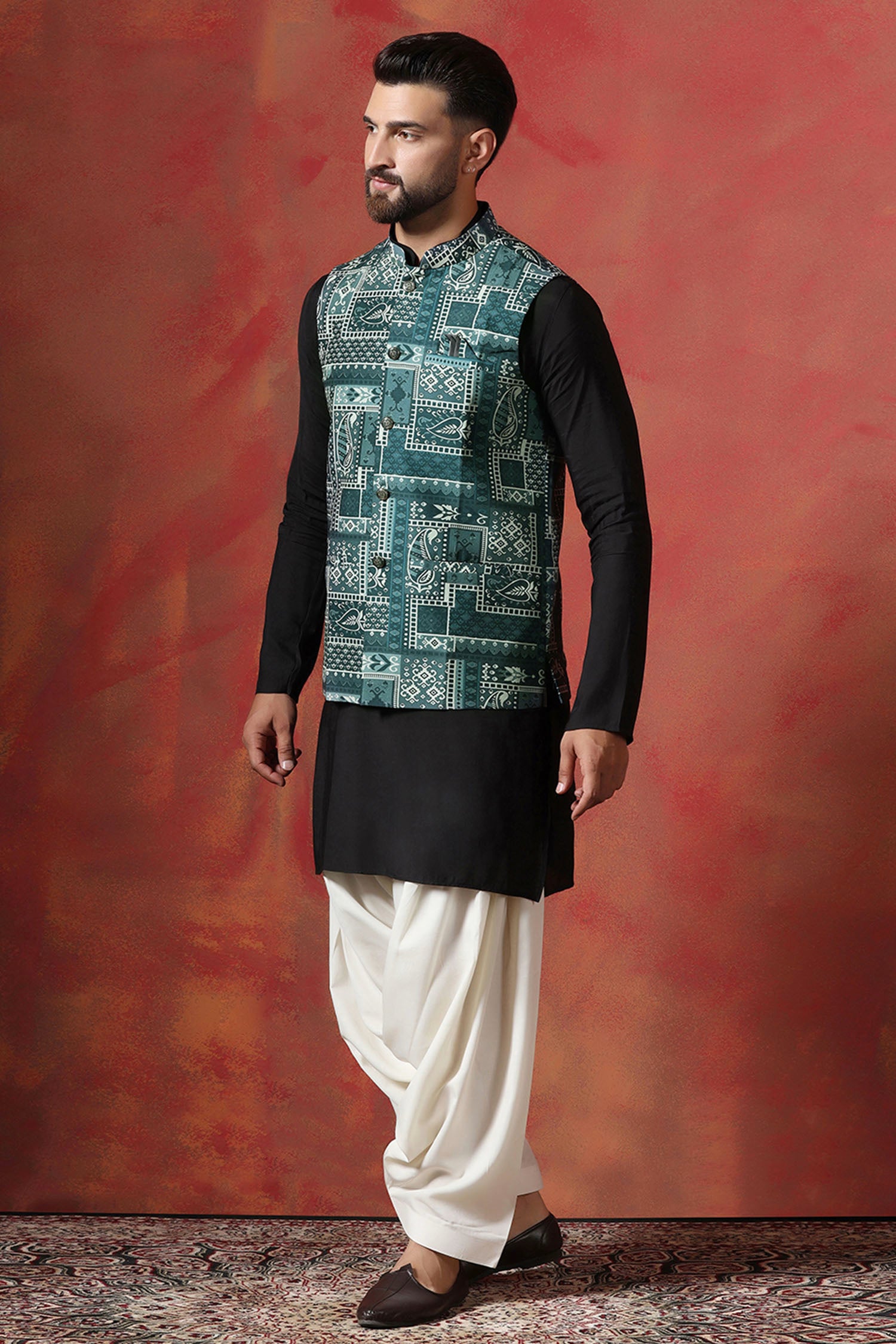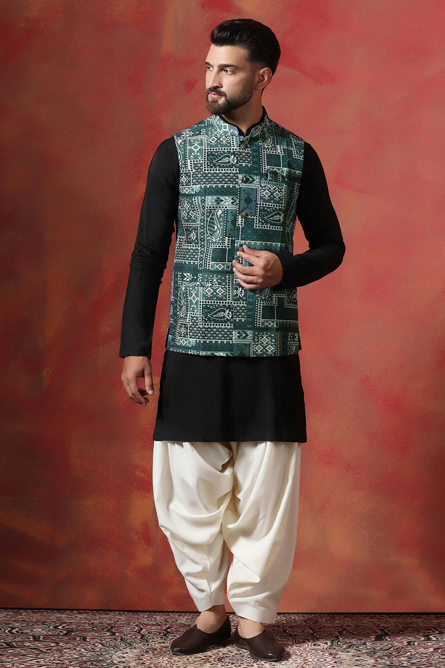 This Solid black cotton blend kurta complemented with nehru jacket features mandarin neckline and sleeveless and white patiala pant look rich and elegant to pair with any outfit