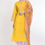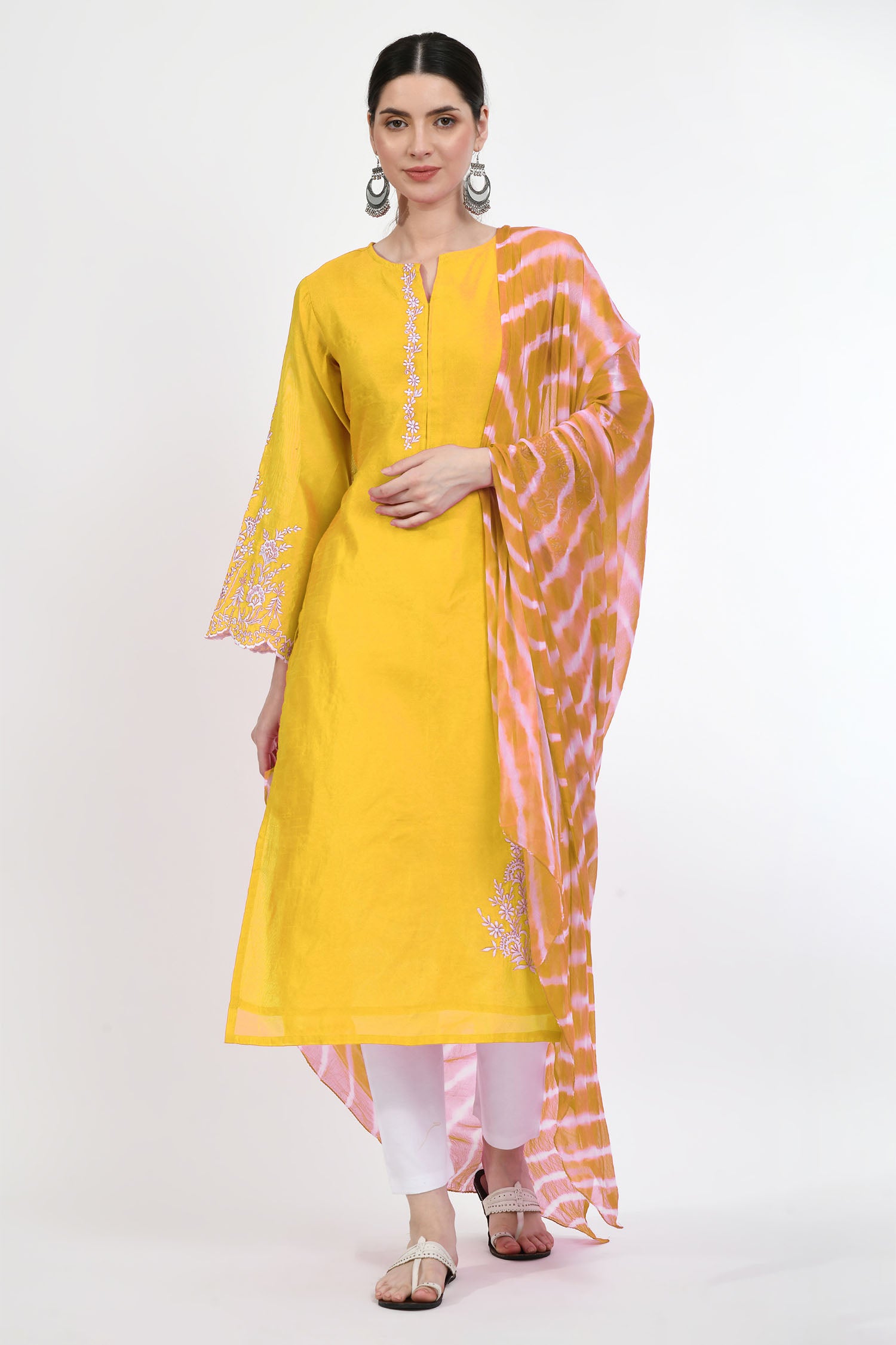 The solid yellow raw silk floral embroidered kurti with pants and dupatta for a neat and elegant look that combines trendy comfort with tradition in a classy appearance.