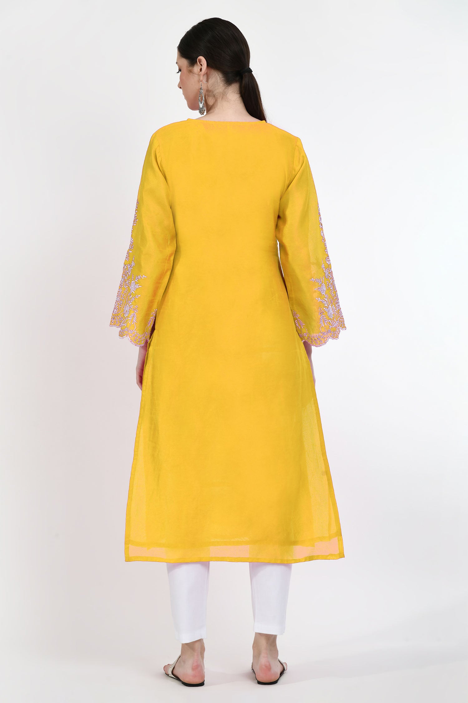 Solid Yellow Raw Silk Floral Embroidered Kurti Set
