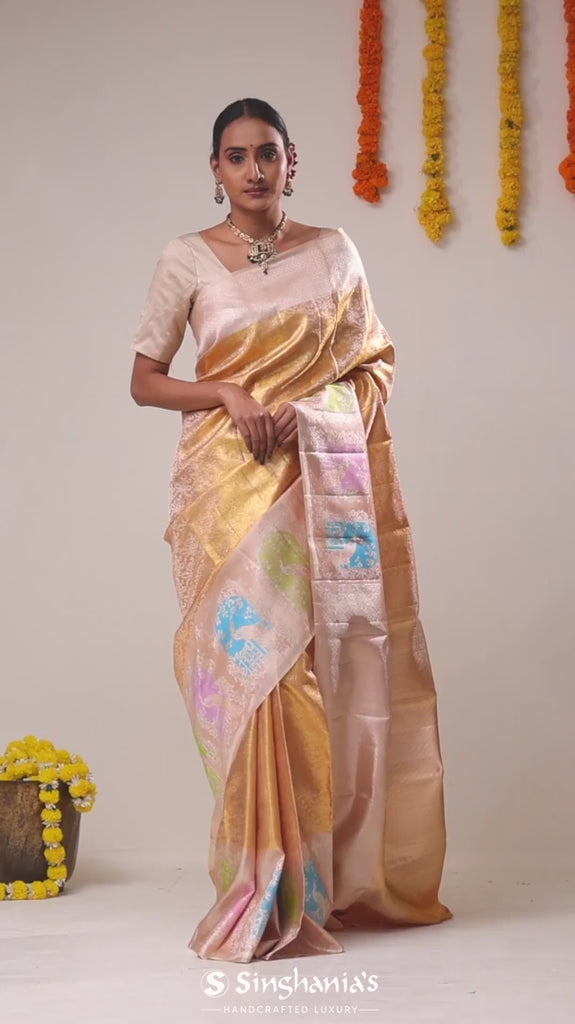 A sunset gold kanjivaram silk saree showcasing floral jaal in contrasting gold zari. The contrasting big border features floral-peacock motifs, while the pallu displays an elaborate arrangement of traditonal motifs. A perfect choice for wedding receptions and formal occasions.
