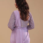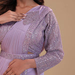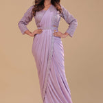 Sunset purple lycra drape saree features mid-forearm sleeves blouse adorned with dense embroidery with subtle sequins along with designer small border making it ideal choice for fancy and festive occasions