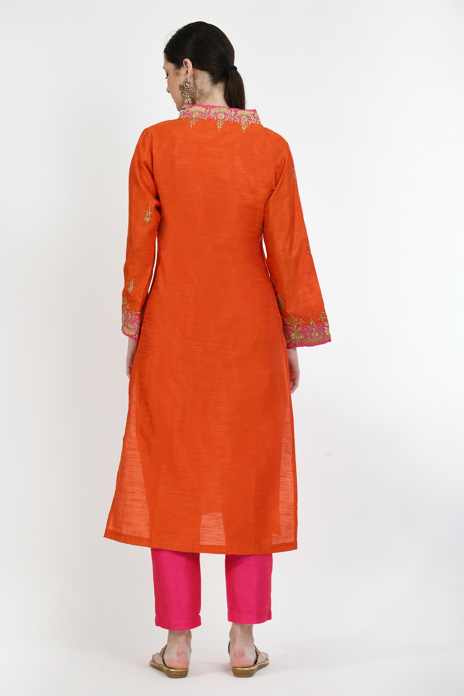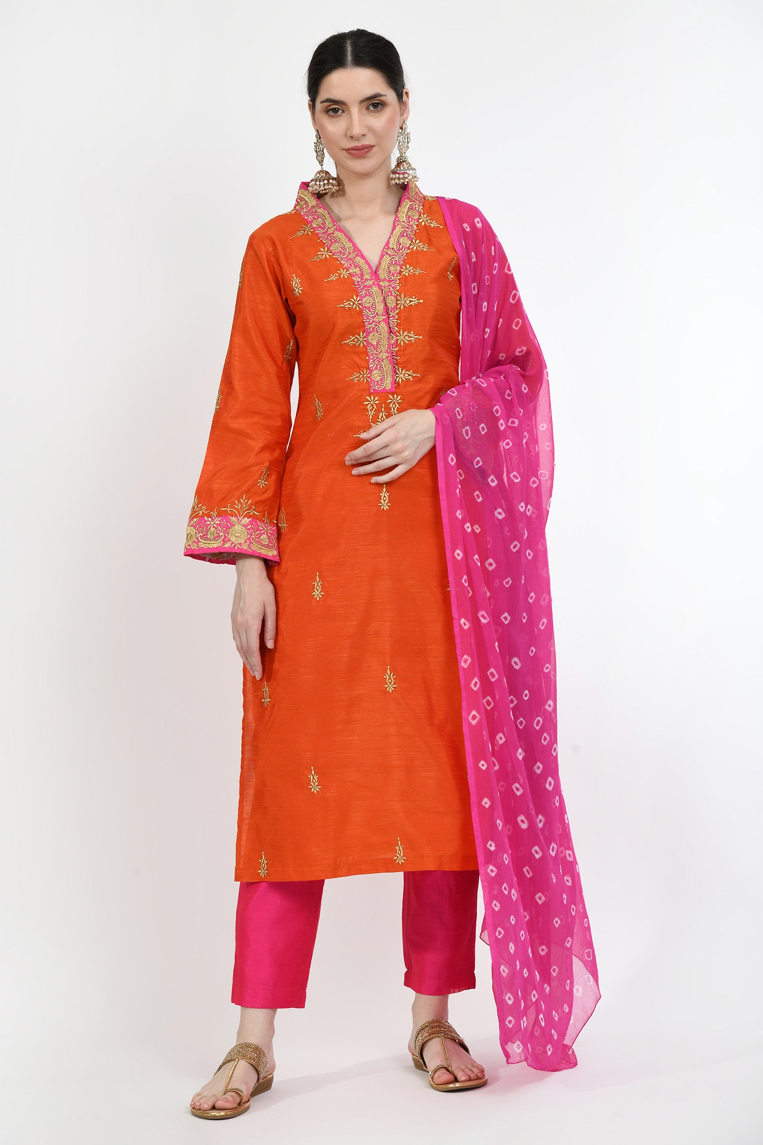 The tangerine orange art silk embroidered kurti set with pink pant and bandhani printed dupatta for a grand look with gorgeous finish combining tradition with charm.