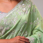 A soothing tea green tissue saree with floral jaal pattern on the body. The pallu and border are embellished with a floral pattern in sequins and glass beads embroidery, which accentuates the whole look. Suitable for festive wear and wedding parties.