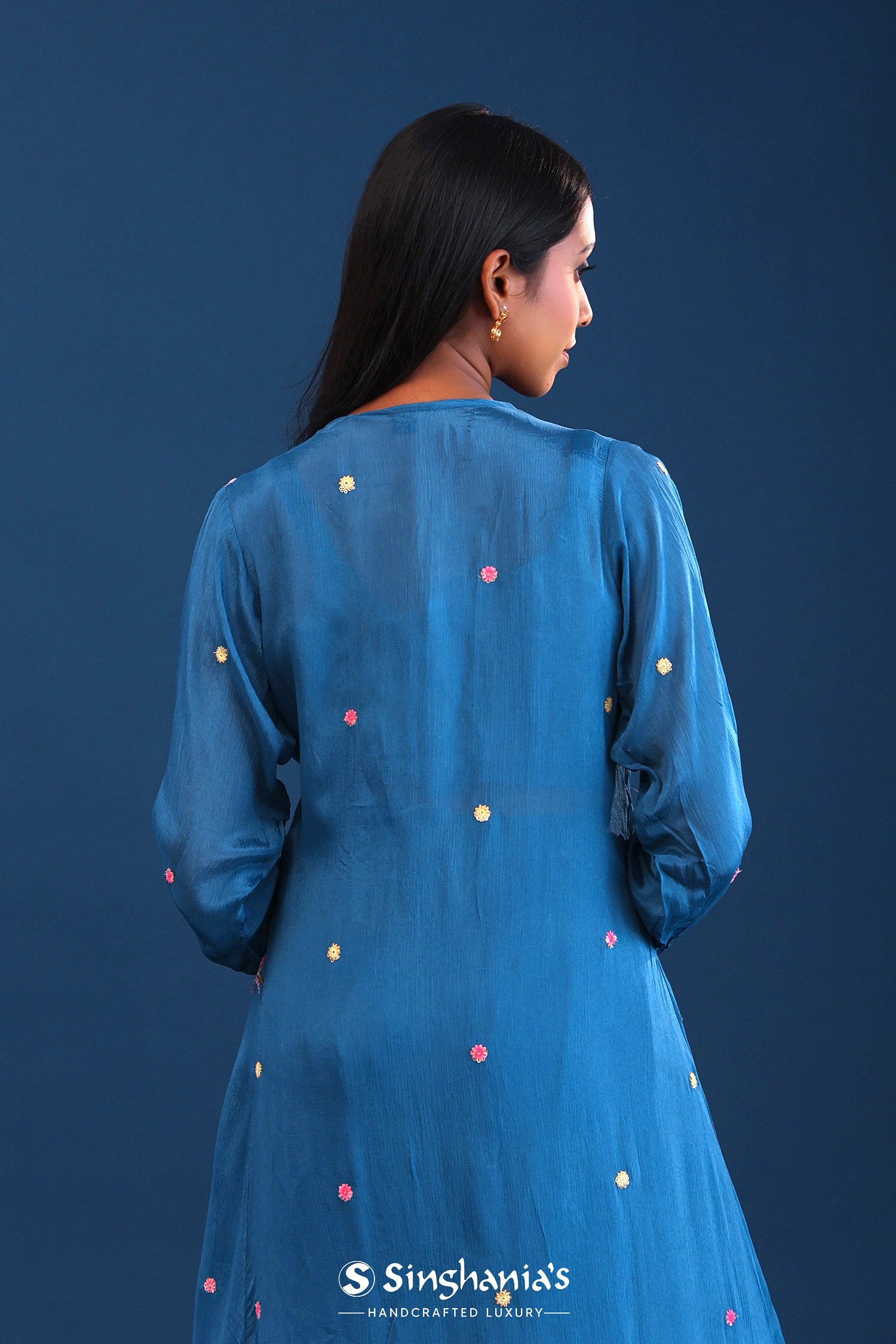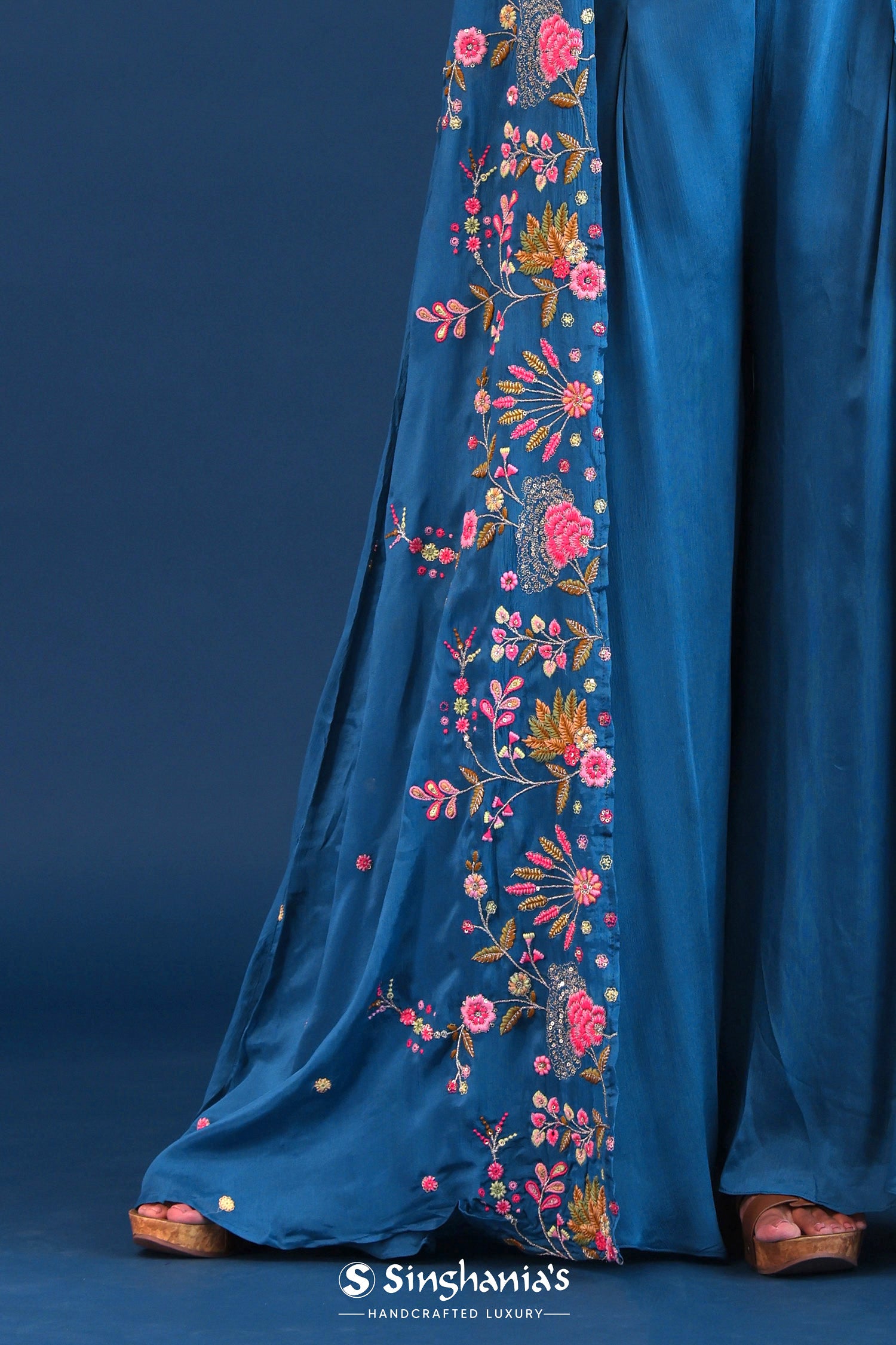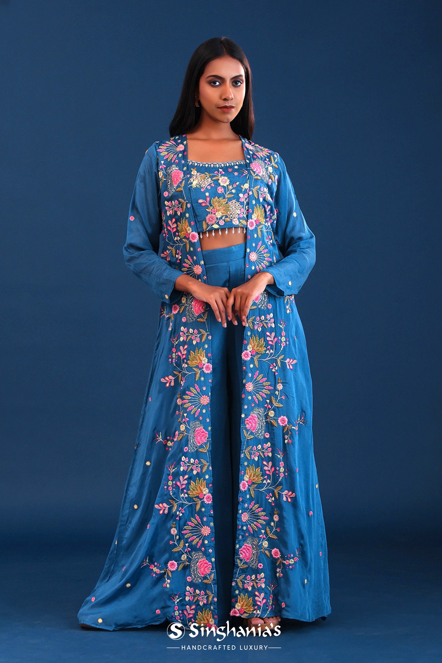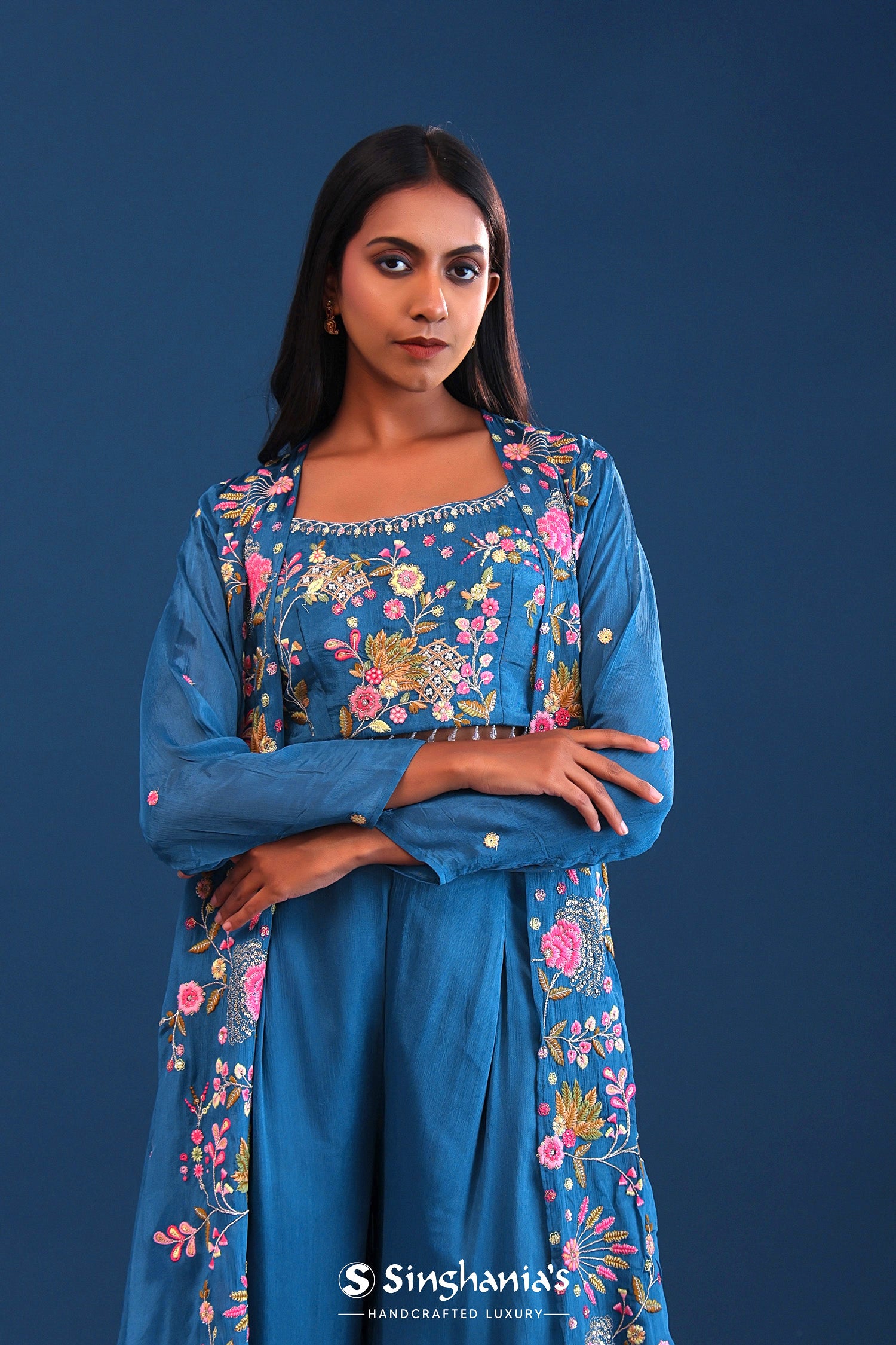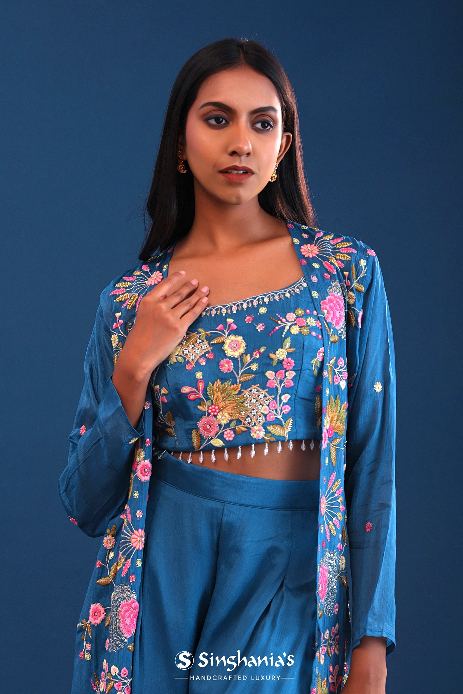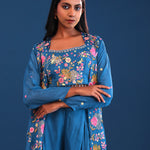 The teal blue crepe silk thread work indo western choli set with chinon silk jacket for a perfect blend of tradition with style.