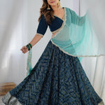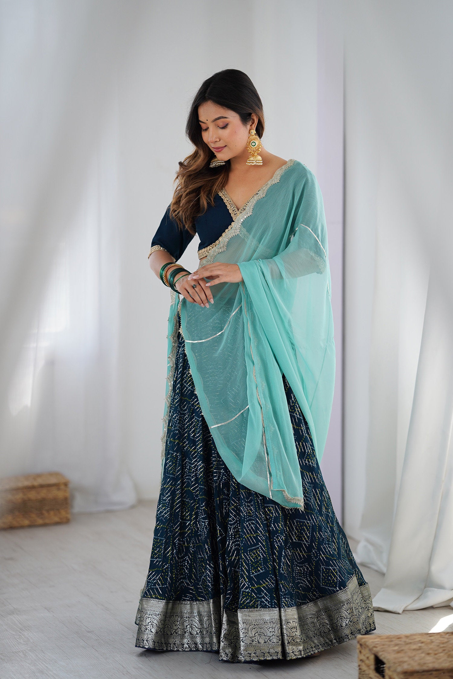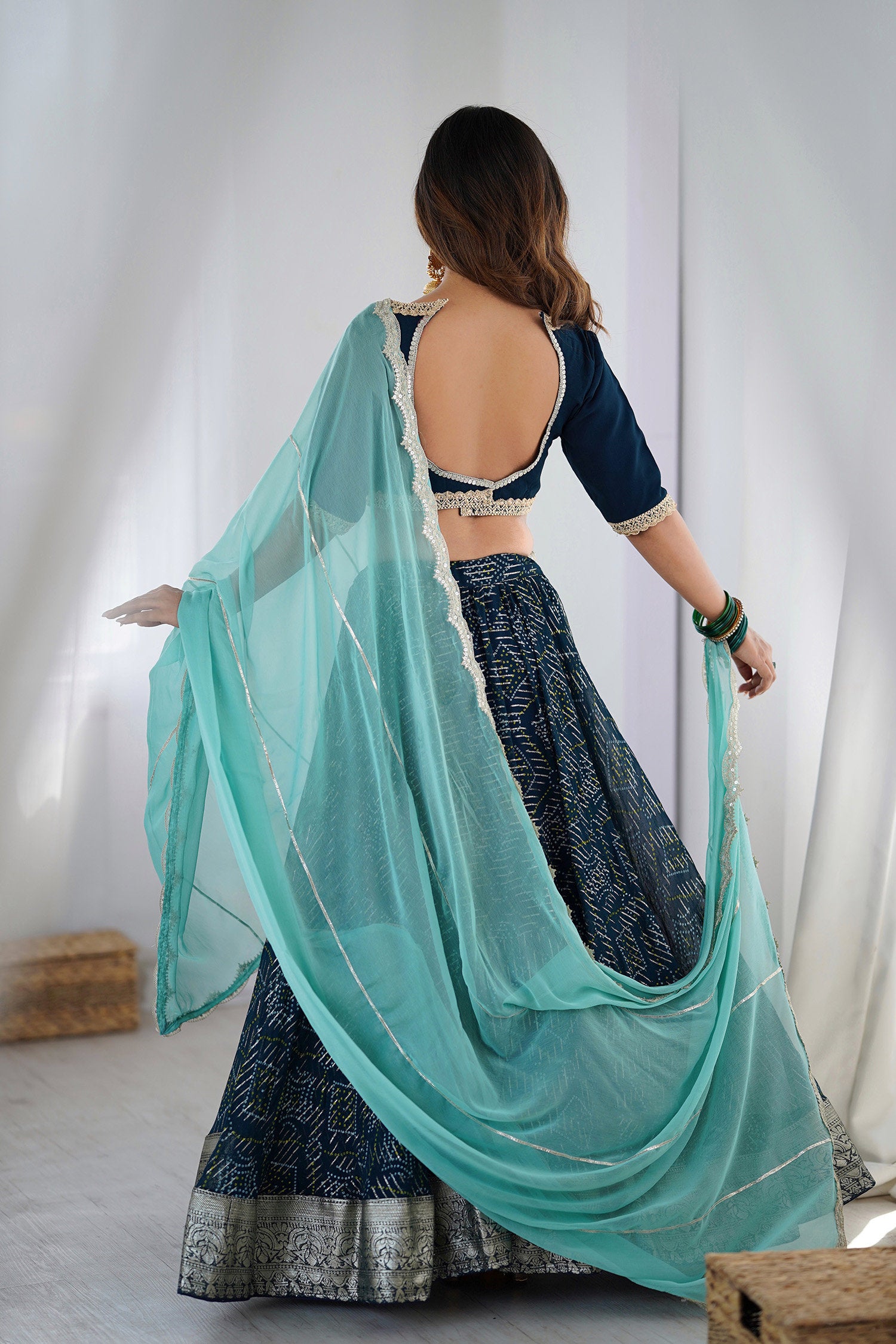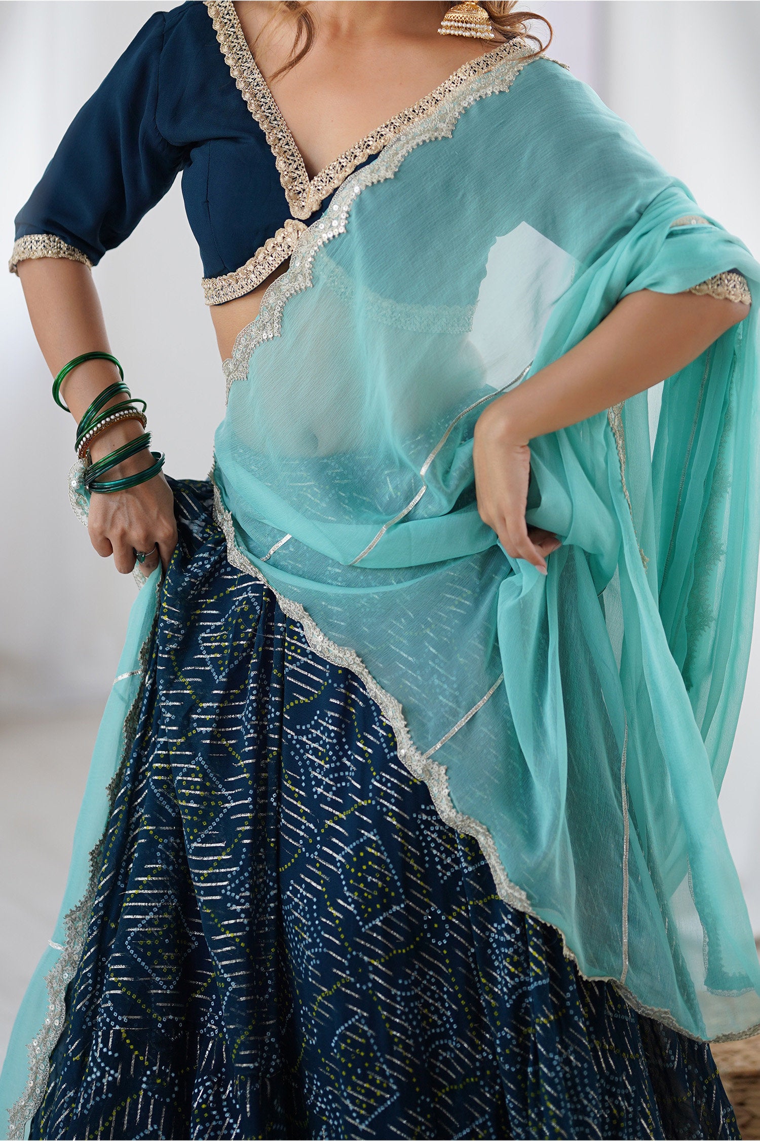 The teal blue floral bandhani flared lehenga set with lace work blouse and a matching dupatta for a majestic look and elegance in every twirl.