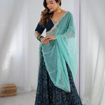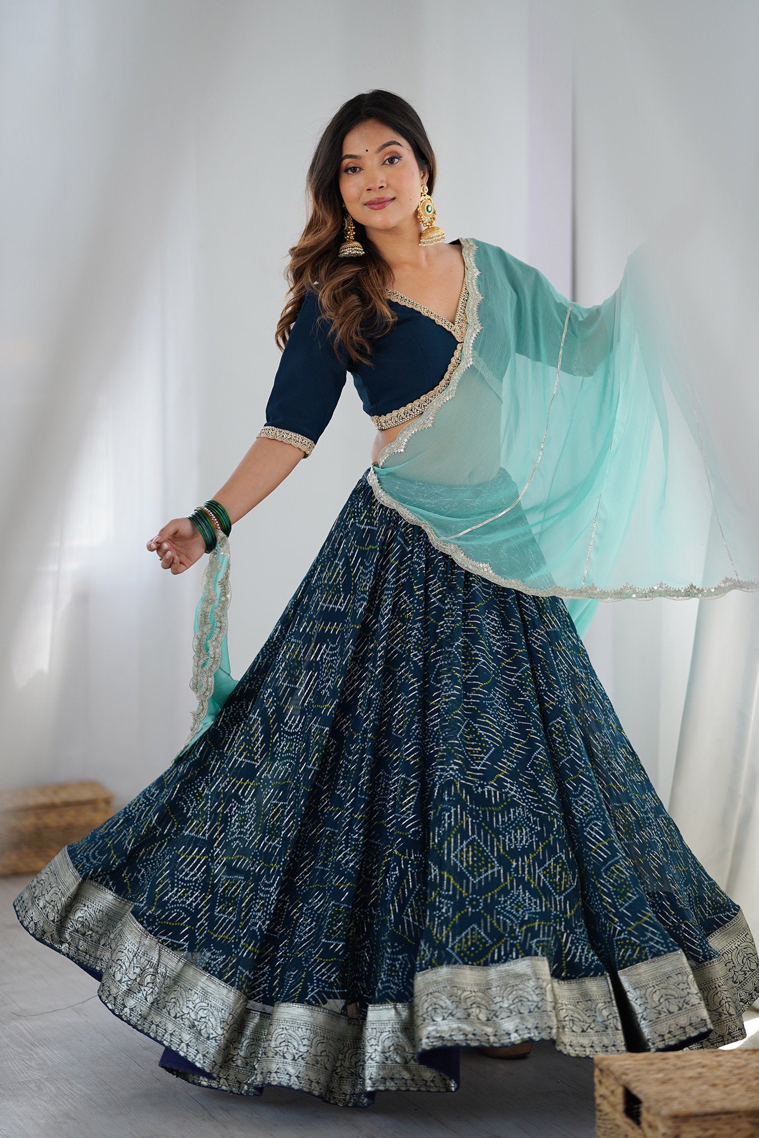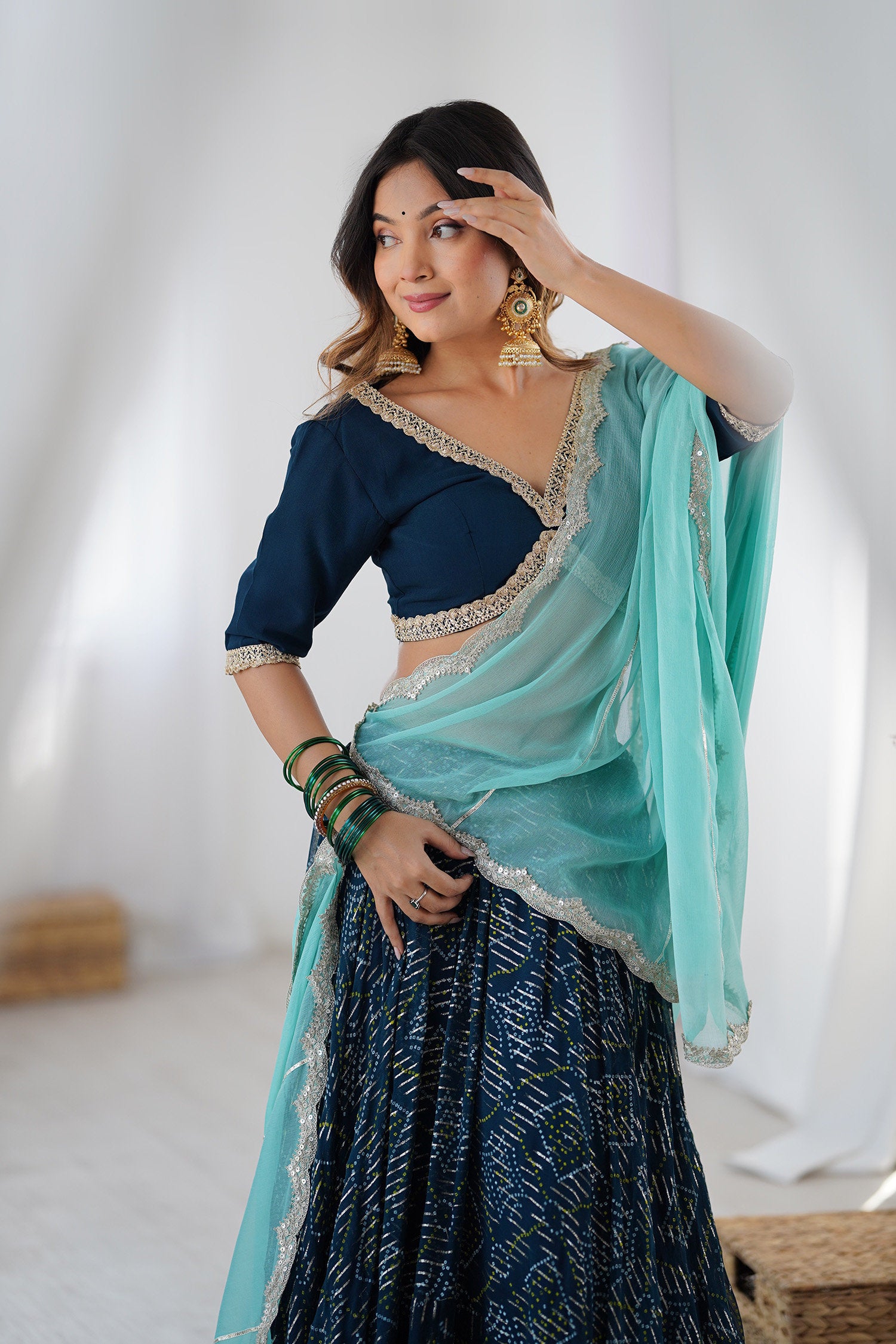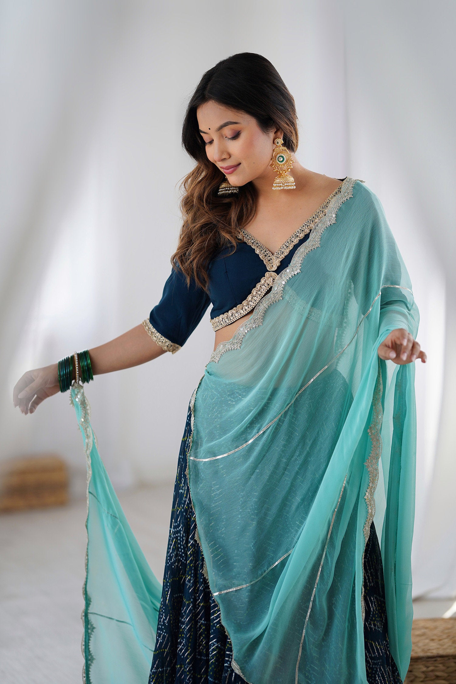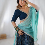 The teal blue floral bandhani flared lehenga set with lace work blouse and a matching dupatta for a majestic look and elegance in every twirl.