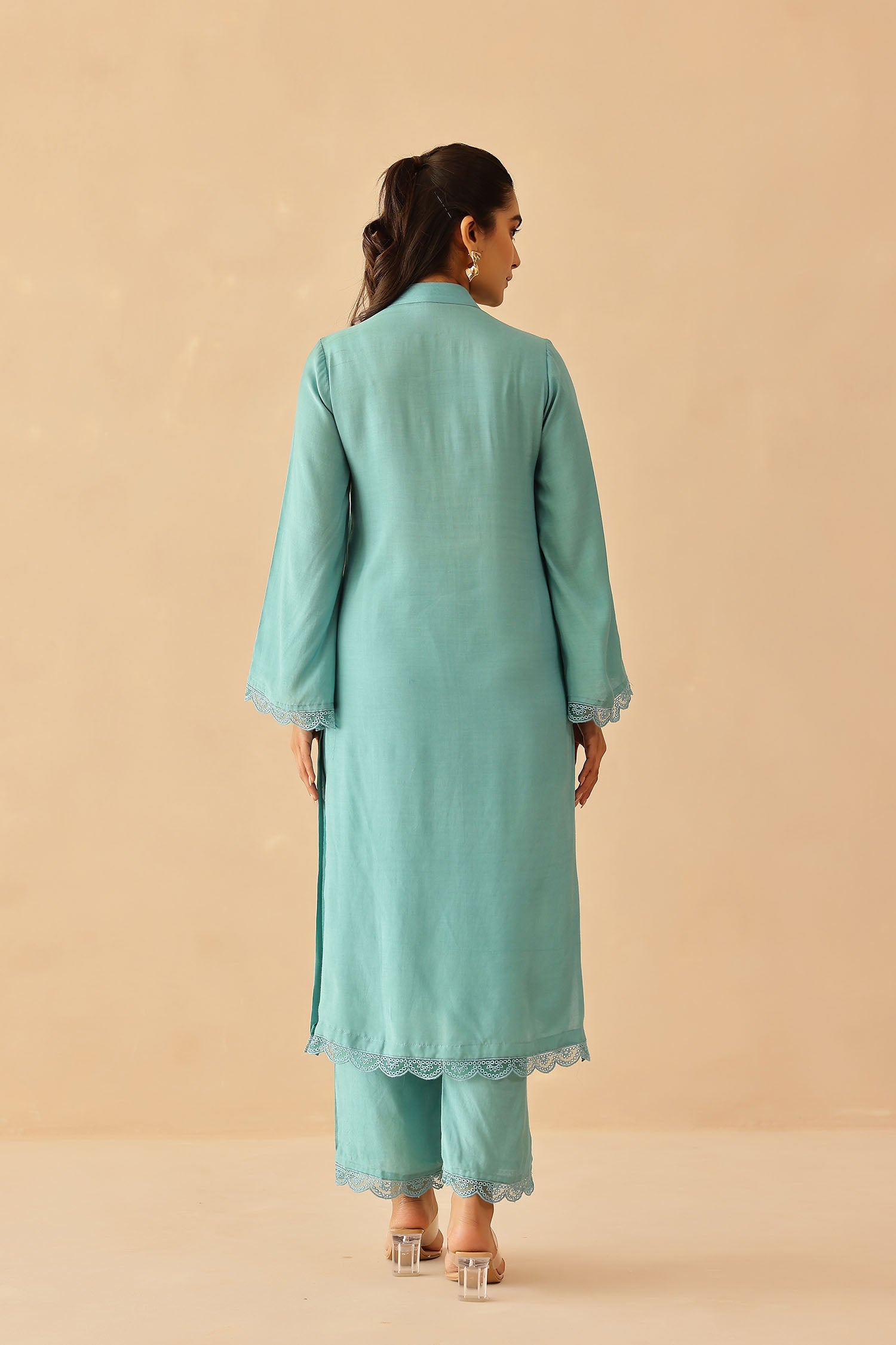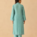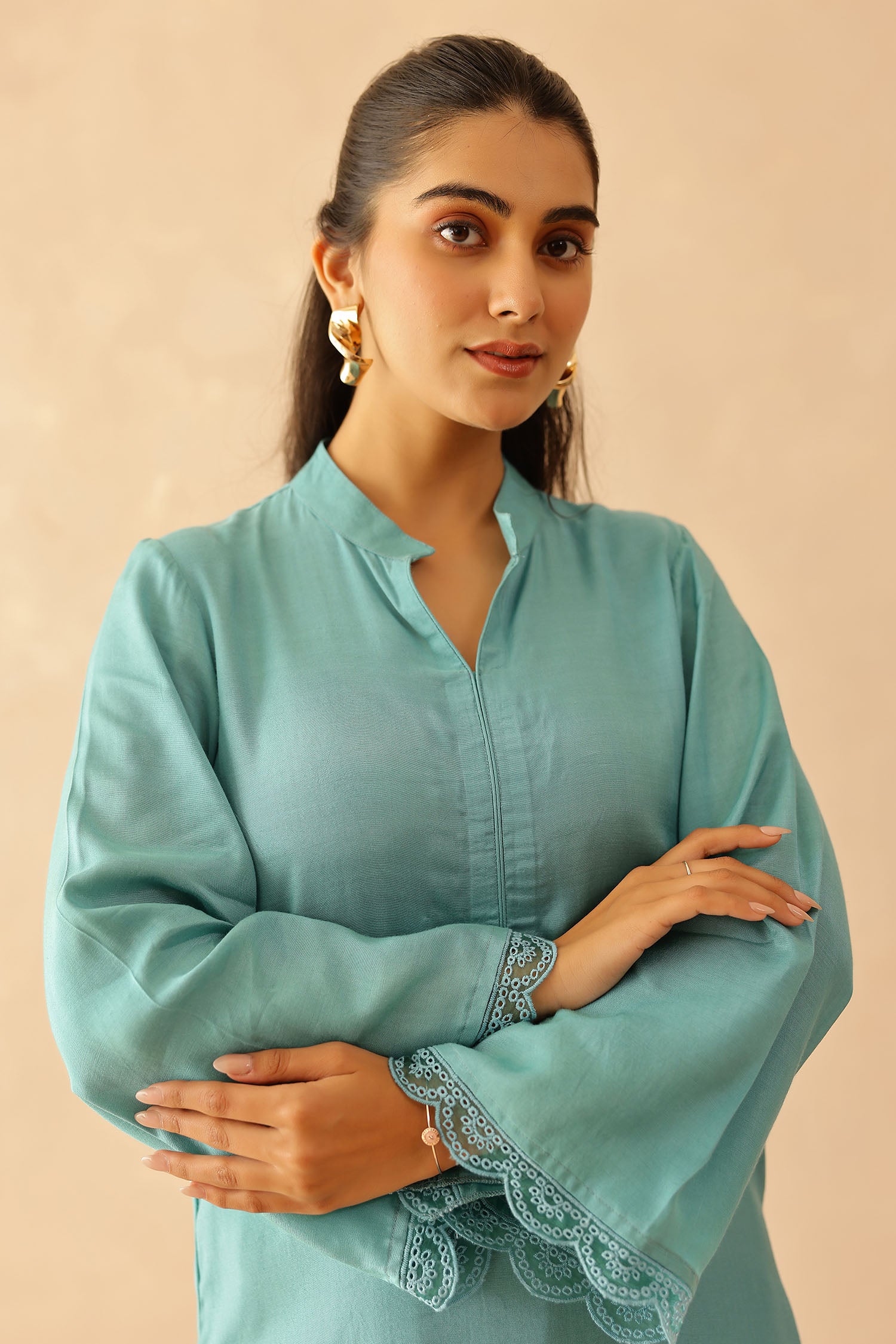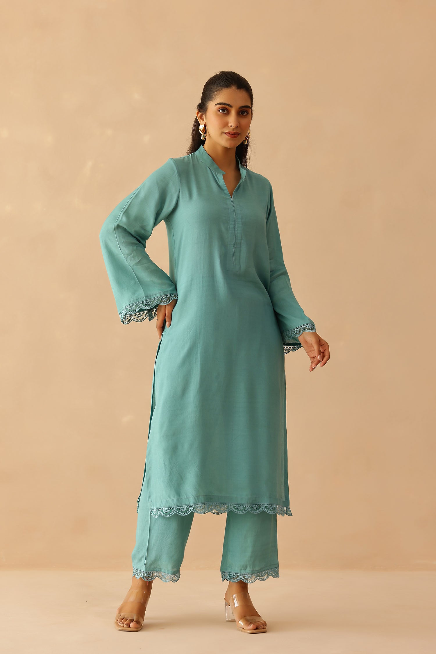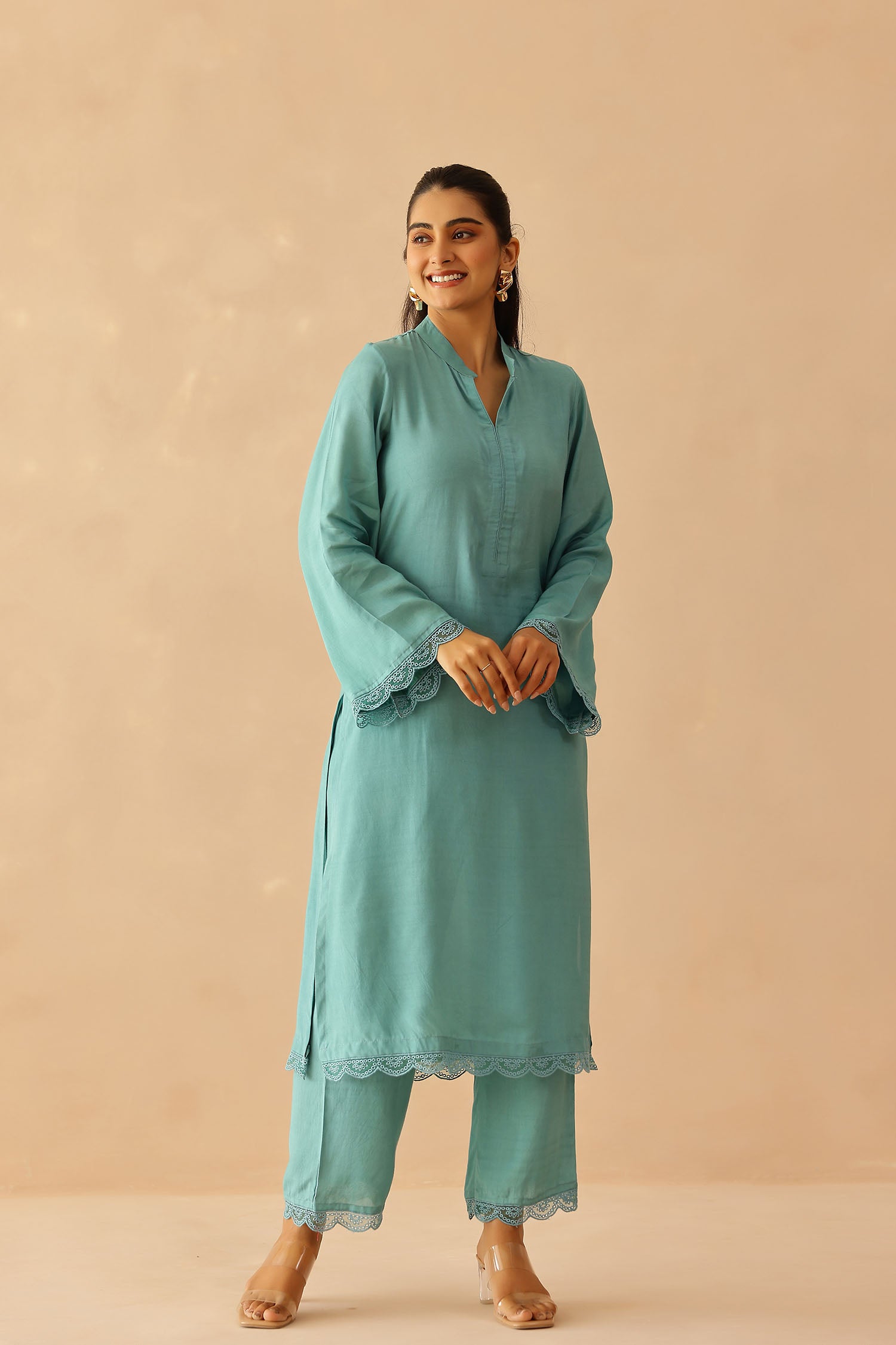 The teal green cotton santoon solid kurti set with matching pant for a perfect blend of tradition with style for an elegant look.