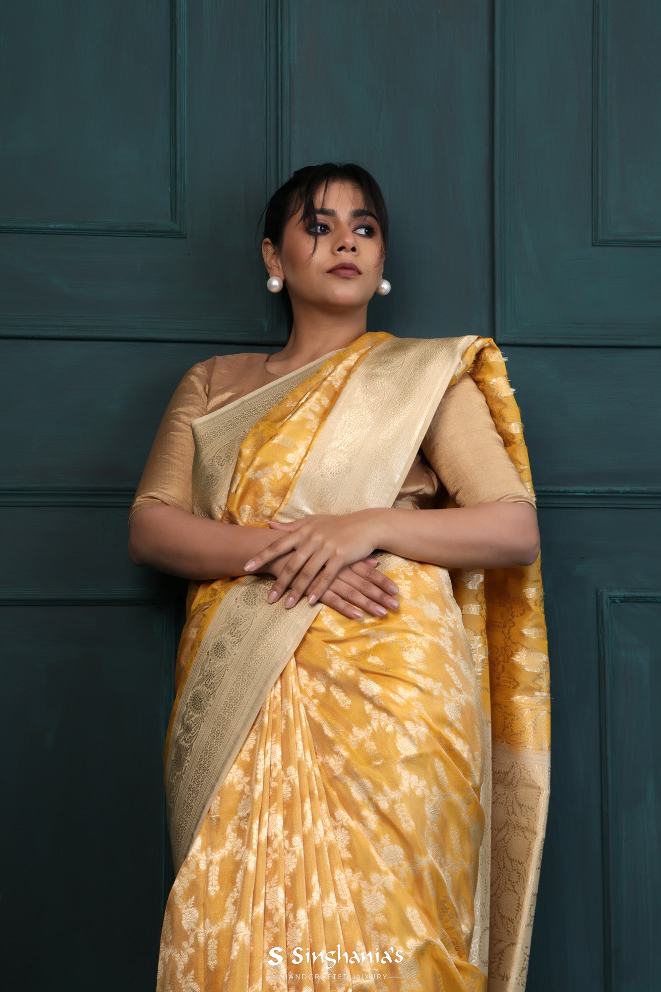 Gold Banarasi Silk Saree With Floral Jaal