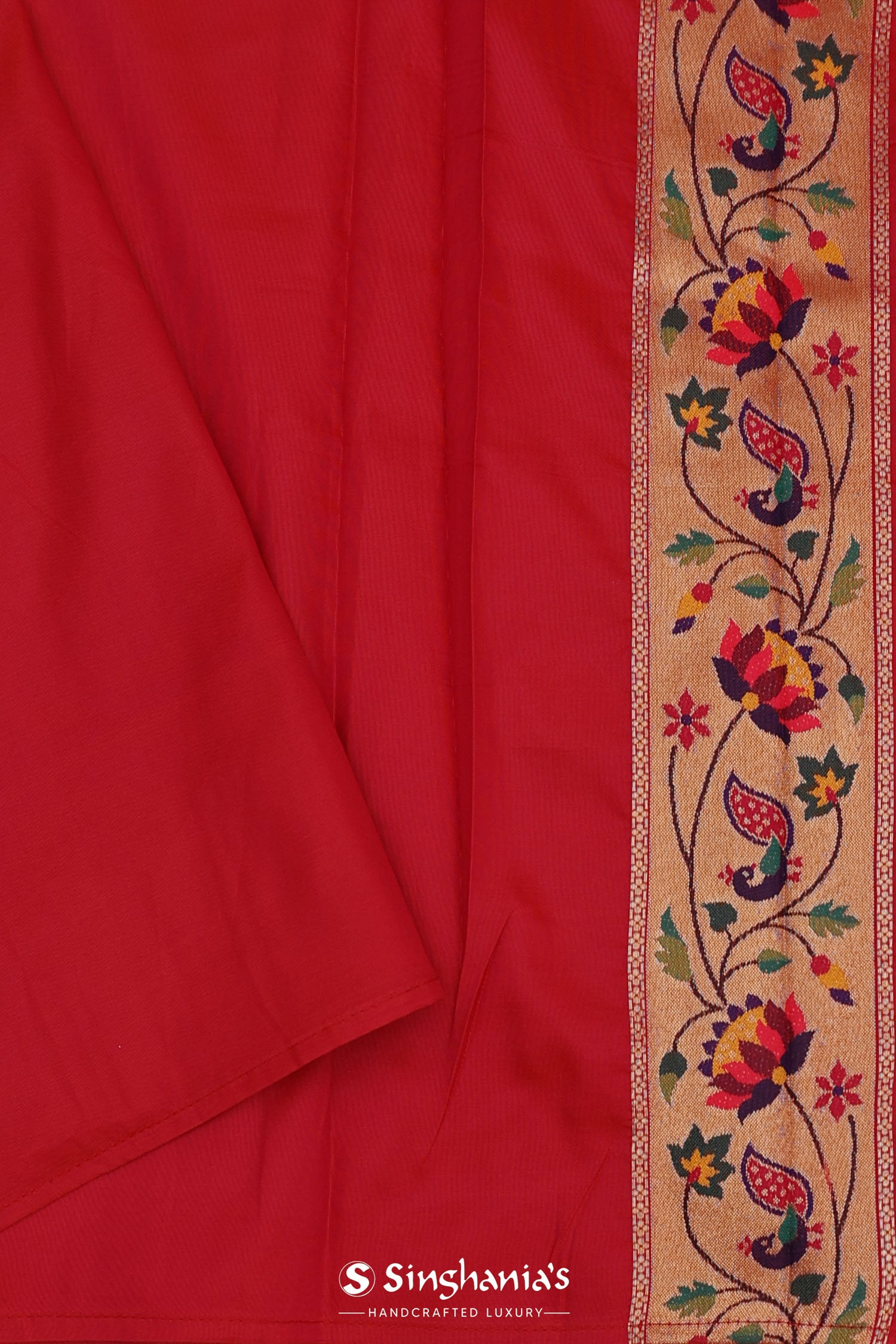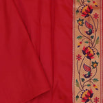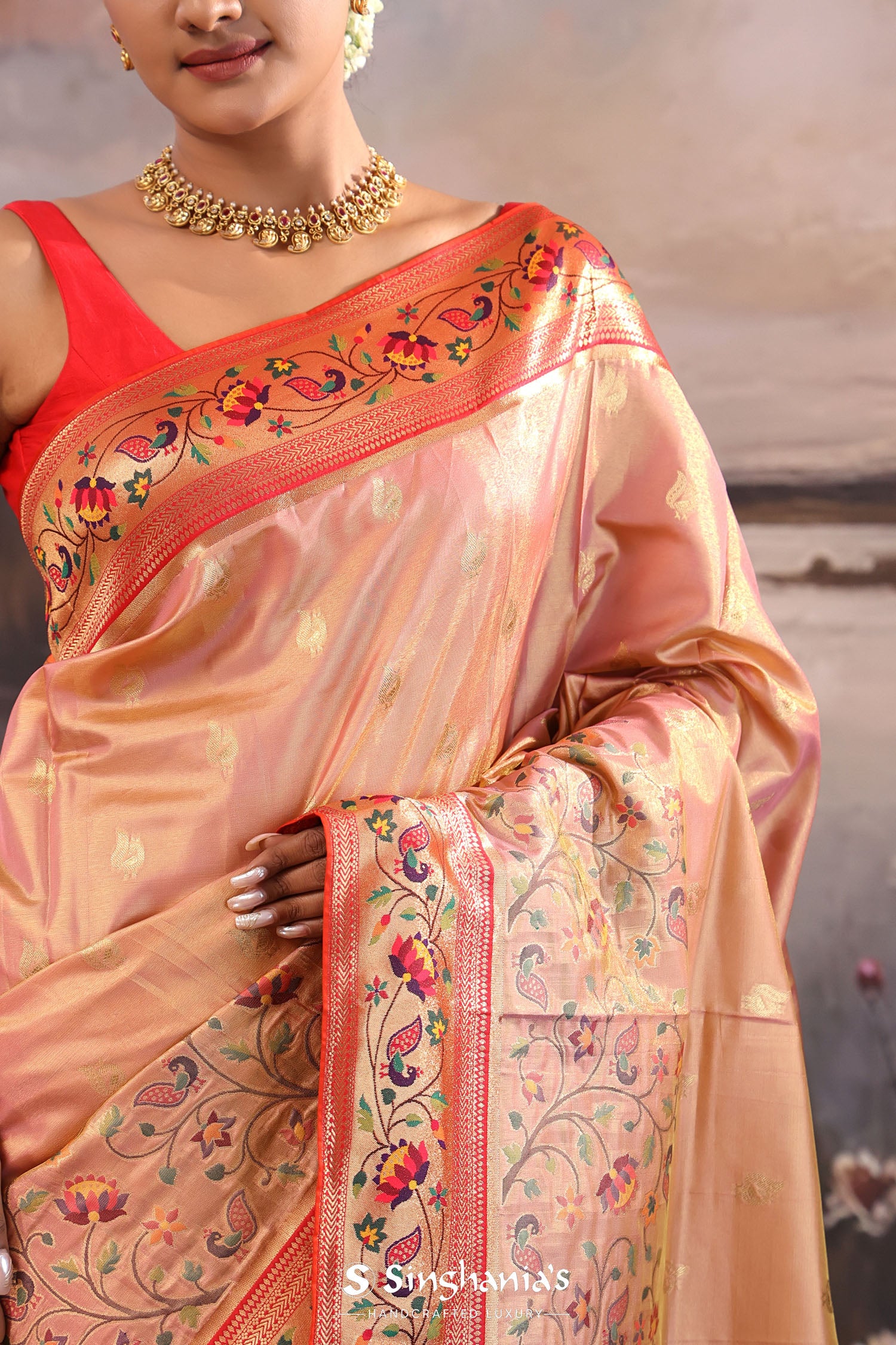 The butti's woven with gold zari scattered on body of Turkish pink paithani tissue saree complemented with contrast red paithani border along with floral design which is adding the charm to overall look.