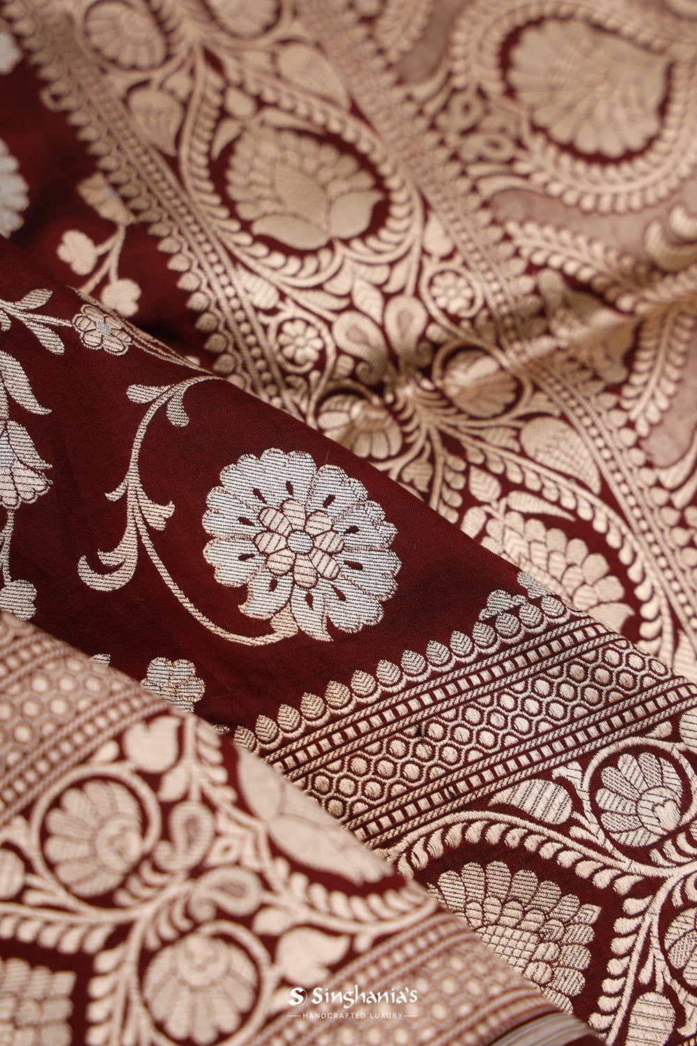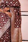 A tyrian purple banarasi silk saree featuring silver and gold zari floral weaving all over. The border has a floral creeper design, and the pallu features floral buttas in jaal pattern, completing the traditional, elegant look.