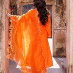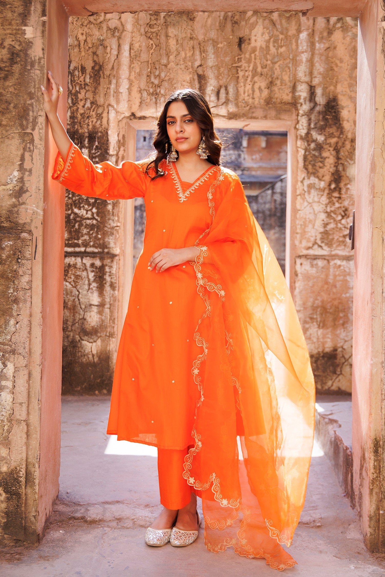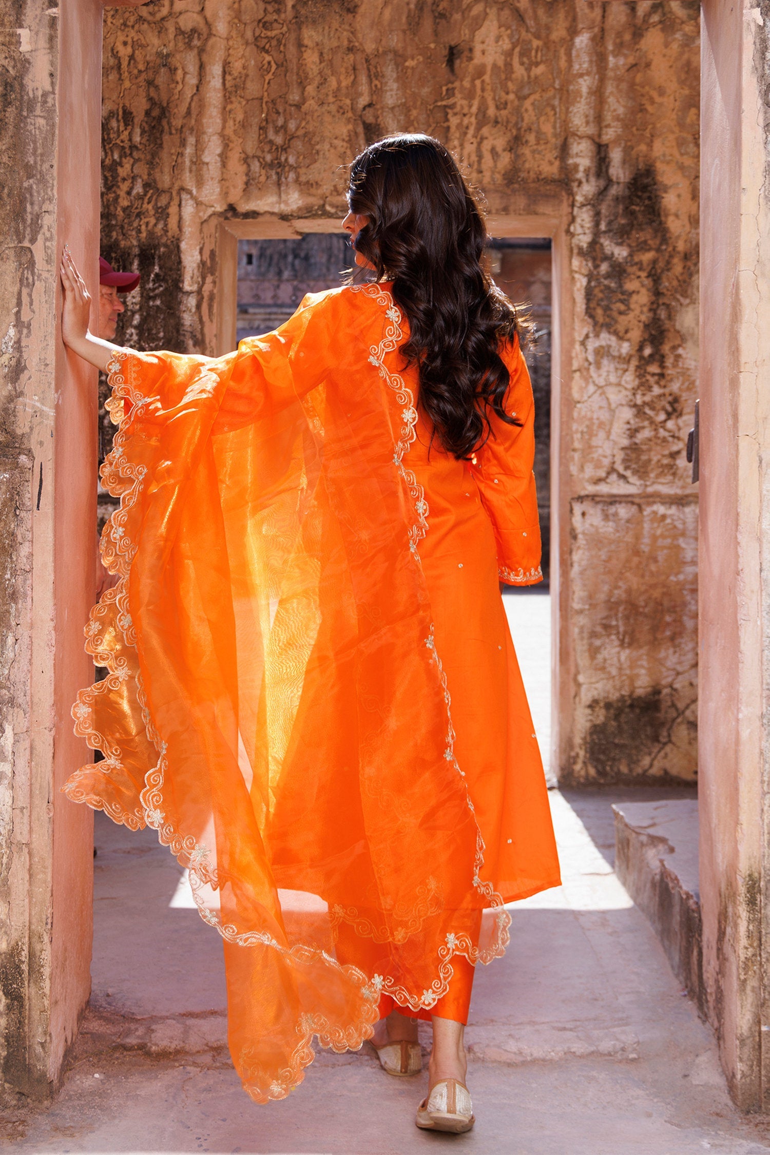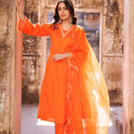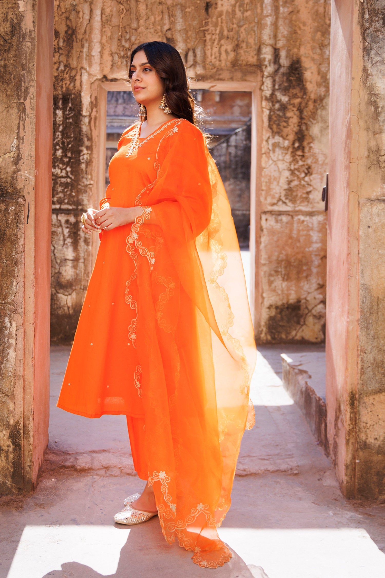 Vibrant Orange Cotton Kurta Set With Organza Dupatta