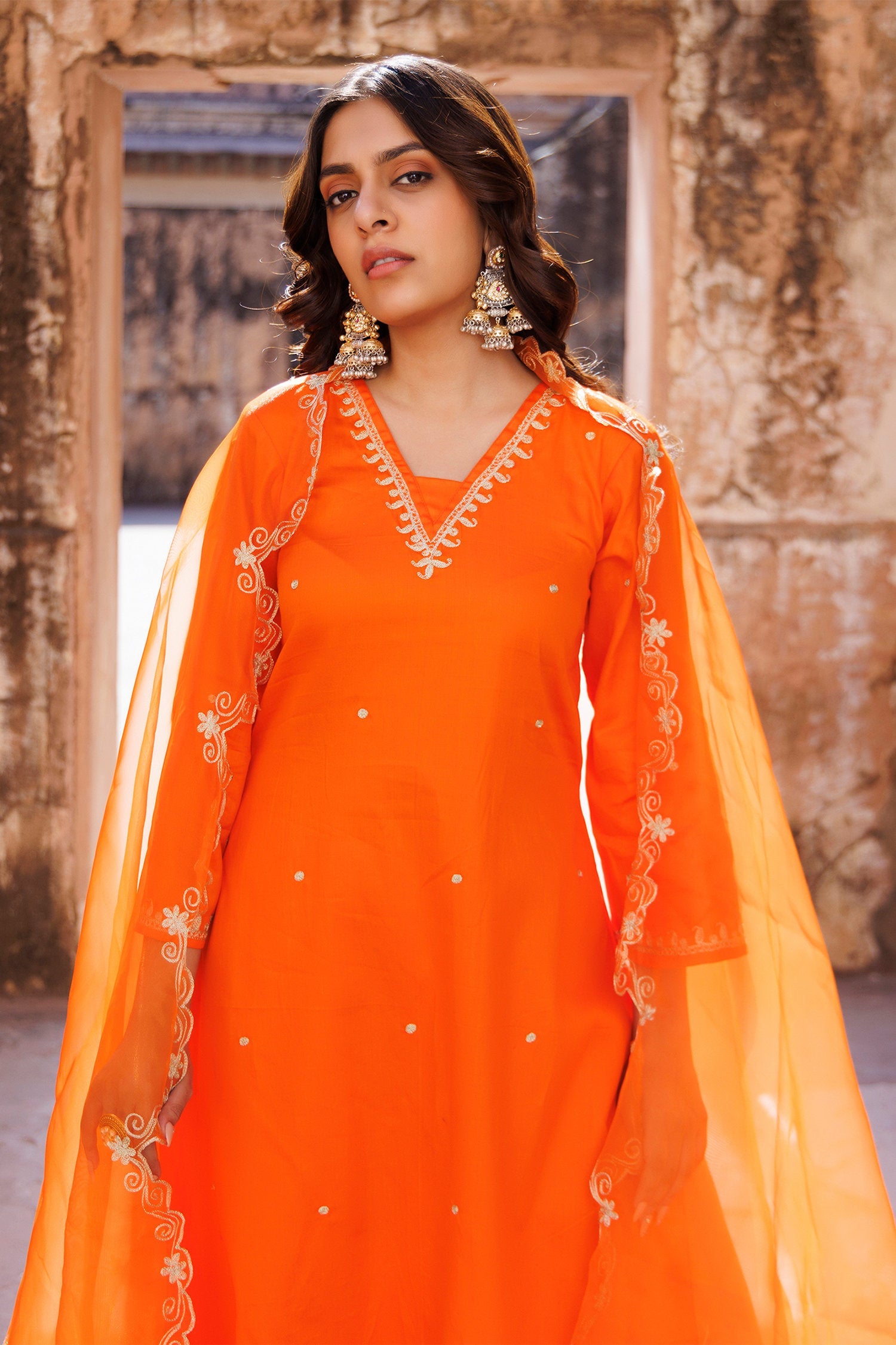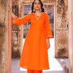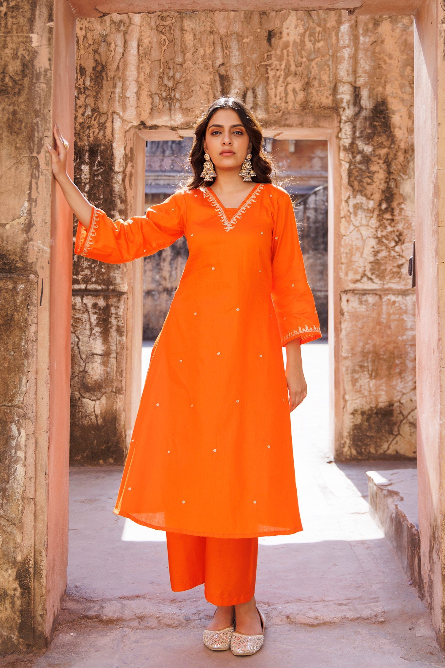 This Vibrant orange cotton kurta set features V neckline and mid-forearm sleeves complemented with matching straight pants which is perfect for any traditional occasions.